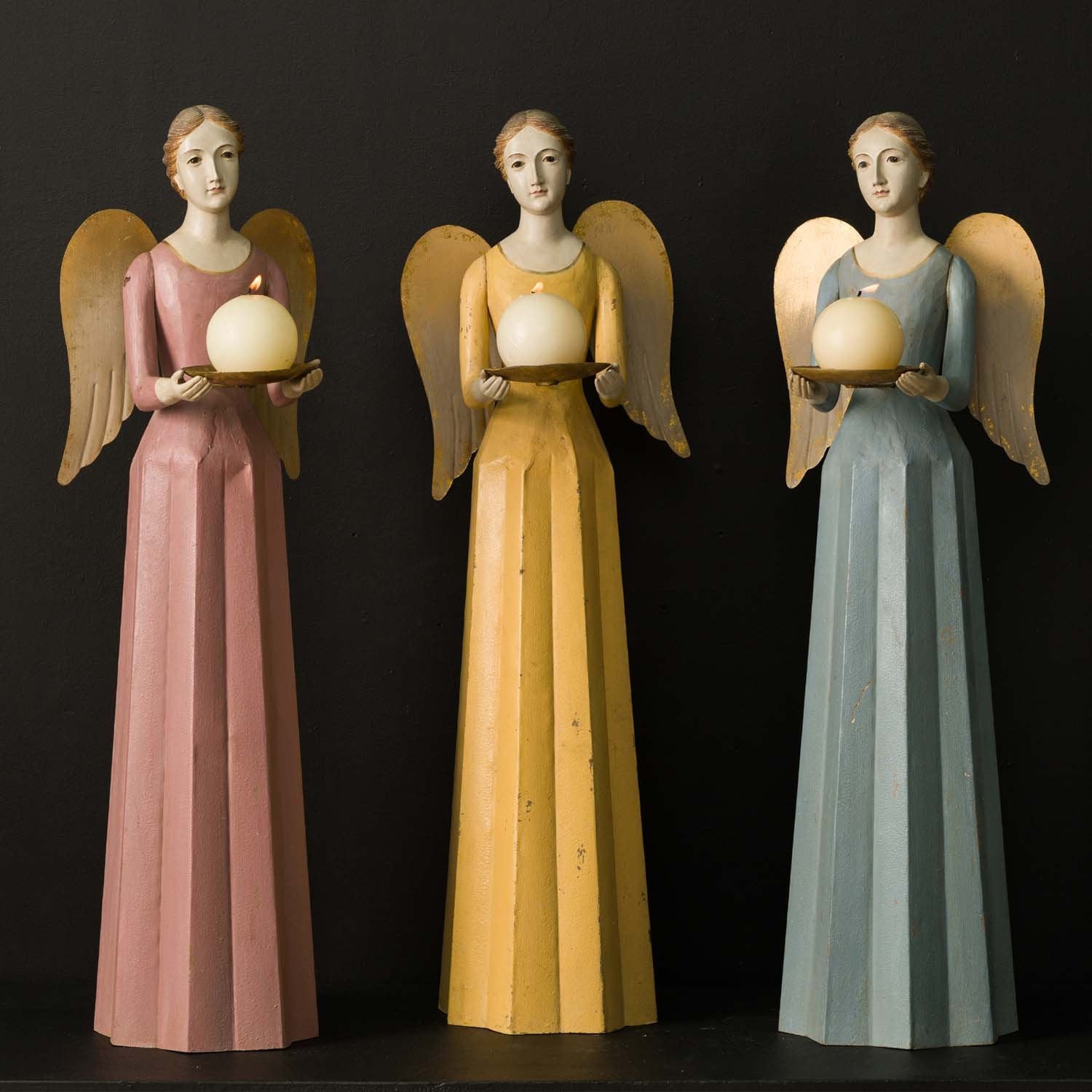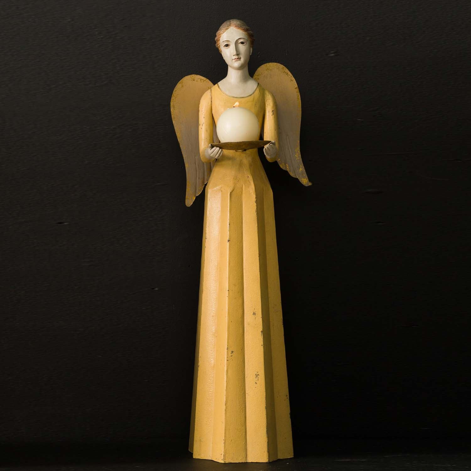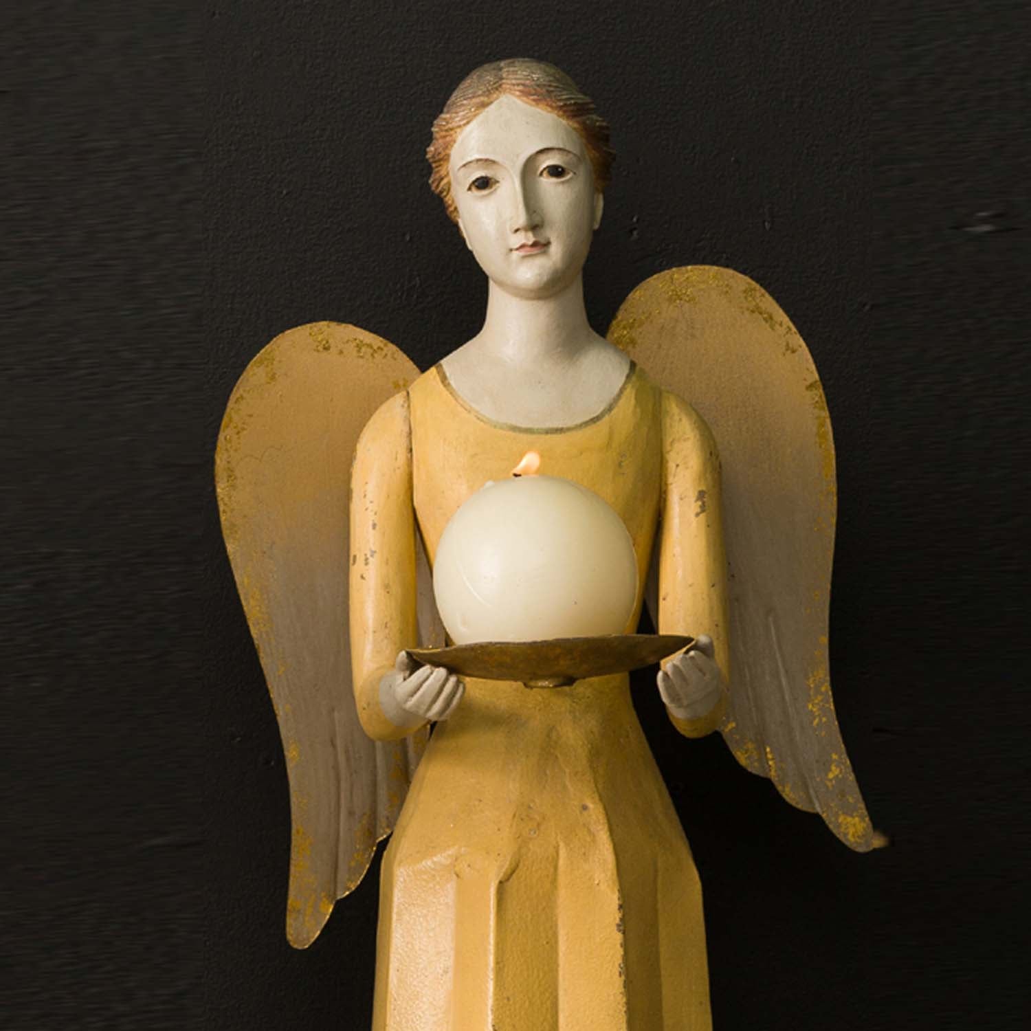 Bring some serenity and light into your home with this decorative candle holder.  Our Angel Marie was inspired by french statuary from the 18th century.  Her face and hands are hand painted in an ivory finish and her skirt and wings are hand tooled metal.
