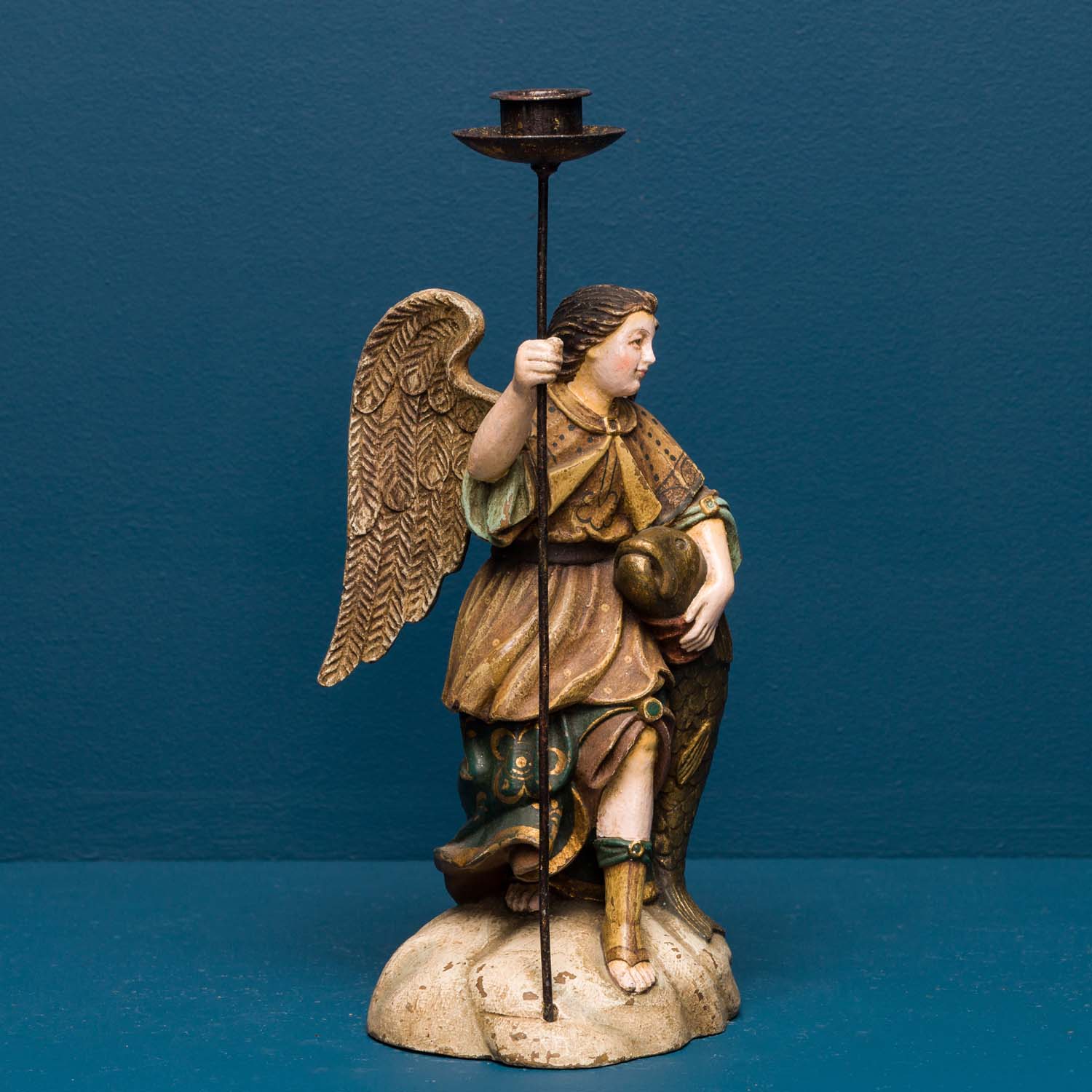 Our South American angels series is based on the Roman Catholic artistic tradition developed in Cusco, Peru during the 16th through 18th centuries. Each of the objects in this collection is inspired by the lush detailing of these Colonial era paintings. Our Angel Raphael is an impressive decorative piece that can also be used to hold a taper candle.