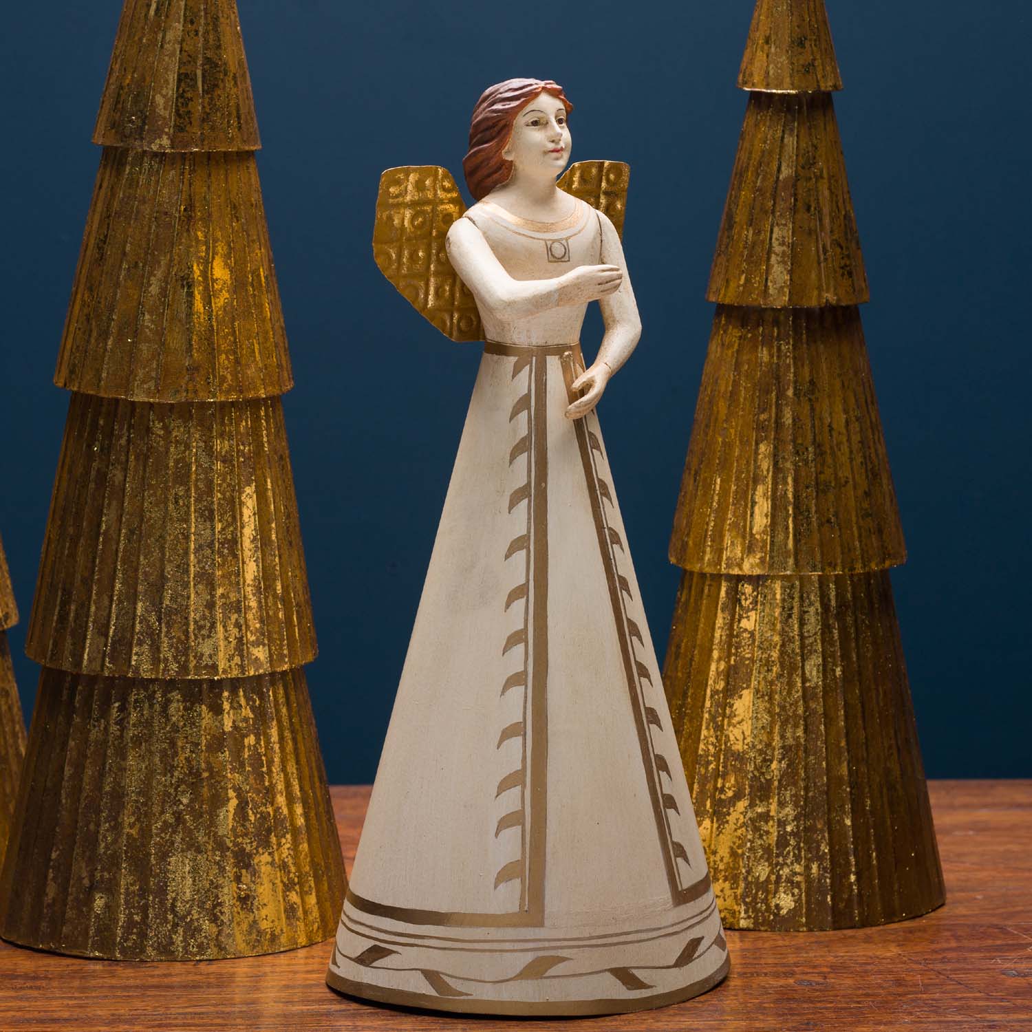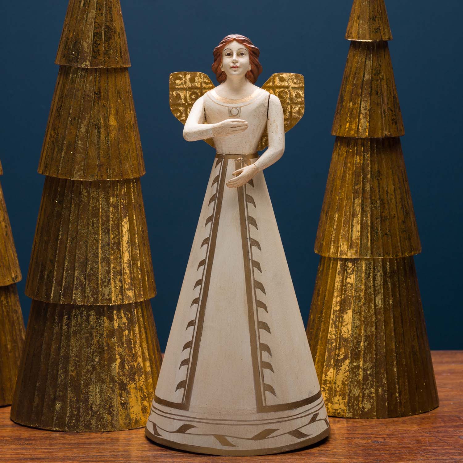 The Vienna Carmela Angel will bring an elegant touch to your holiday decor. Each angel has a metal skirt with hand-painted geometric detail and textured tole metal wings for a graceful, one-of-a-kind look. Perfect for any festive display.