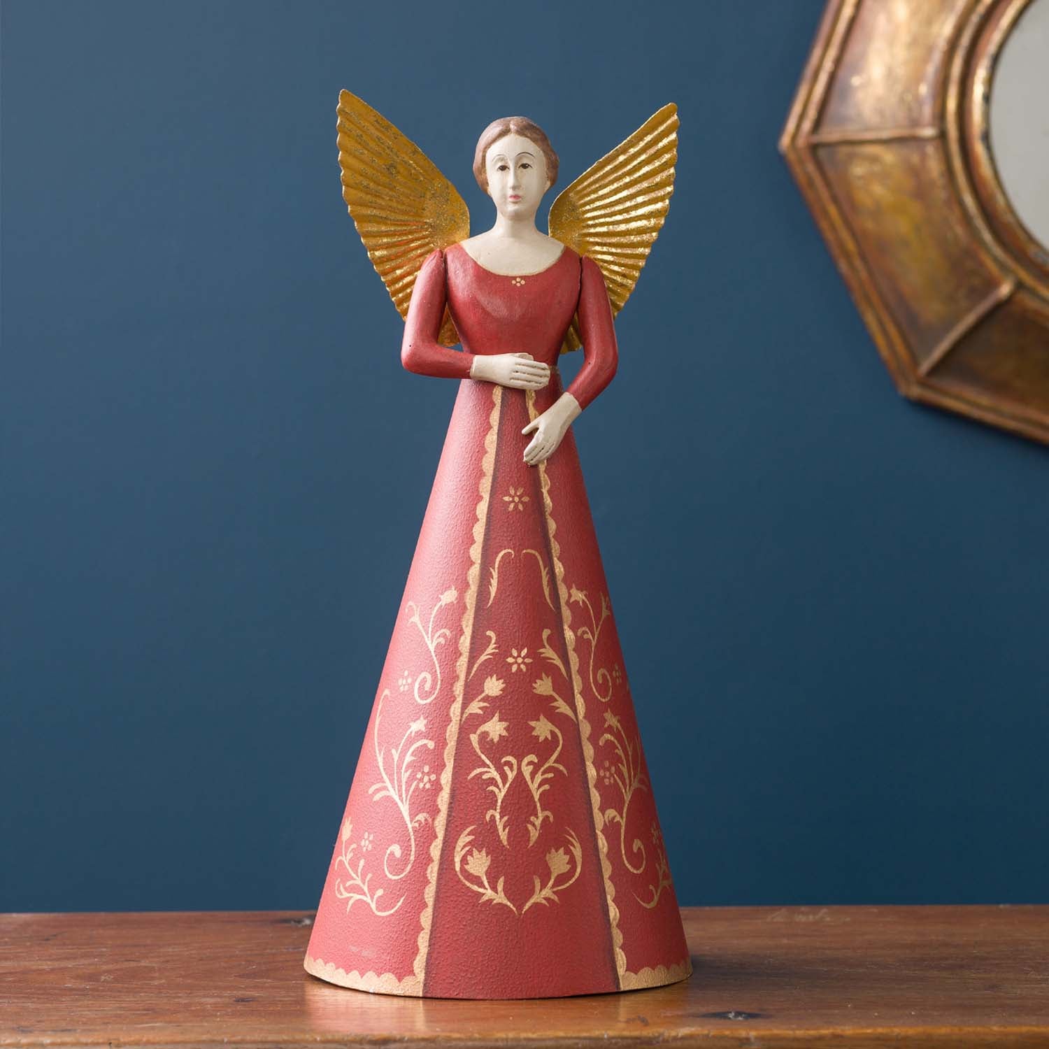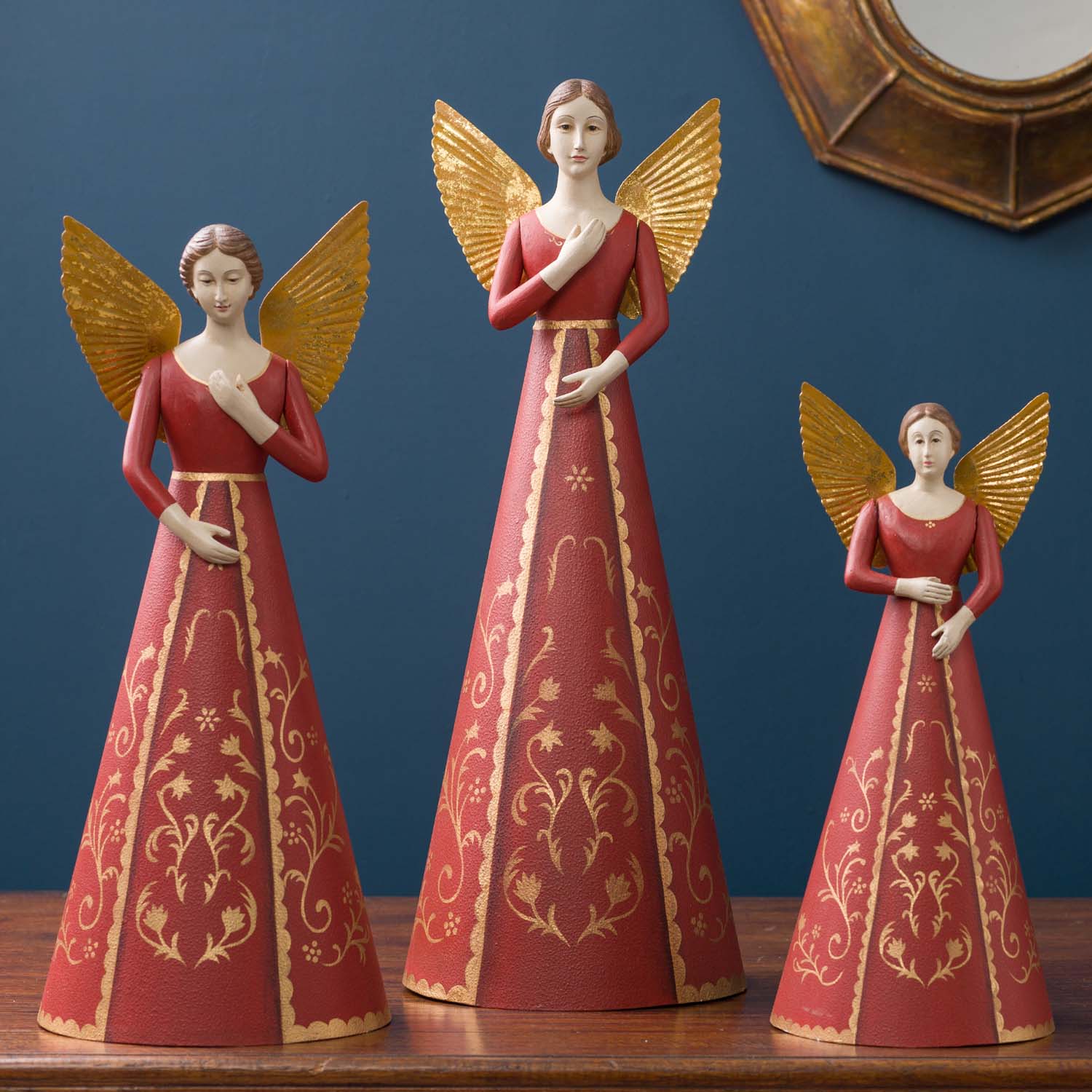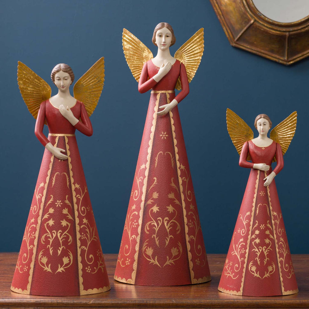 Our Vienna angels are robed in metal skirts with hand-painted floral detailing as well as textured tole metal wings. Display in multiples for a festive holiday scene.