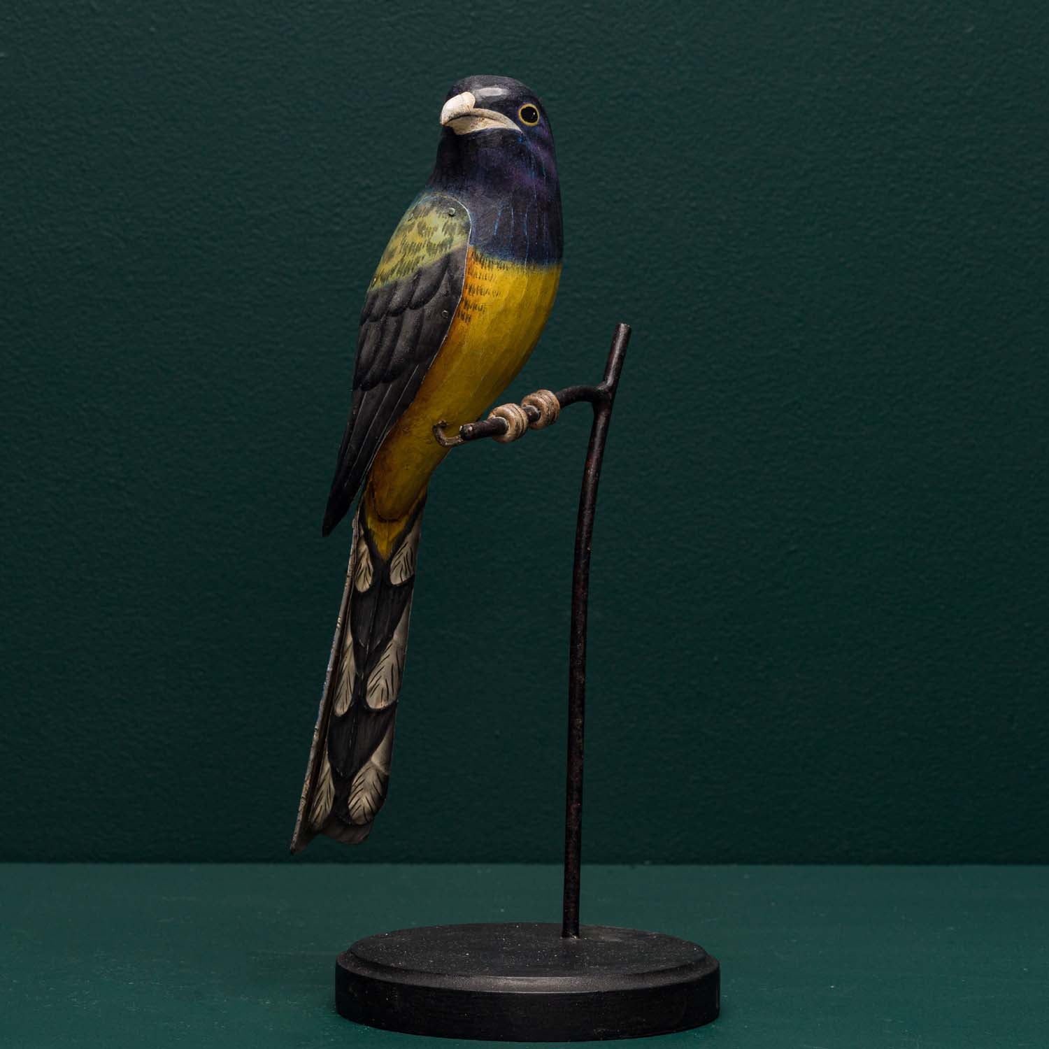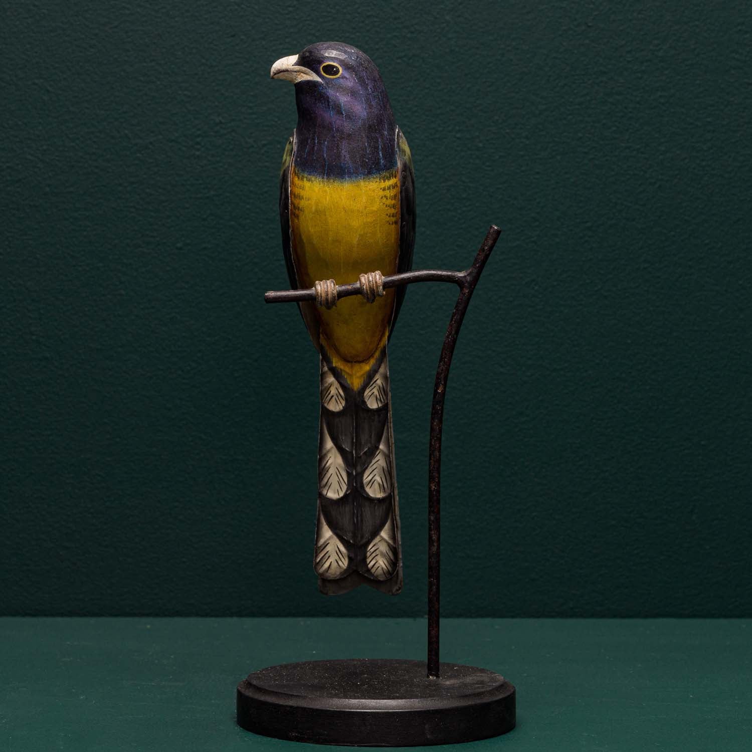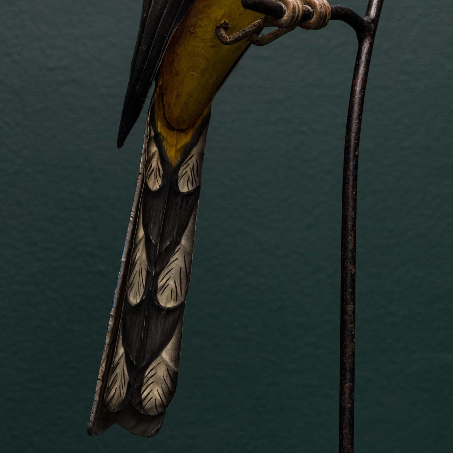 Each bird is crafted from hand carved wood with hand embossed tin wings and tails. A highly detailed and accurate finish is then applied by hand. The bird is then mounted on to a museum style base with a "twig" detail.