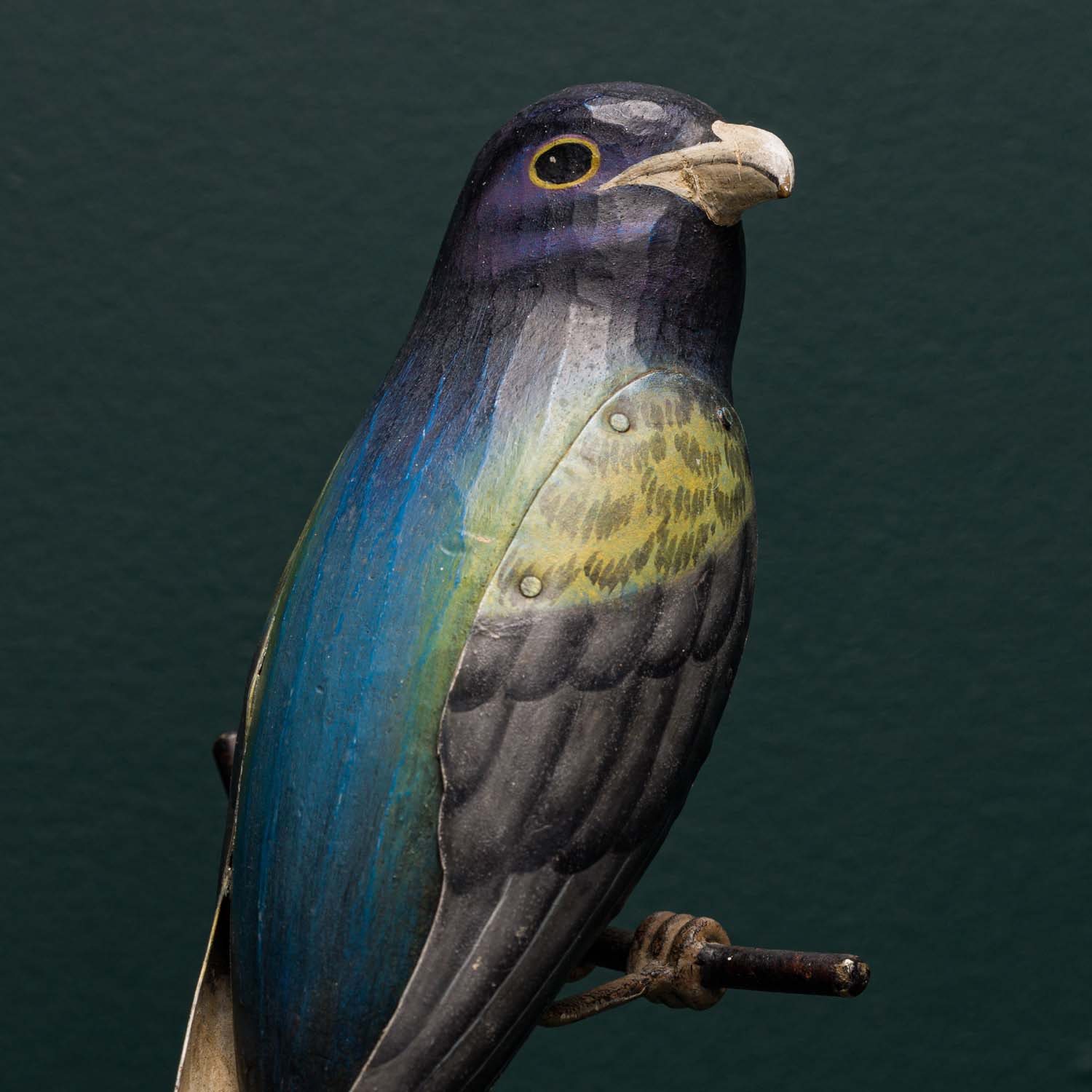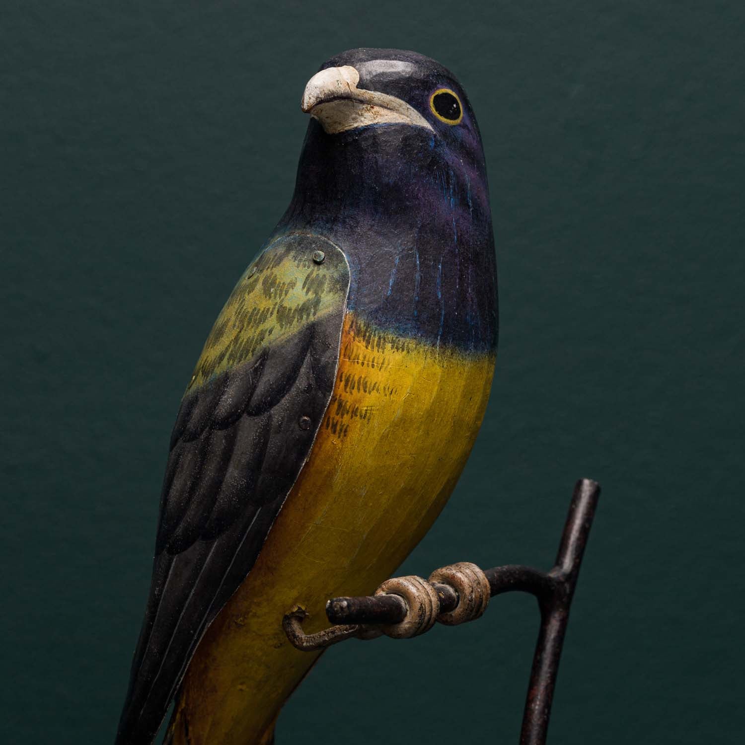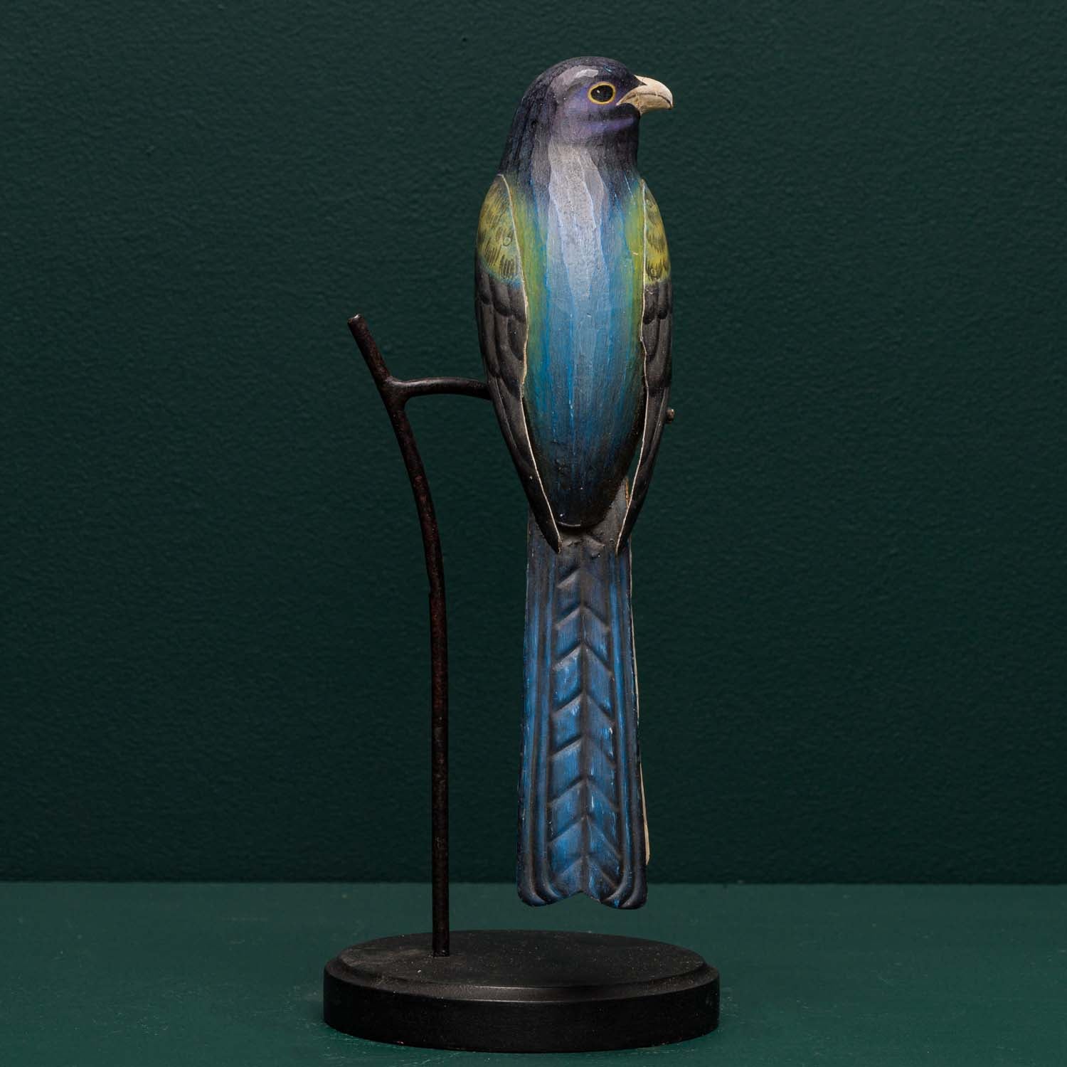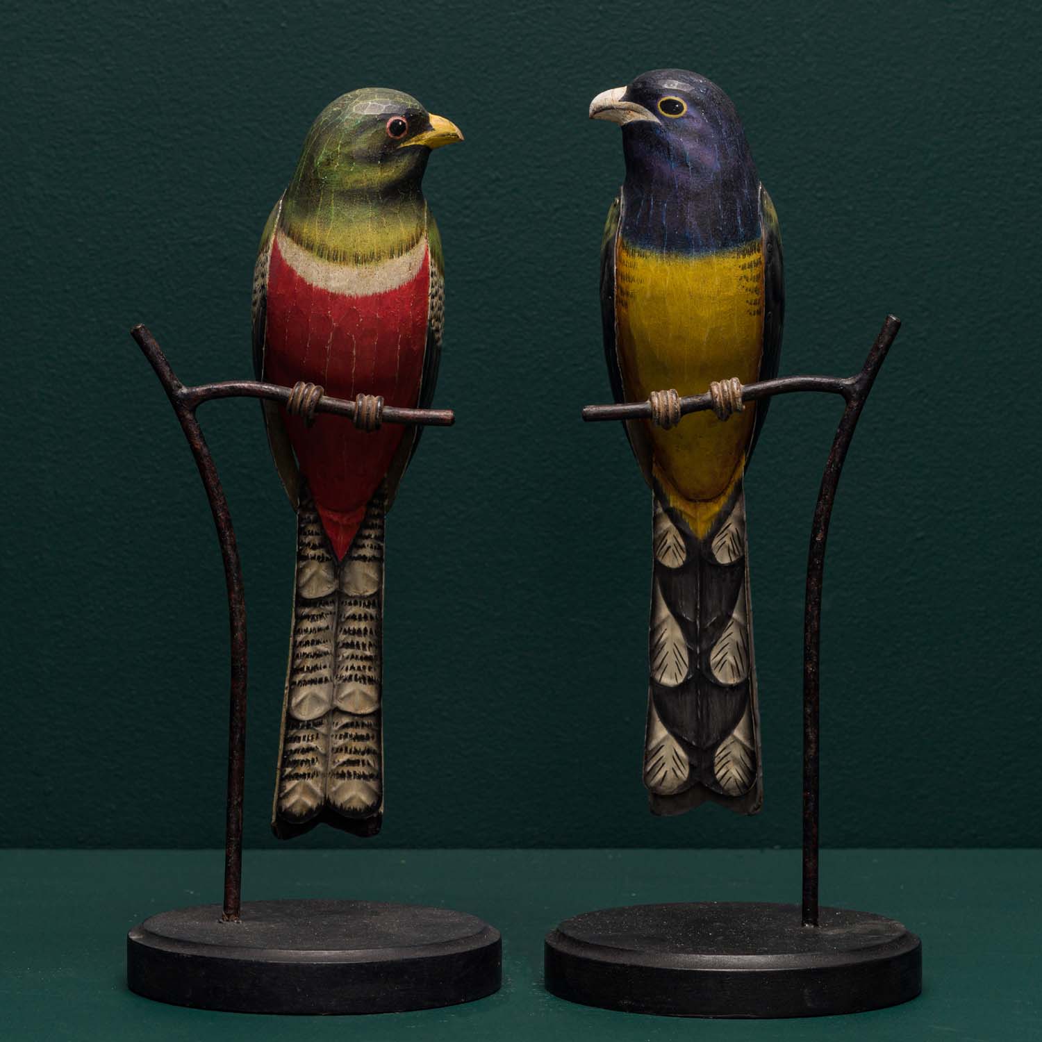 Each bird is crafted from hand carved wood with hand embossed tin wings and tails. A highly detailed and accurate finish is then applied by hand. The bird is then mounted on to a museum style base with a "twig" detail.