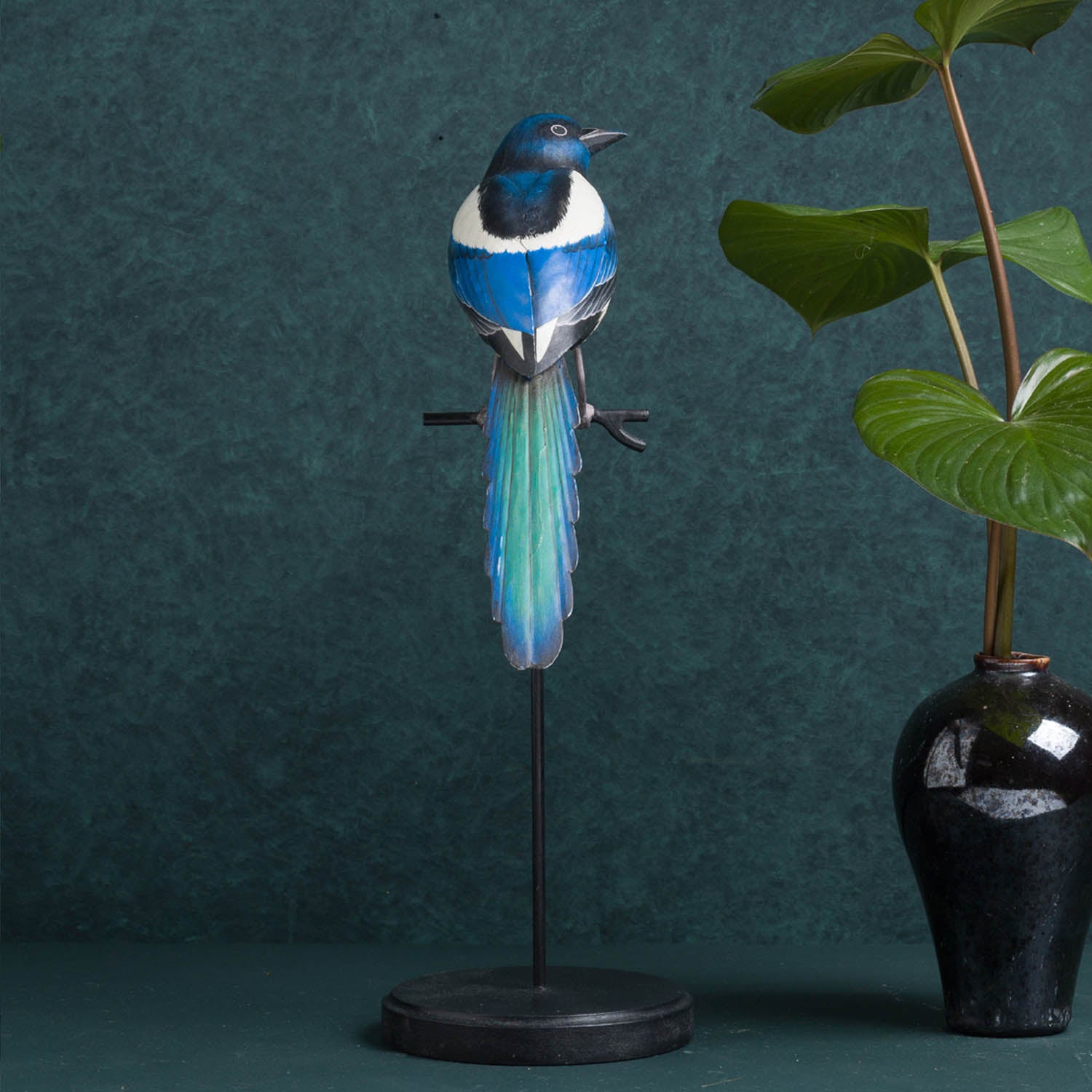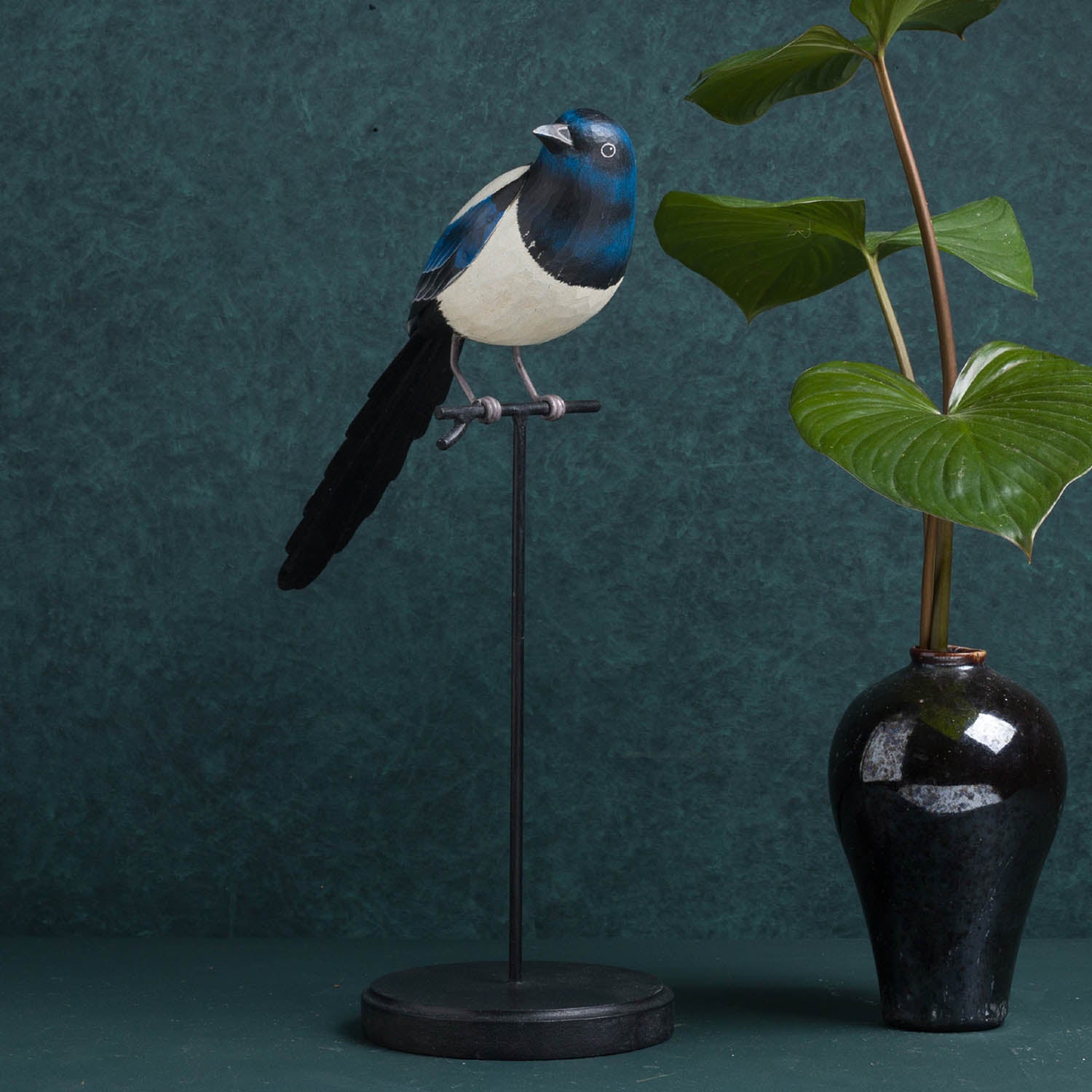 BLACK-BILLED MAGPIE - 8"L X 4.75"W X 14.25"H / Handpainted - Blue White Green Black / Hand carved wood with metal and resin accents is backordered and will ship as soon as it is back in stock.