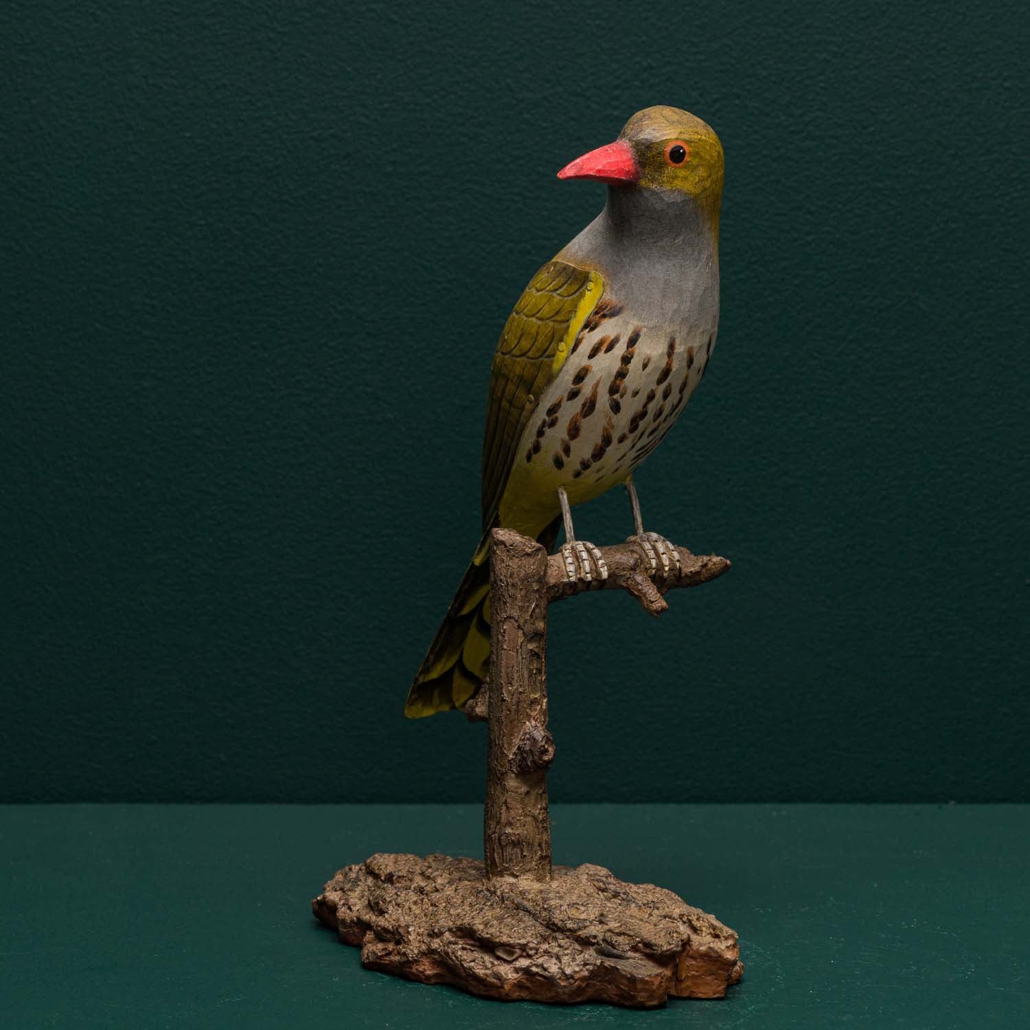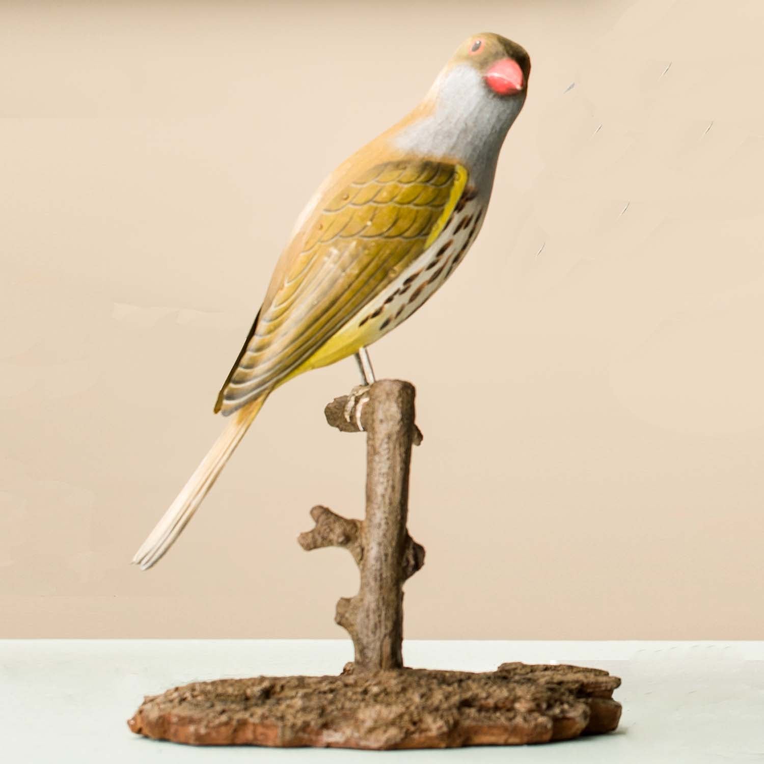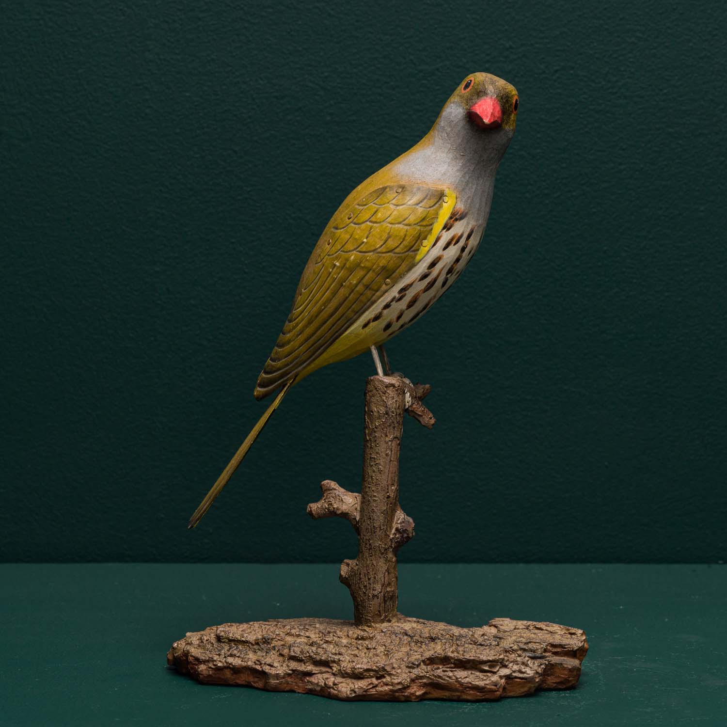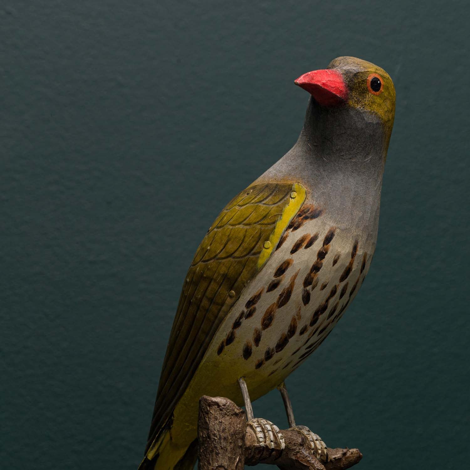 6.5''L x 4''W x 9.5''H / Handpainted - Green Gray Beige Red Brown / Hand carved wood with embossed metal and resin accents