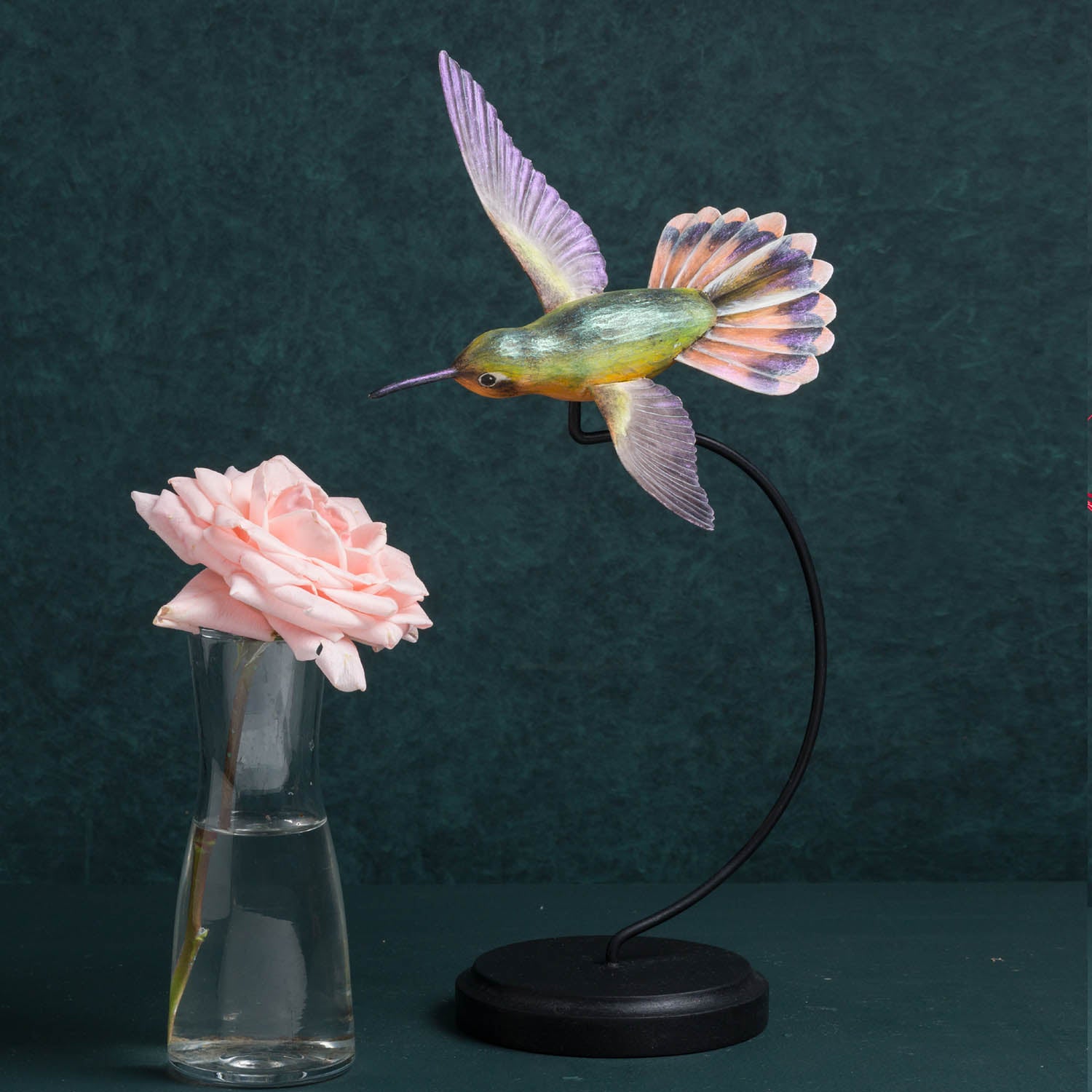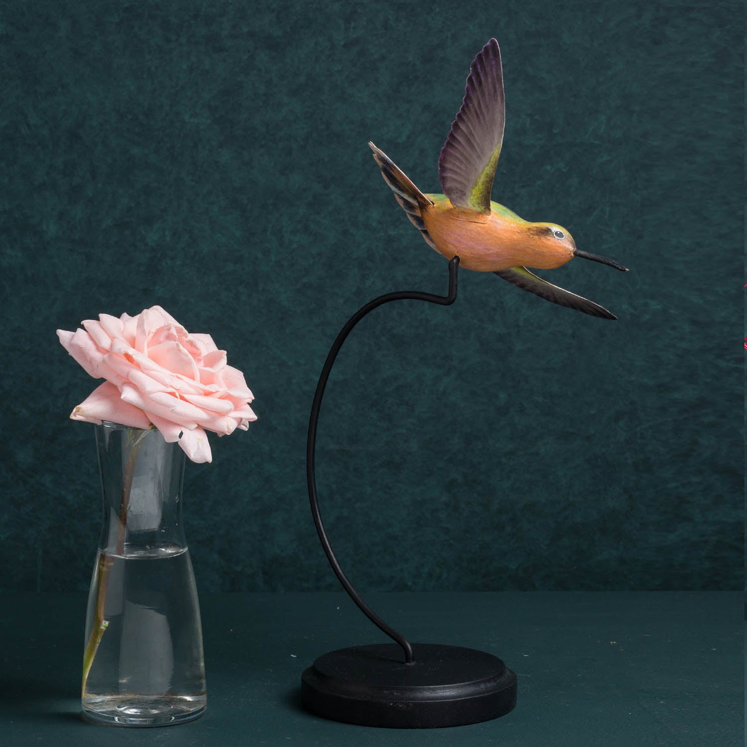 7"L X 6.75"W X 12.50:"H / Hand painted - Green Orange Brown Black / Hand carved wood with metal accents