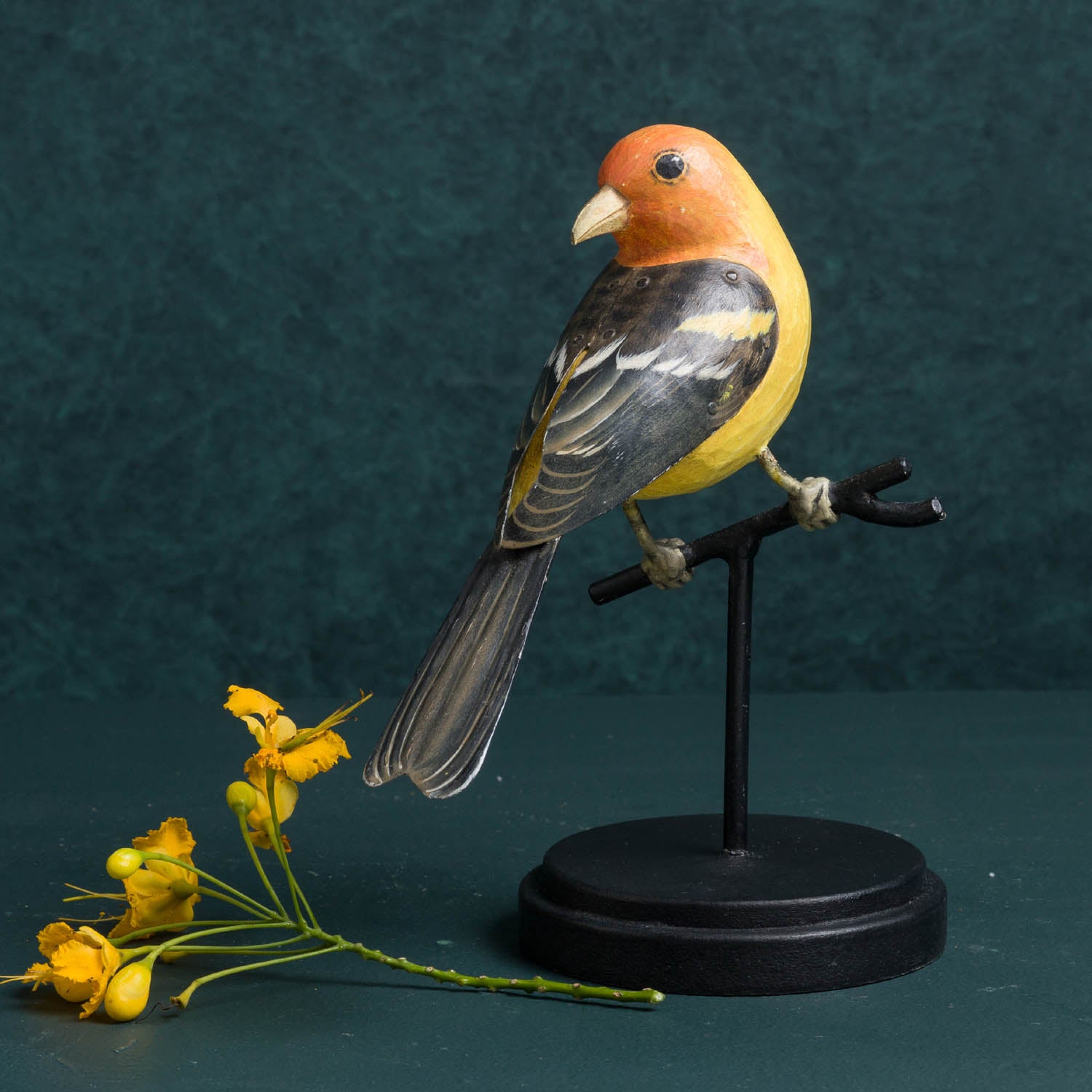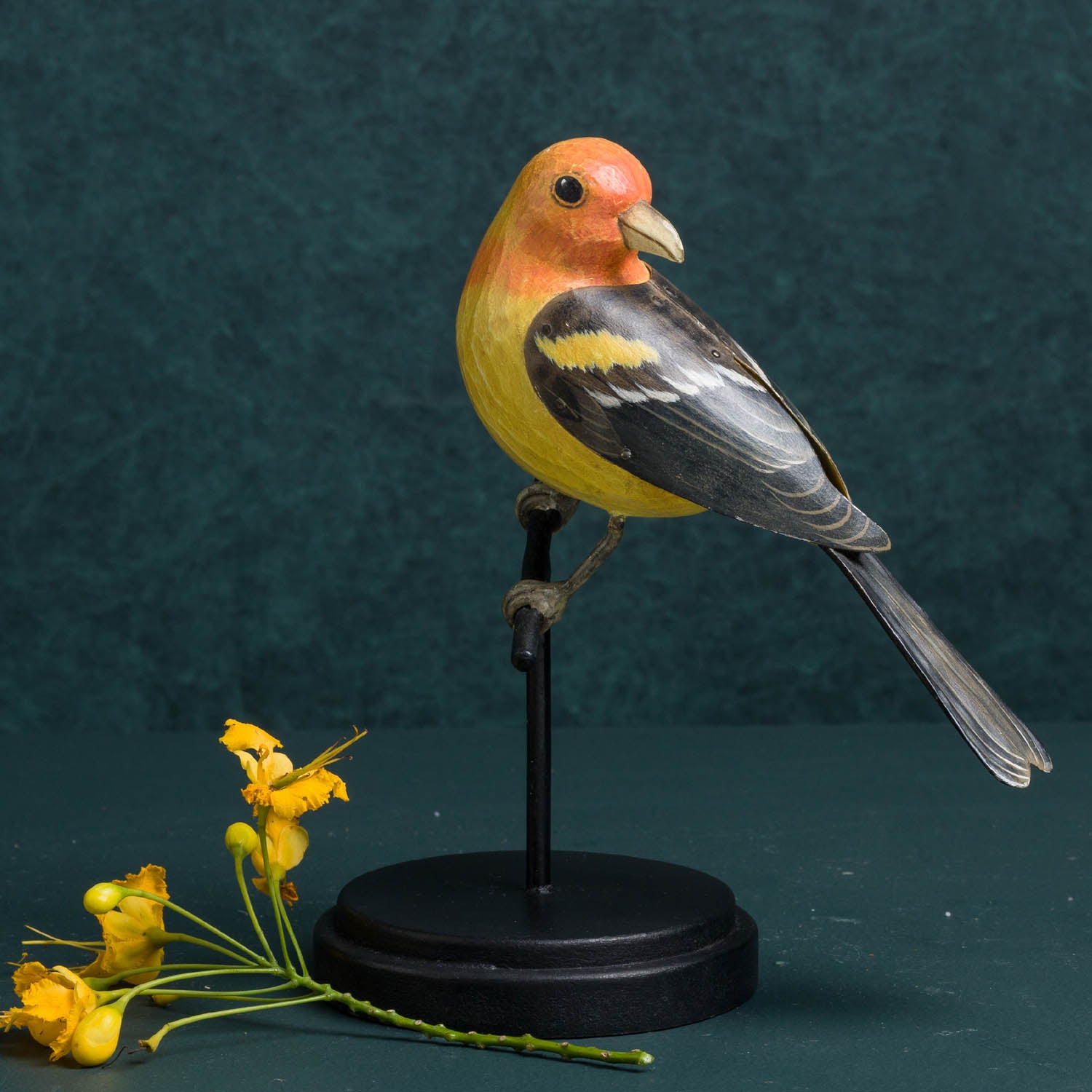 Add a pop of color and visual interest to your desktop or shelf with this pretty bird. Found in parts of the Western US and Mexico, this songbird would make an excellent gift for avian enthusiasts. Hand carved wood with metal accents.