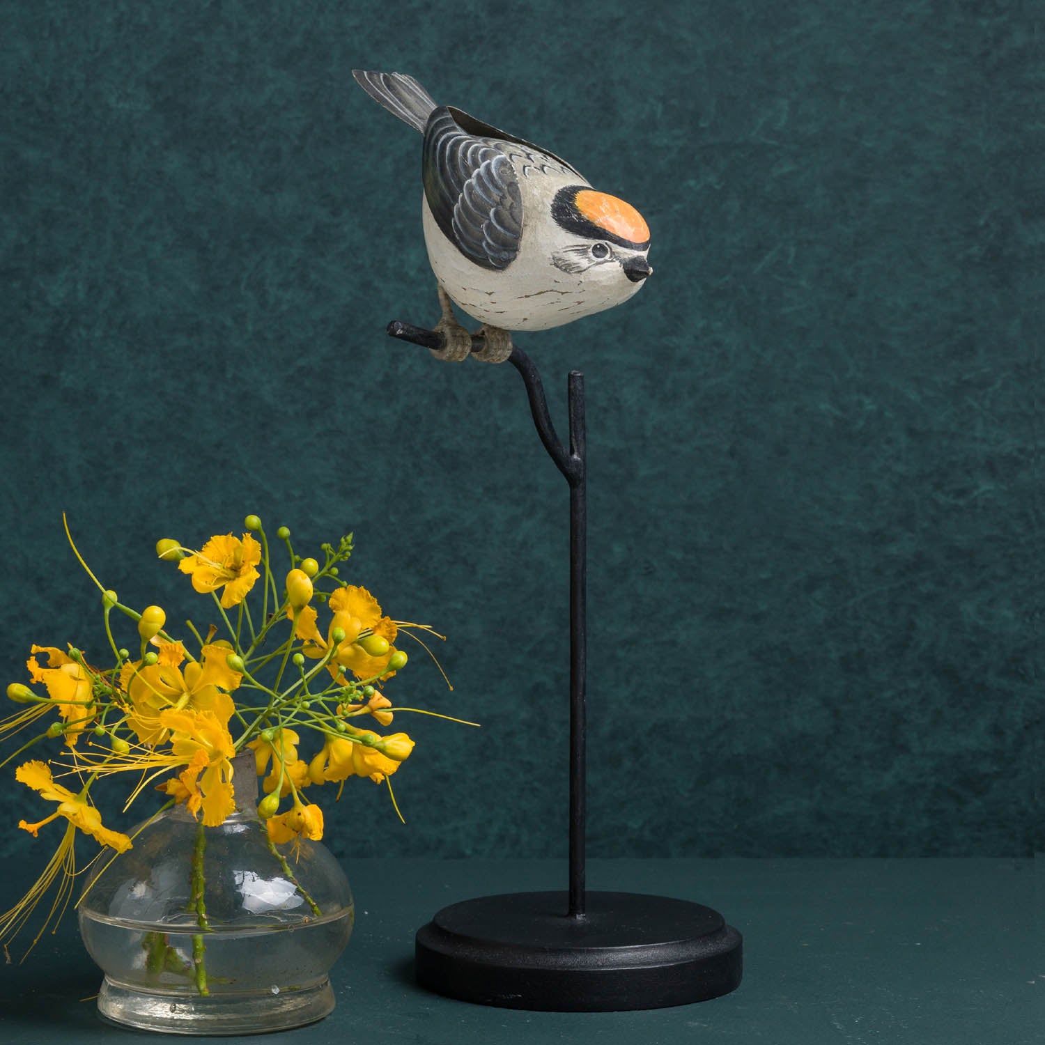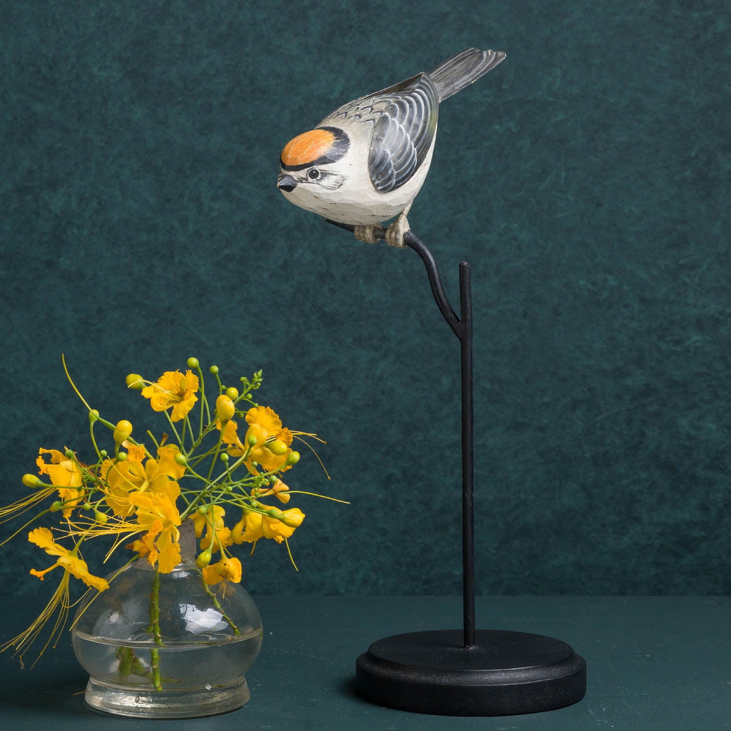 YELLOW KINGLET ON BASE - 5.25"L X 5.25"W X 11.75"H / Handpainted - Beige Brown Orange Black is backordered and will ship as soon as it is back in stock.
