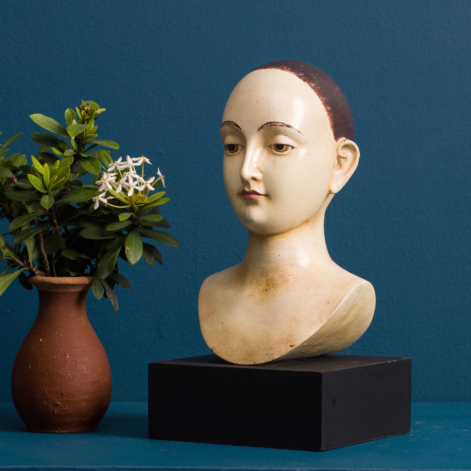 Our classic santos busts are inspired by 18th Century religious statuary. Each is hand painted in a faux ivory finish with an antique patina.