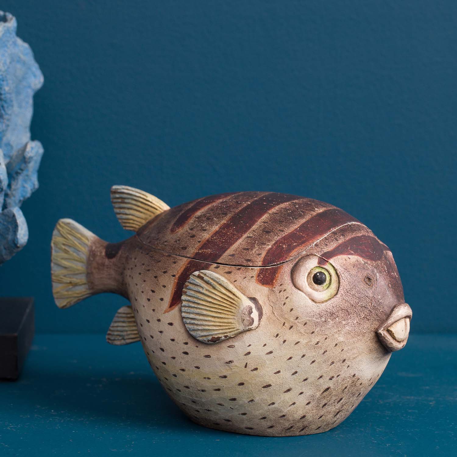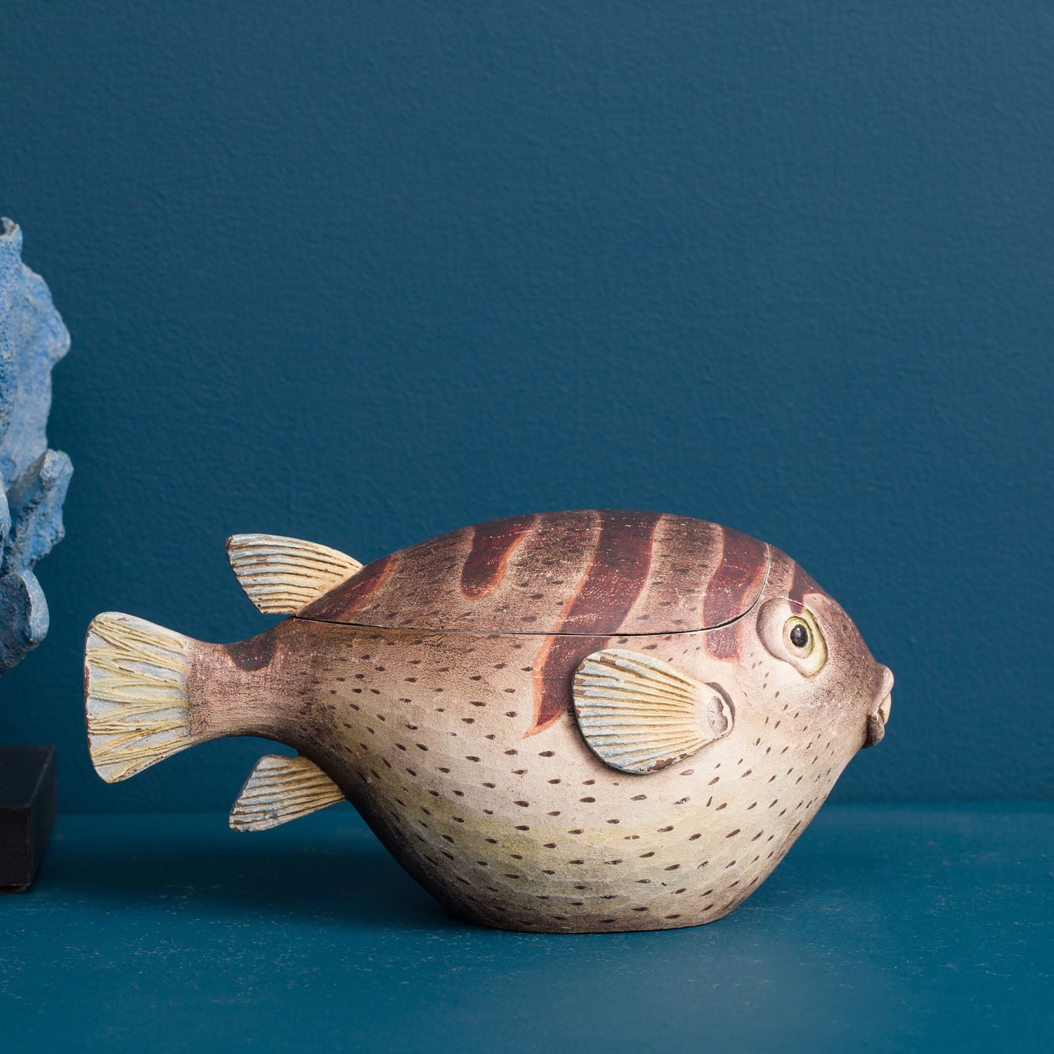 Our puffer fish are inspired by the sea life illustrations of Enlightenment era naturalists. We developed the richly detailed illustrations into three dimensional objects that make fabulous accent pieces. Use this box on a desktop or shelf to store small objects.