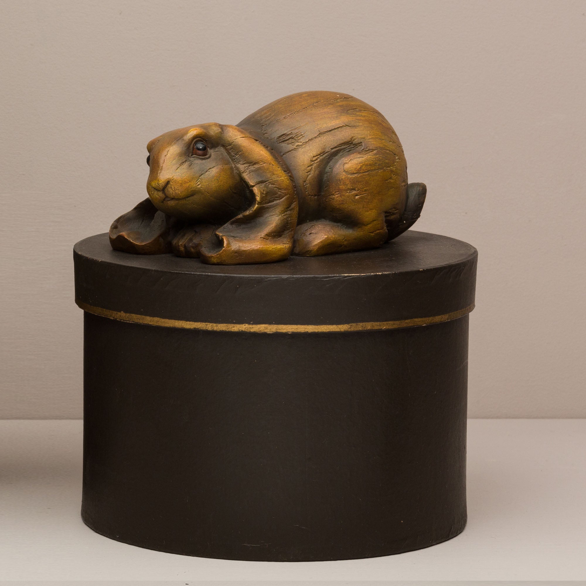 LYING HARE ON ROUND BOX - 7.5"L X 7.5"W X 8"H / Handpainted - Brown Black Gold / Hand cast resin with papermache is backordered and will ship as soon as it is back in stock.