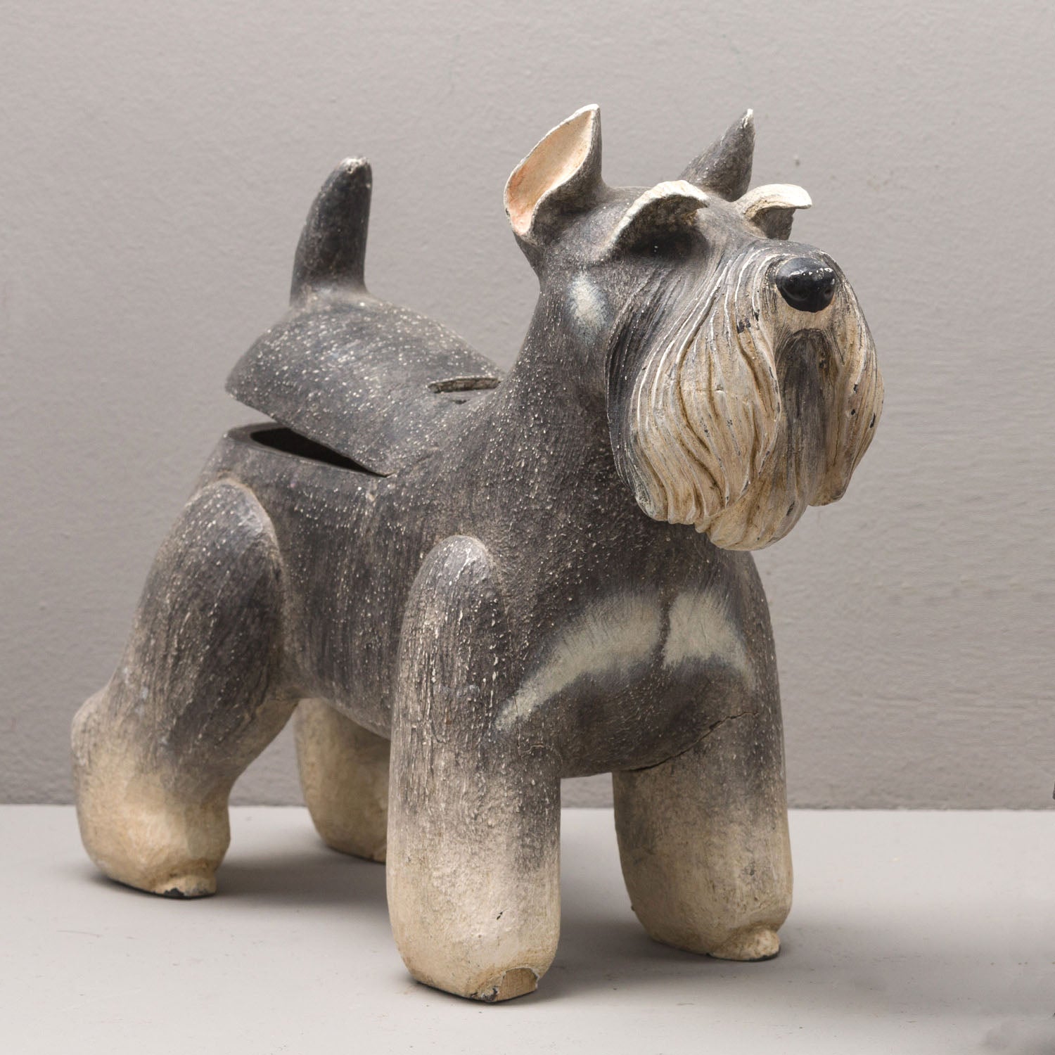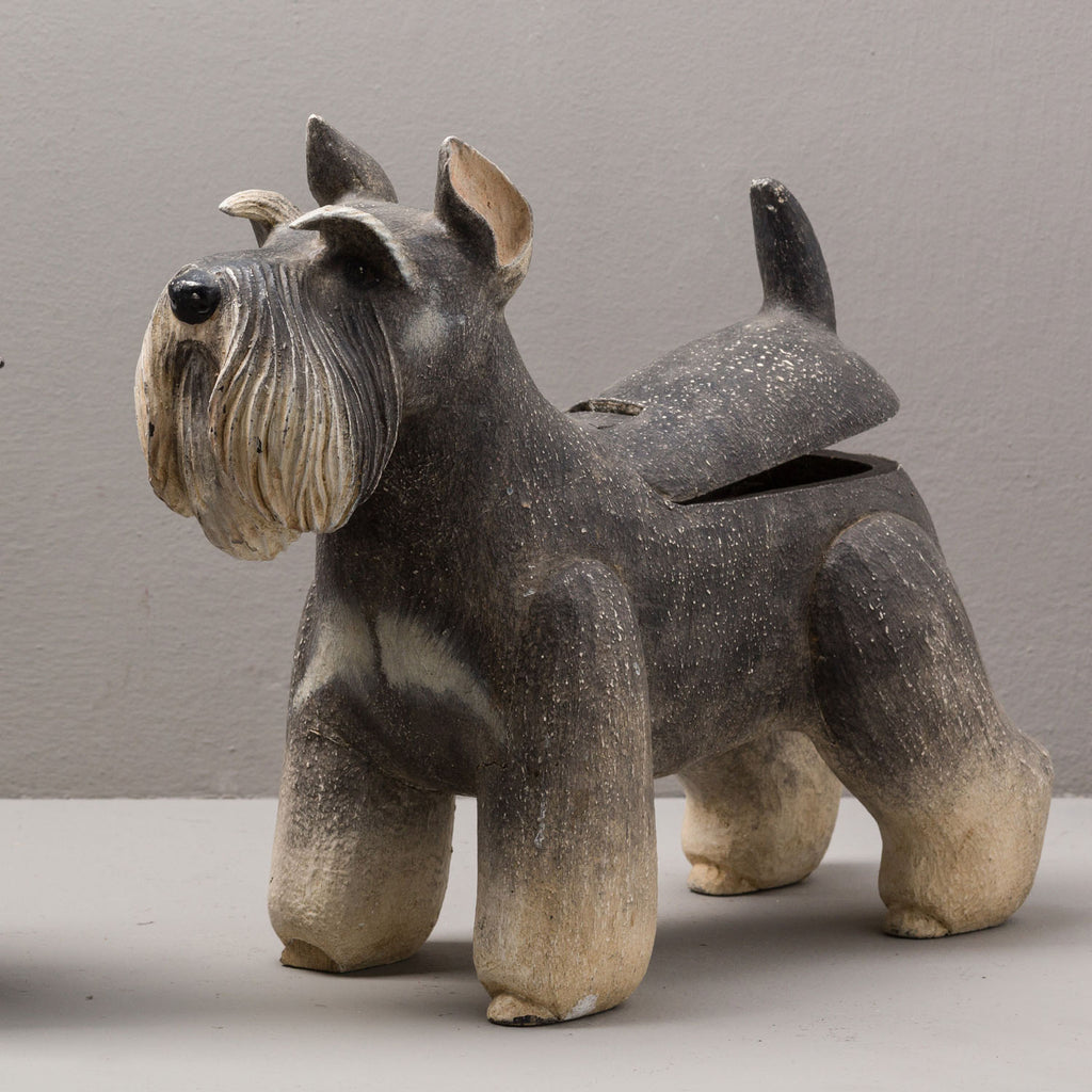MINIATURE SCHNAUZER DOG BOX - 12"L x 4"W x 9.75"H / Handpainted Antique - Gray Beige / Hand carved wood with resin accents is backordered and will ship as soon as it is back in stock.