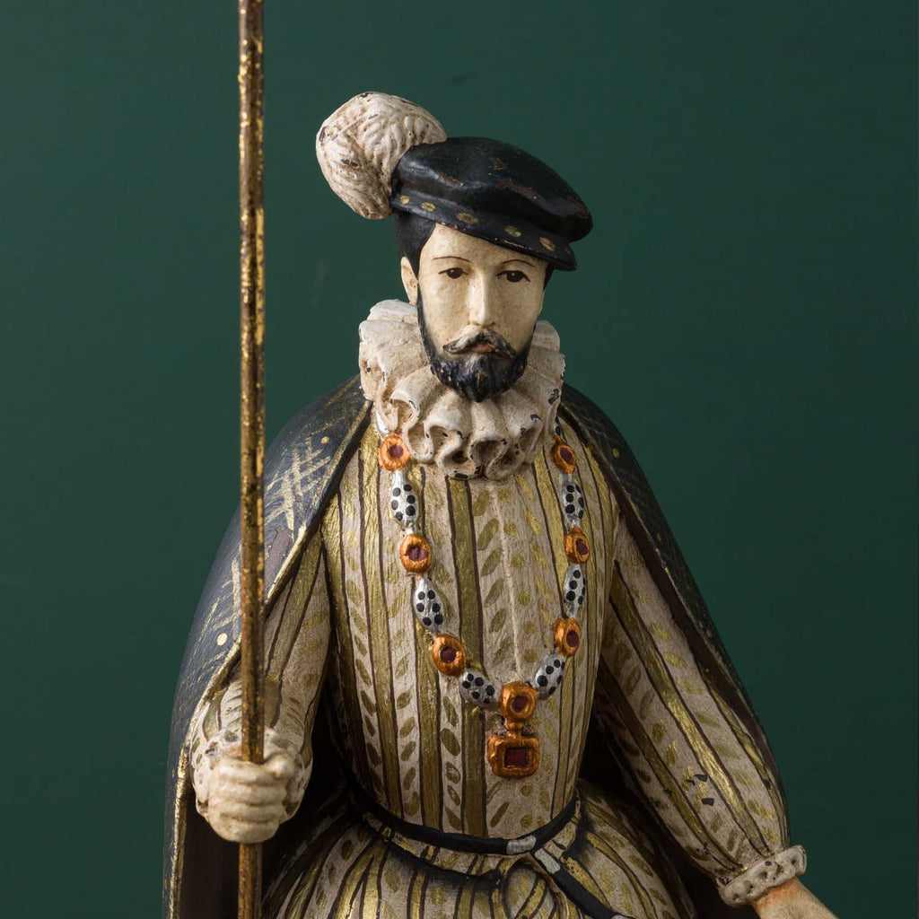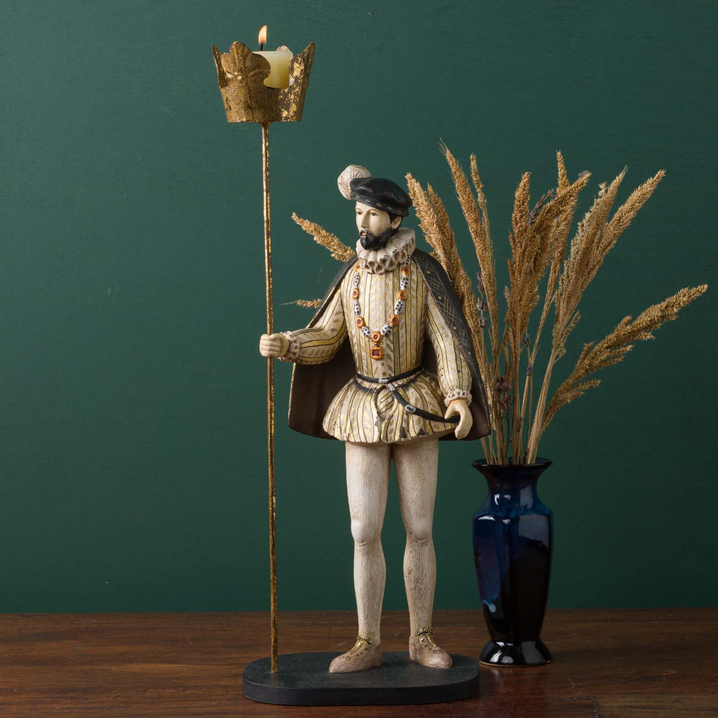 Our Counts and Countesses bring the richness of Medieval costumes to life.  Comte Charles has loads of wonderful detailing including his ruffled collar and jeweled chain.   Not only is he fashionable, he is functional as well - he holds a gilt candle holder that can hold tea light or taper candles.   Display him alone, in pairs or with one of our Countess candleholders. Hand-painted with an antique patina.