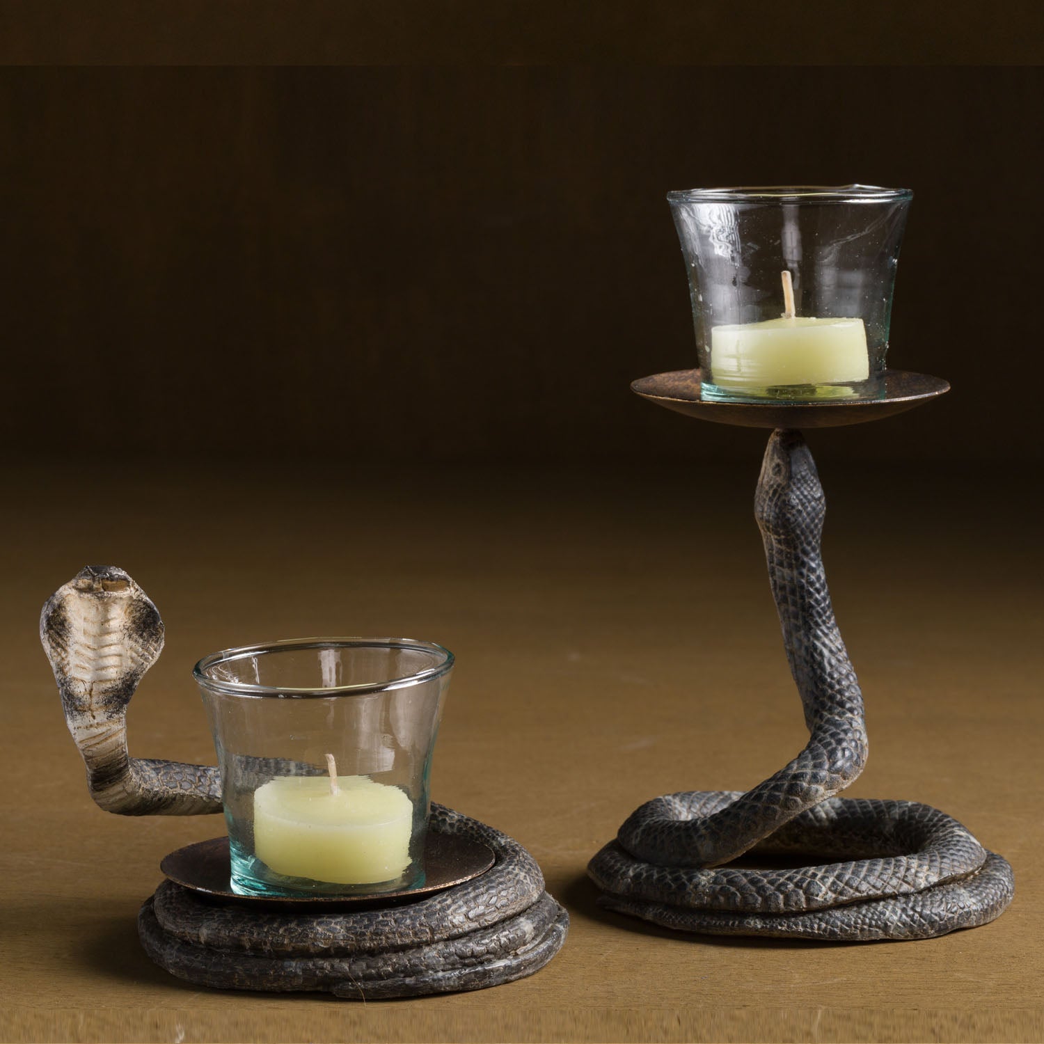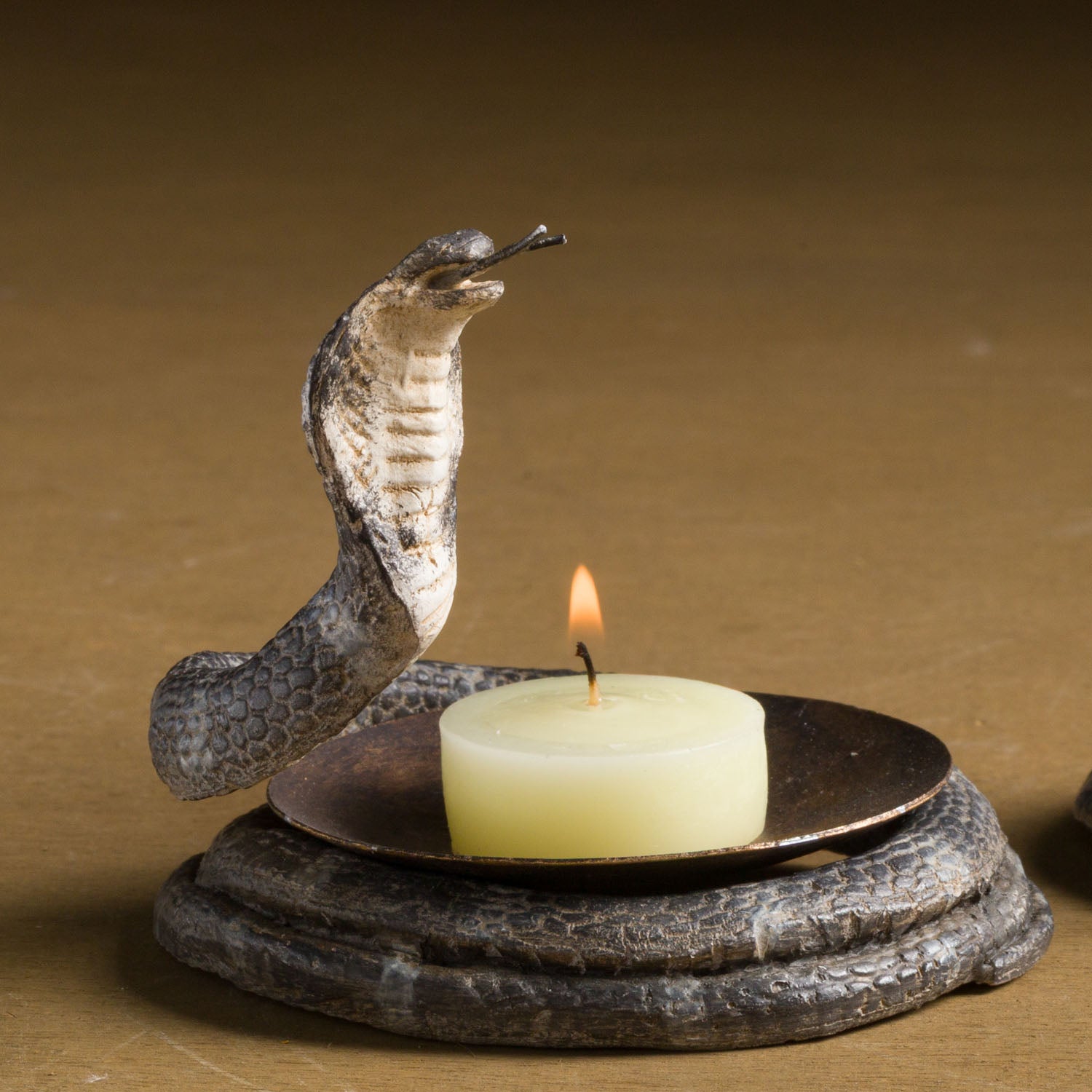 COBRA WITH DISH - 4.50"L x 4"W x 4"H / Handpainted Gray Beige Brown / Hand cast resin with metal accents is backordered and will ship as soon as it is back in stock.