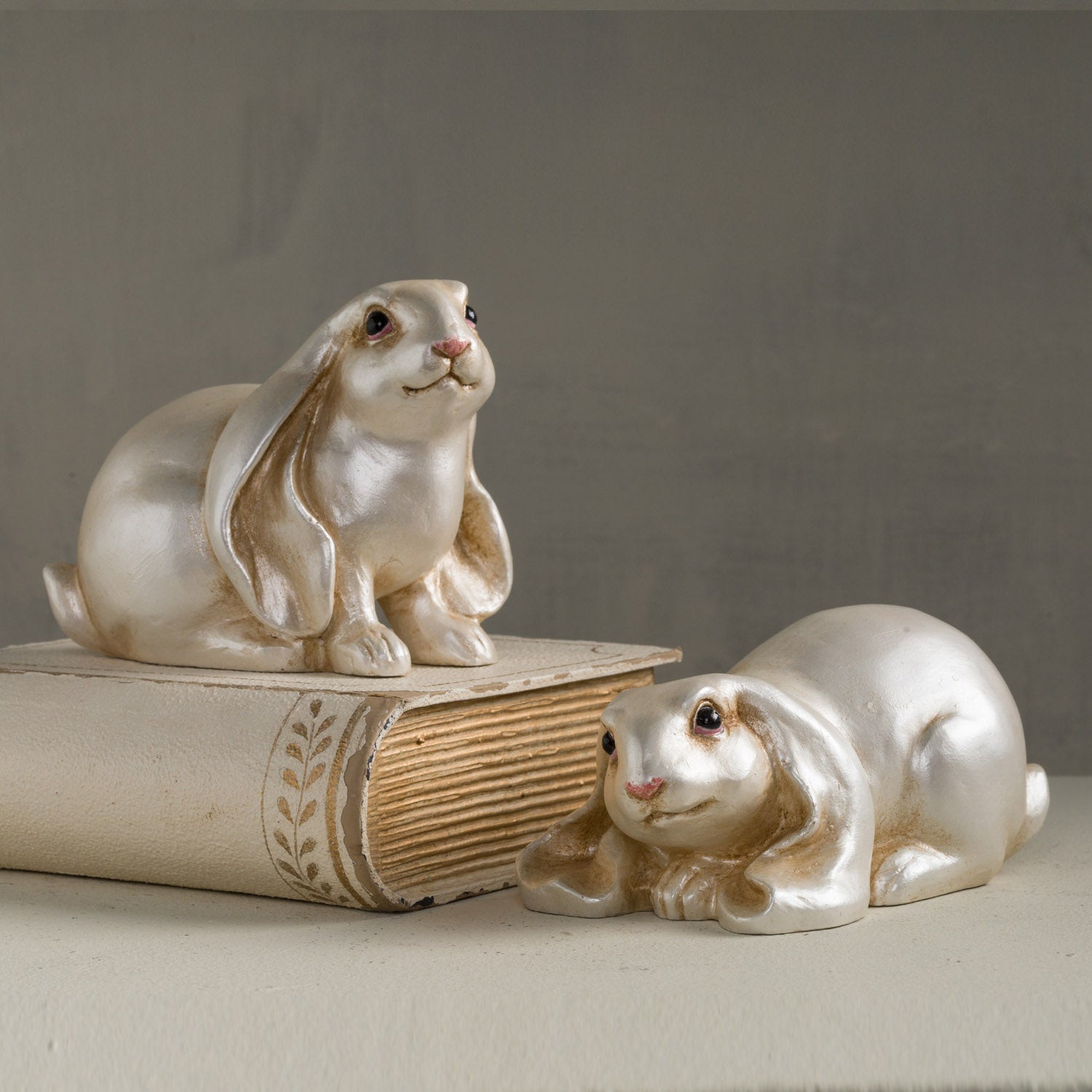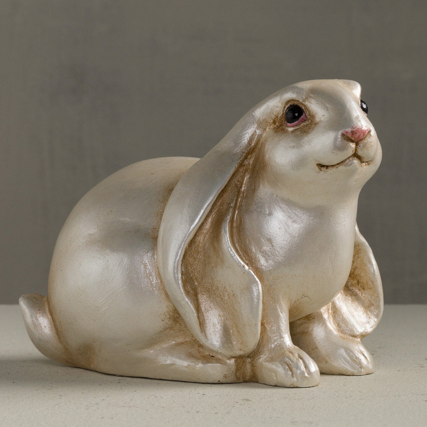 SITTING HARE, PEARLIZED - 5.75"L X 3.5"W X 4.25"H / Pearlized / Hand cast resin is backordered and will ship as soon as it is back in stock.