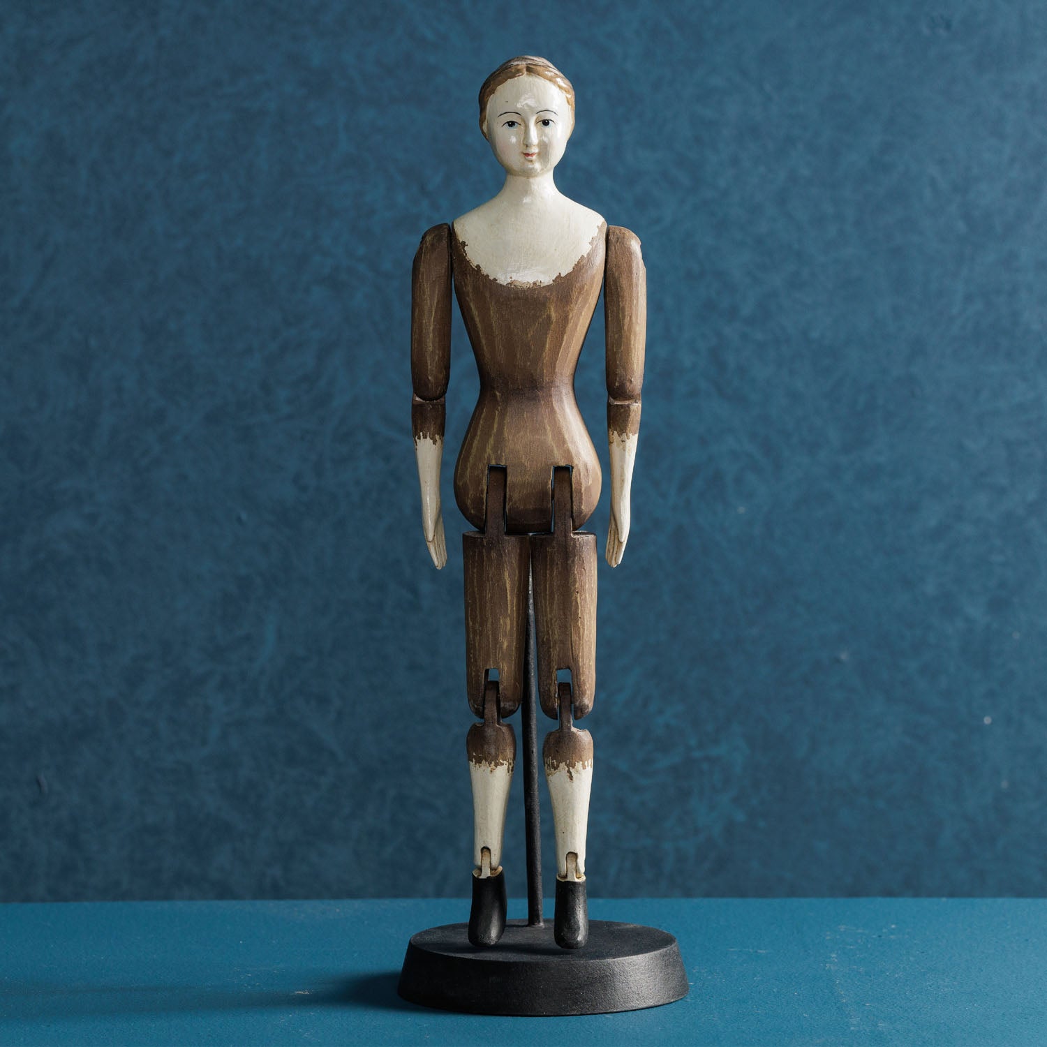 ARTICULATED DIVINA - 4"L x 4"W X 13.25"H / Handpainted - Brown White Black / Hand carved wood with resin and metal accents is backordered and will ship as soon as it is back in stock.
