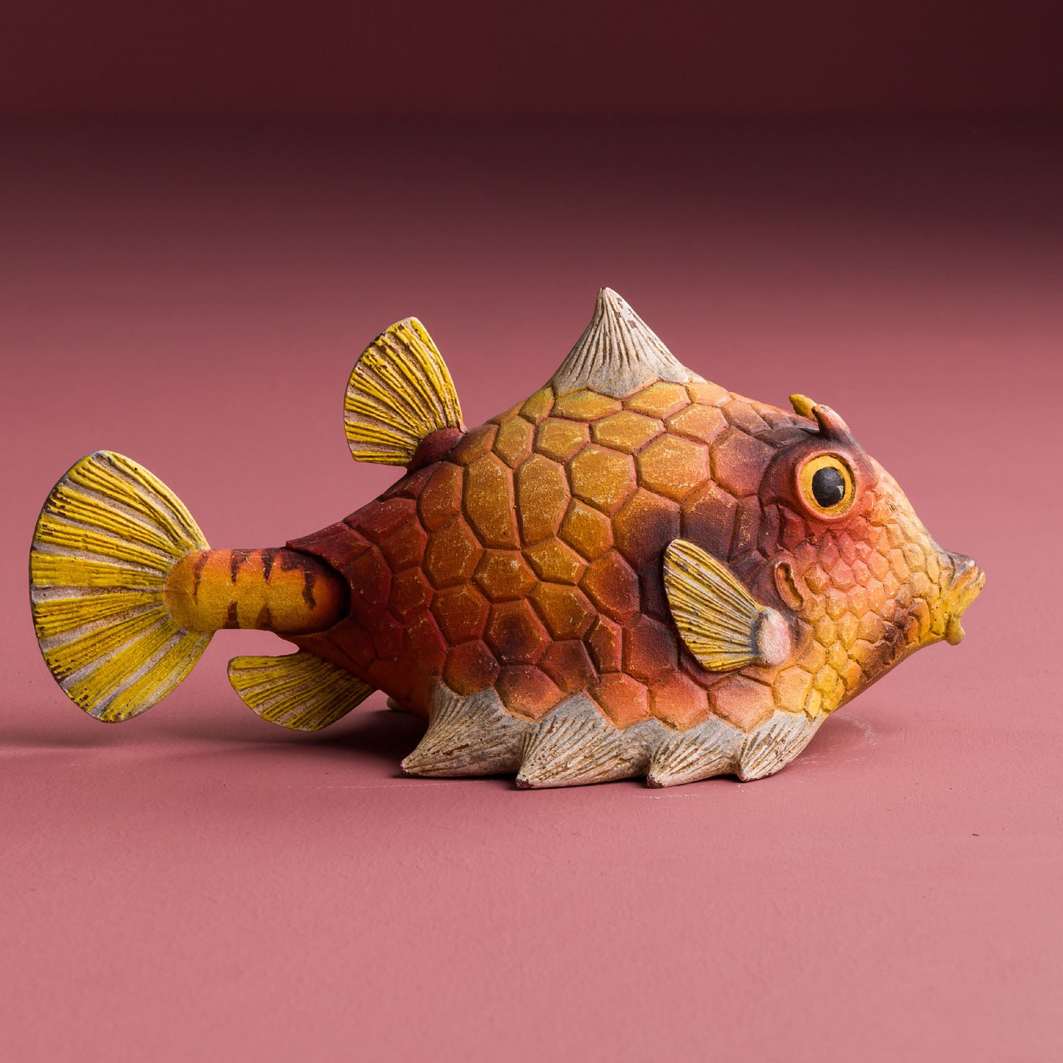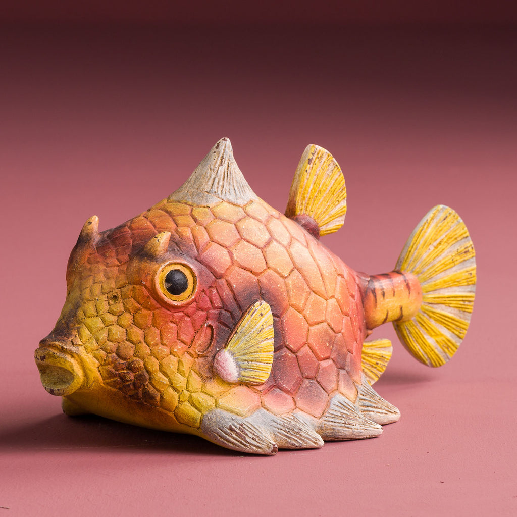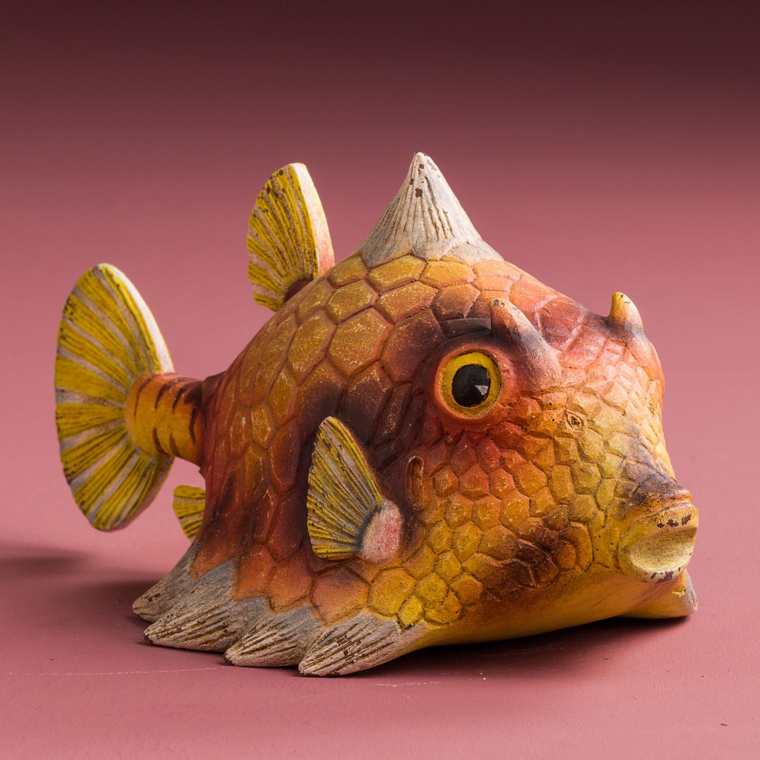 TURRET FISH DECOR - 10"L X 5.50"W X 4.75"H / Handpainted - Orange Yellow Beige / Hand cast resin is backordered and will ship as soon as it is back in stock.