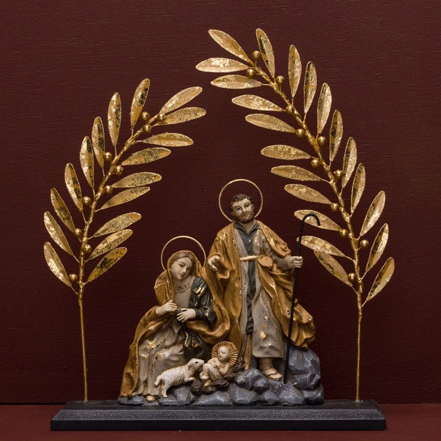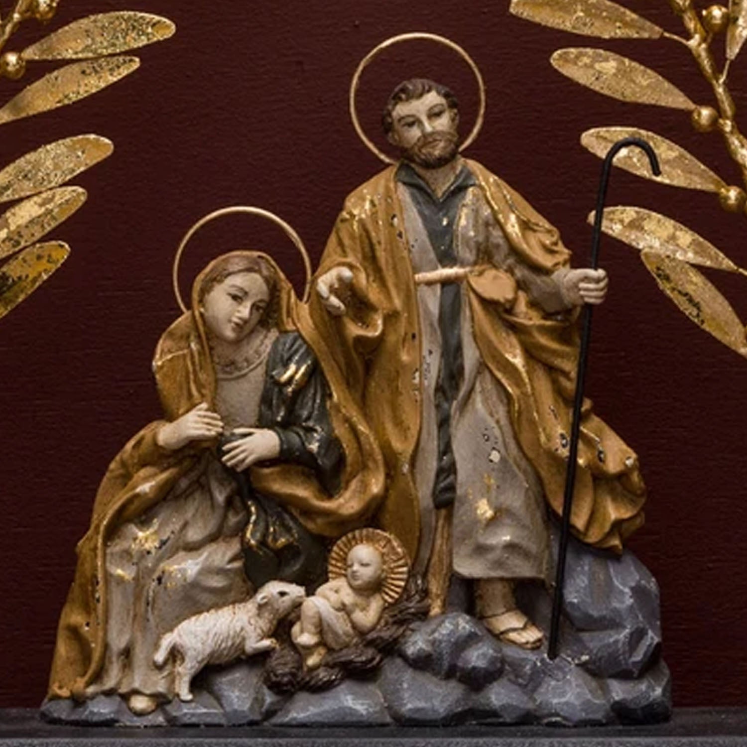This nativity features a bas relief holy family mounted on a wooden base adorned with tole metal olive leaves.   A perfect nativity set for smaller spaces.