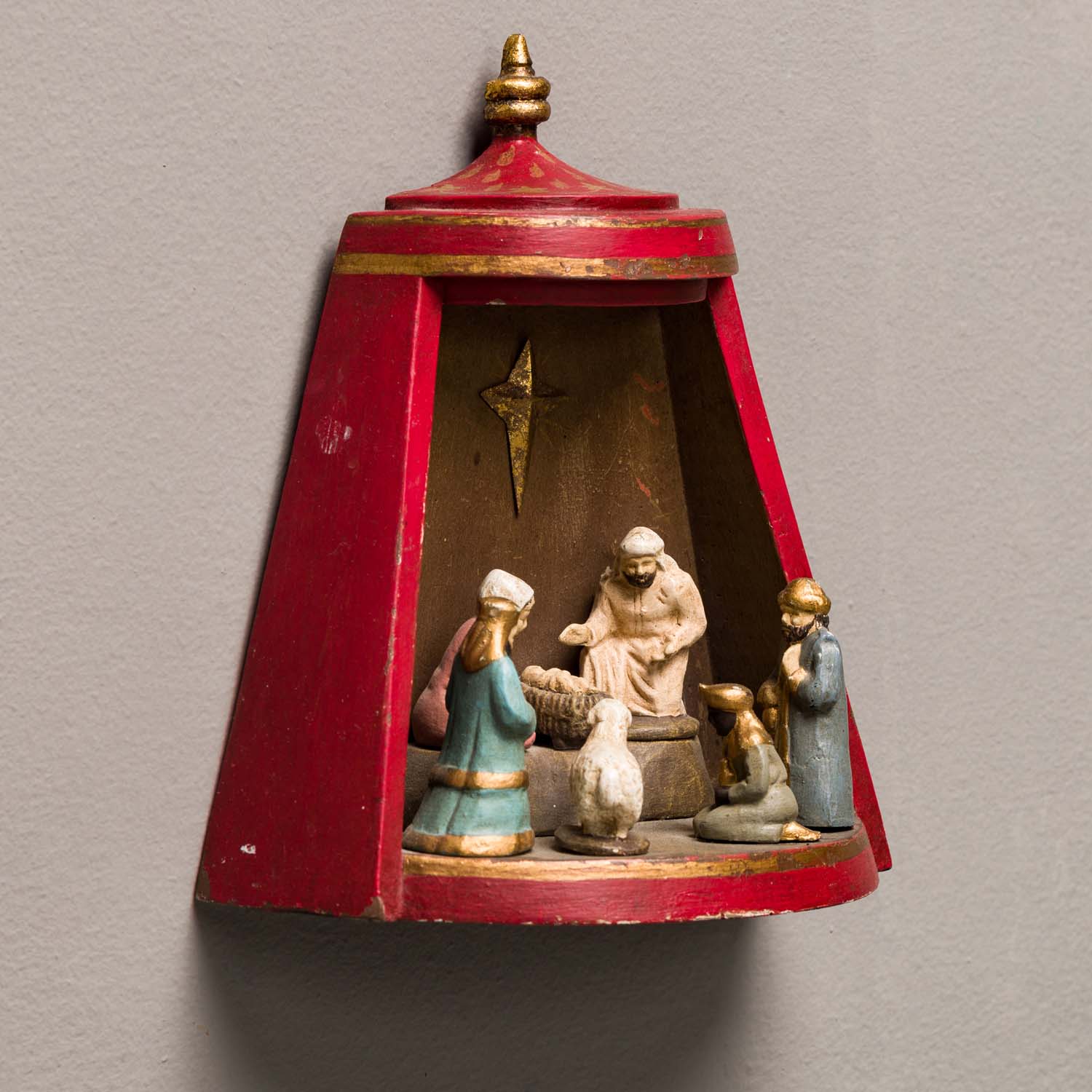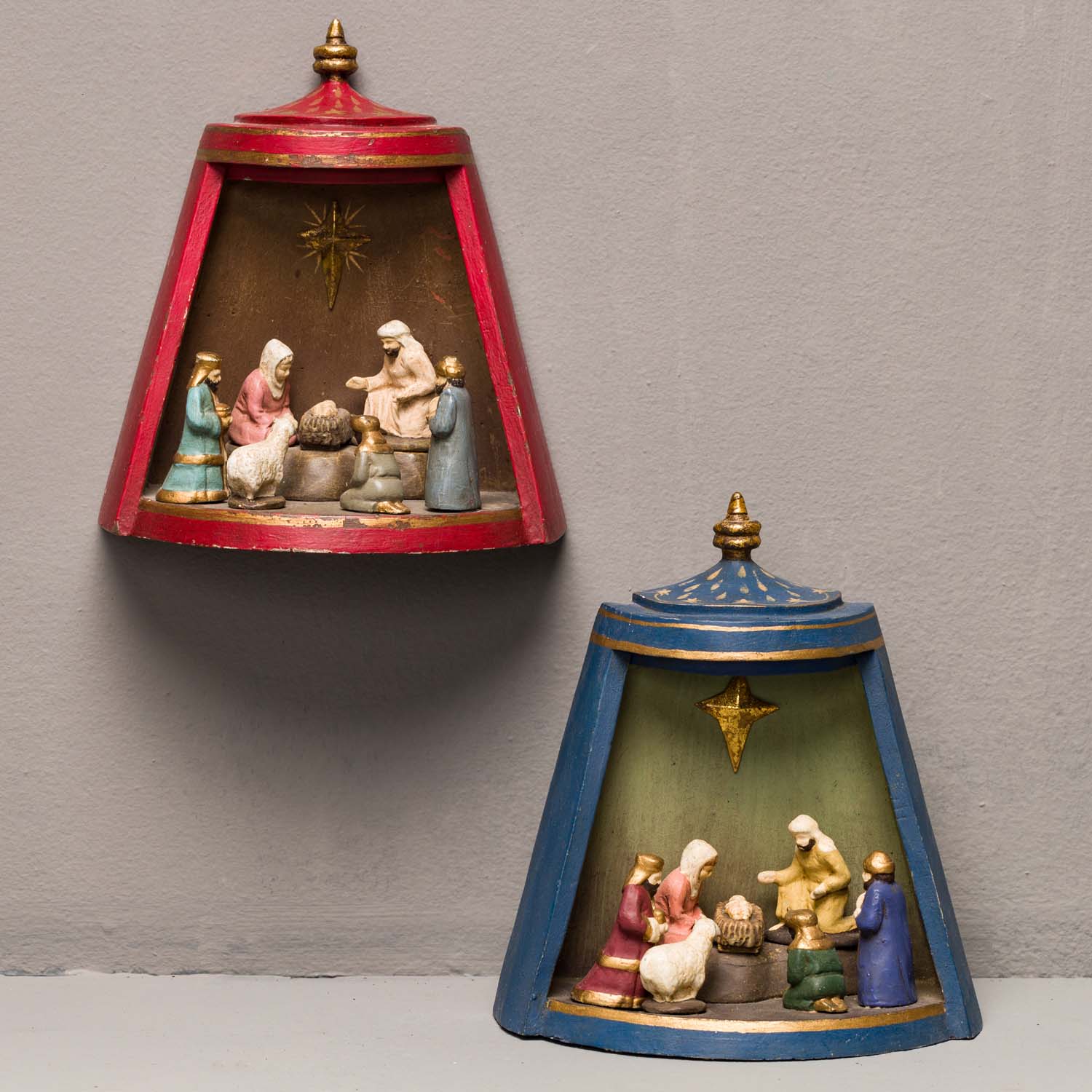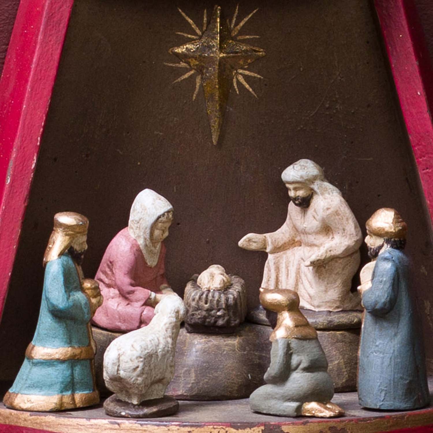 This miniature nativity scene is set in a richly colored frame with a gilt metal star detail in the background. Smaller proportions make this piece easy to display on a tabletop or shelf that is tight on space. Hardware on back allows for display on wall or tabletop.
