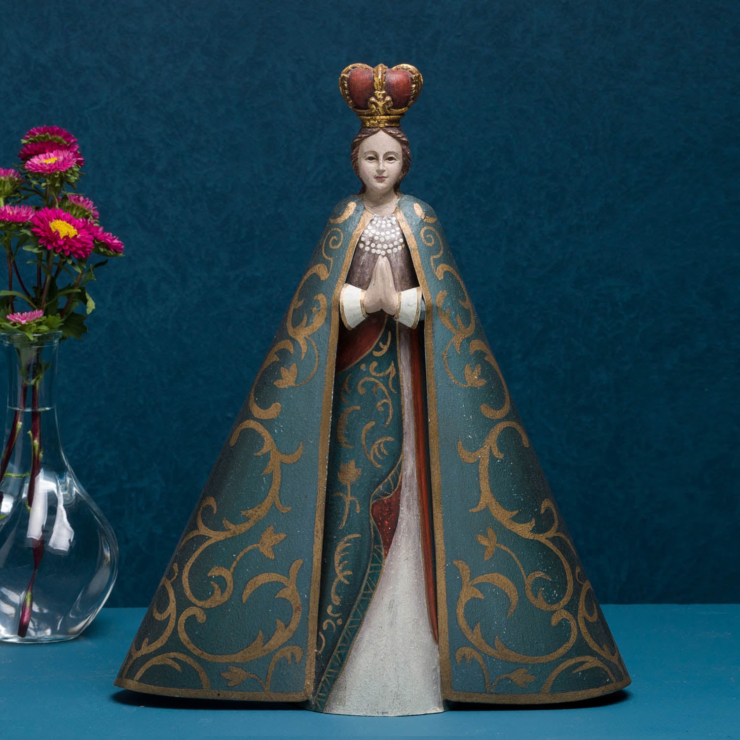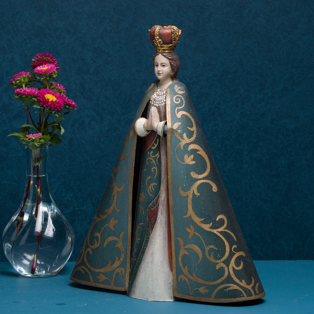 TOLE LA VIRGEN OCOTLAN - 10.25"L X 3.50"W X 13"H / Handpainted Antique - Blue Gold Red Beige Gray Brown / Hand embossed metal with resin accents is backordered and will ship as soon as it is back in stock.