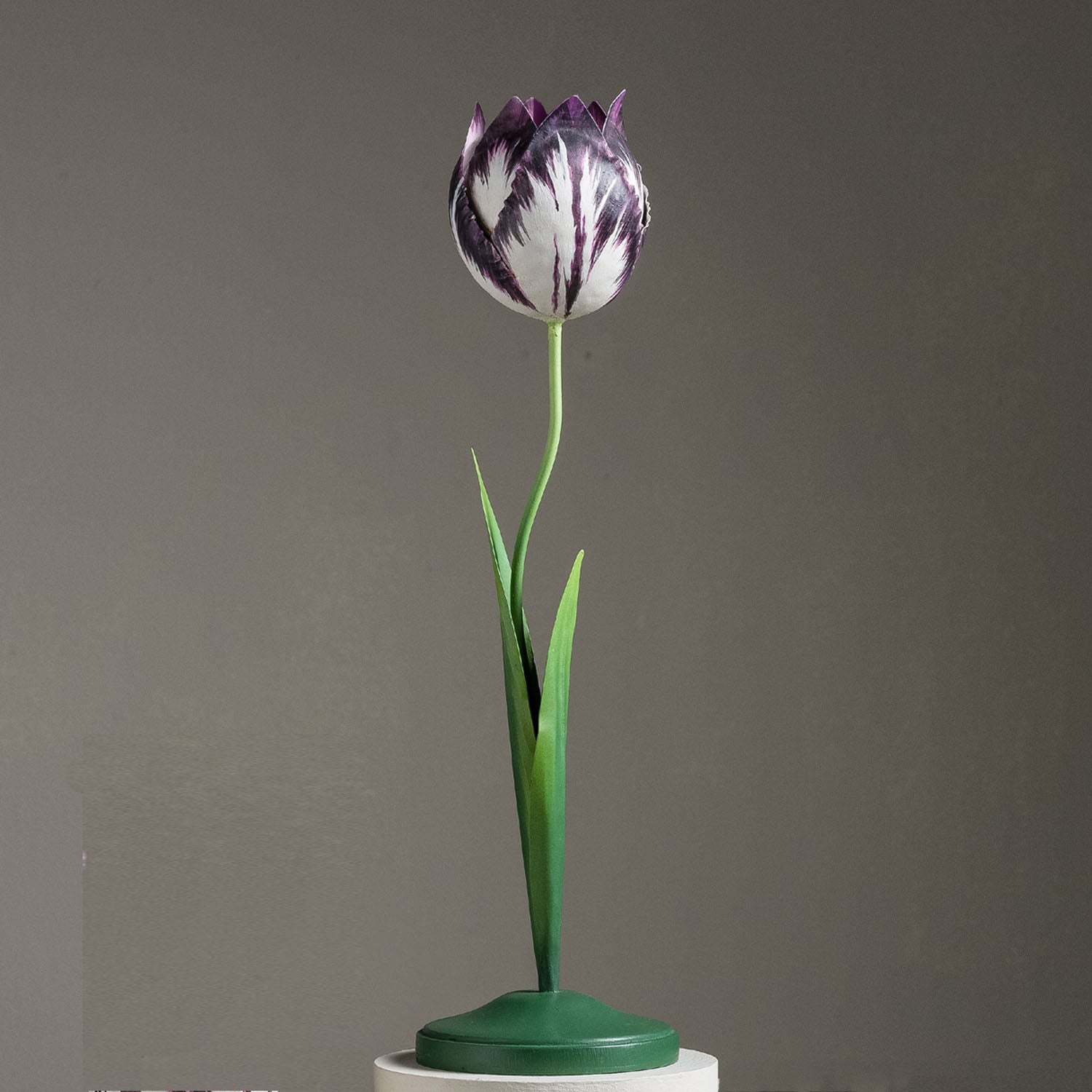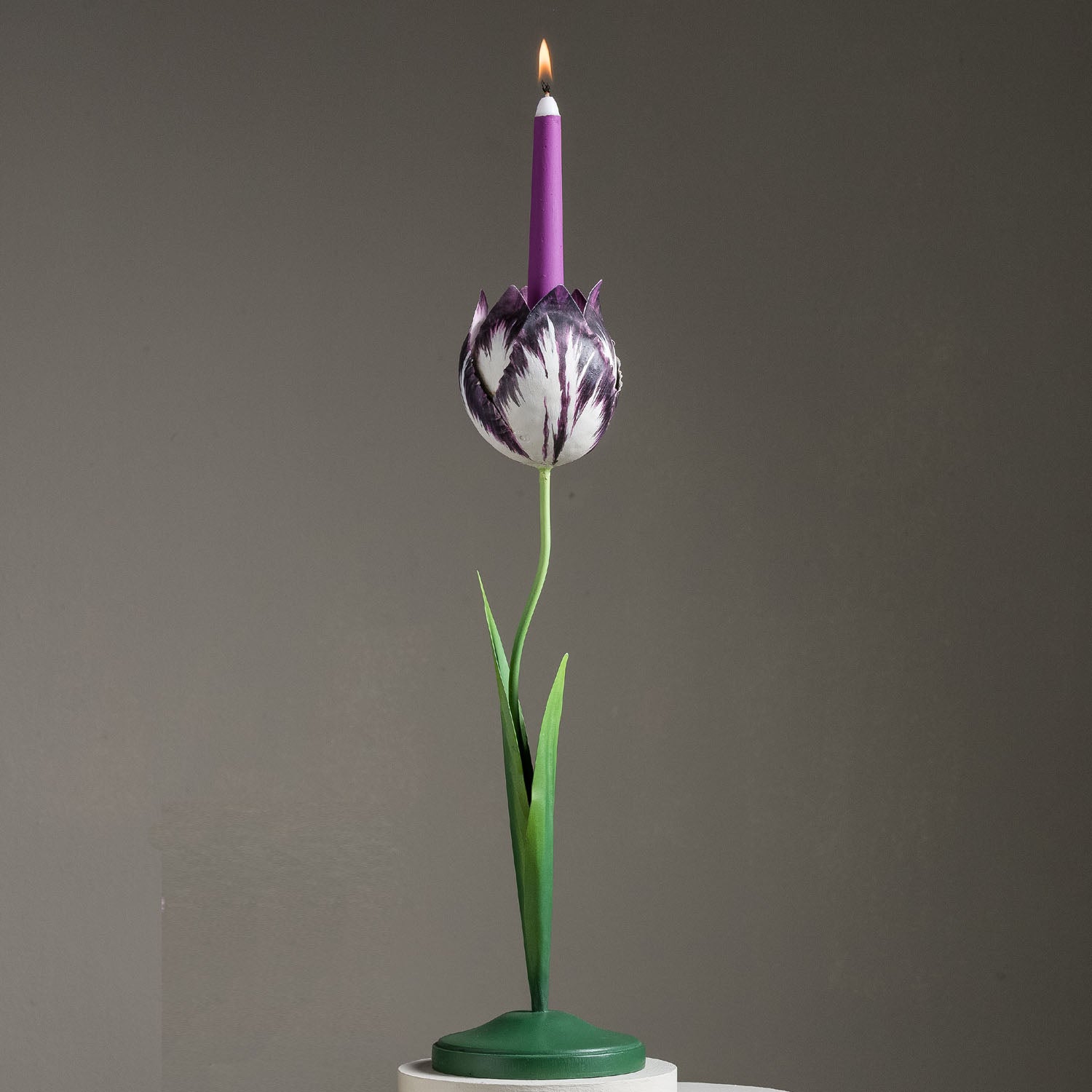 TULIP CANDLEHOLDER 12", WHITE/ PURPLE - 4"L x 4"W x 14"H / Handpainted - Purple White Green / Hand embossed metal with resin accents is backordered and will ship as soon as it is back in stock.