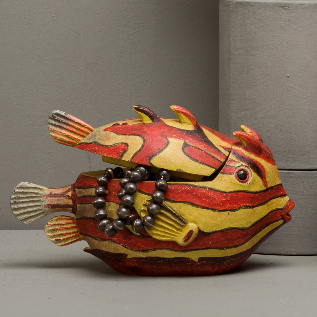 Our puffer fish are inspired by the sea life engravings and illustrations of Enlightenment era naturalists. We developed the richly detailed illustrations into three dimensional objects that make fabulous accent pieces. This vibrantly colored box is a lovely way to store key fobs and other small objects out of sight but close at hand.