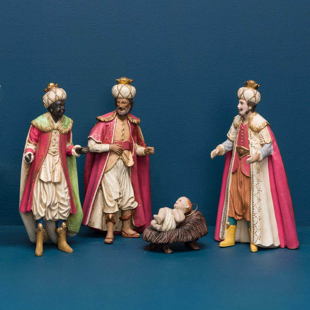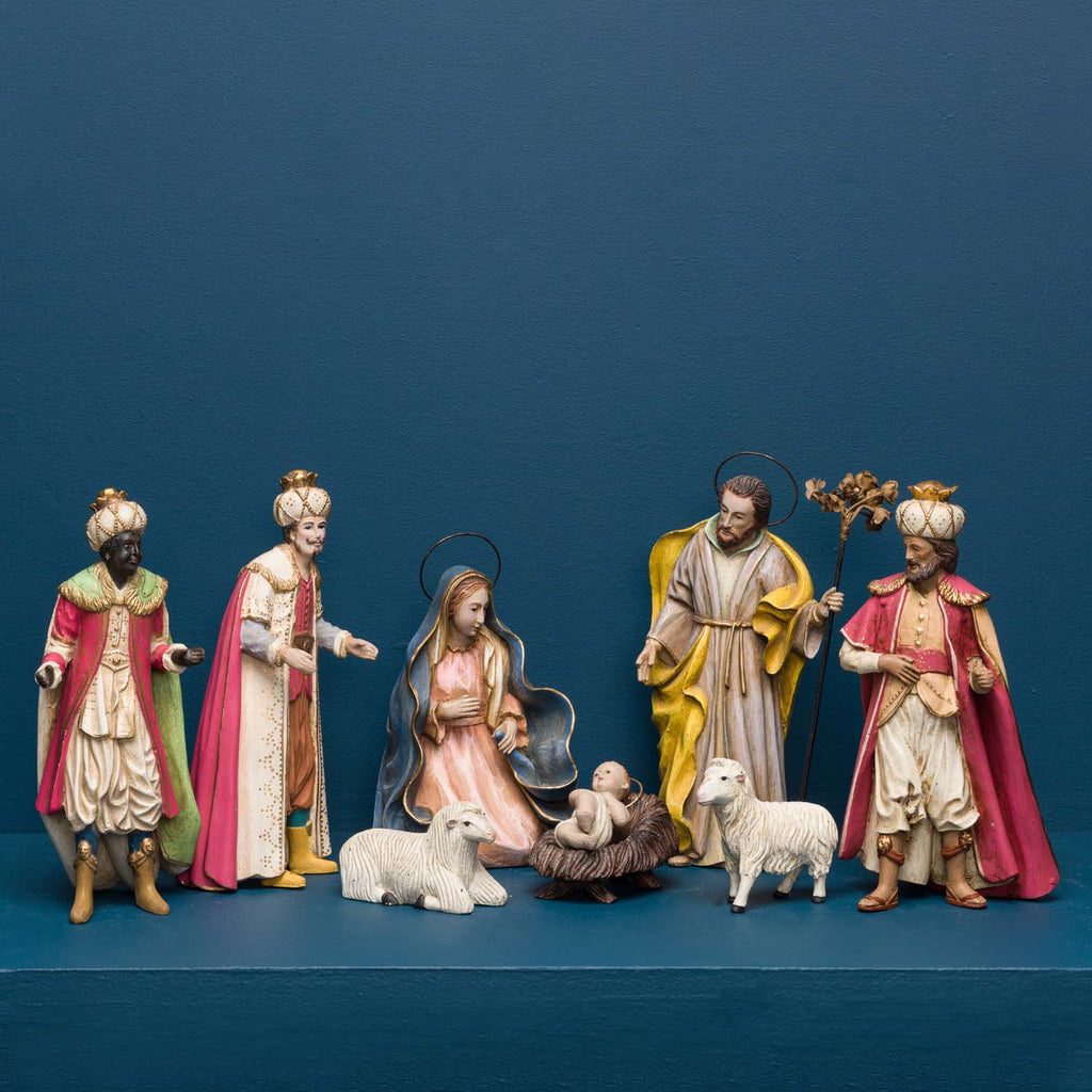 Inspired by Neopolitan creches from the 18th century this nativity is a true showstopper. Wonderfully detailed and richly hand painted the set has 16 heirloom quality figurines including the Holy Family and wise men. Each piece is cast from a wooden master mold sculpted by our master carvers. Quantities are very limited so don't miss this chance to bring our version of Baroque artistry home!