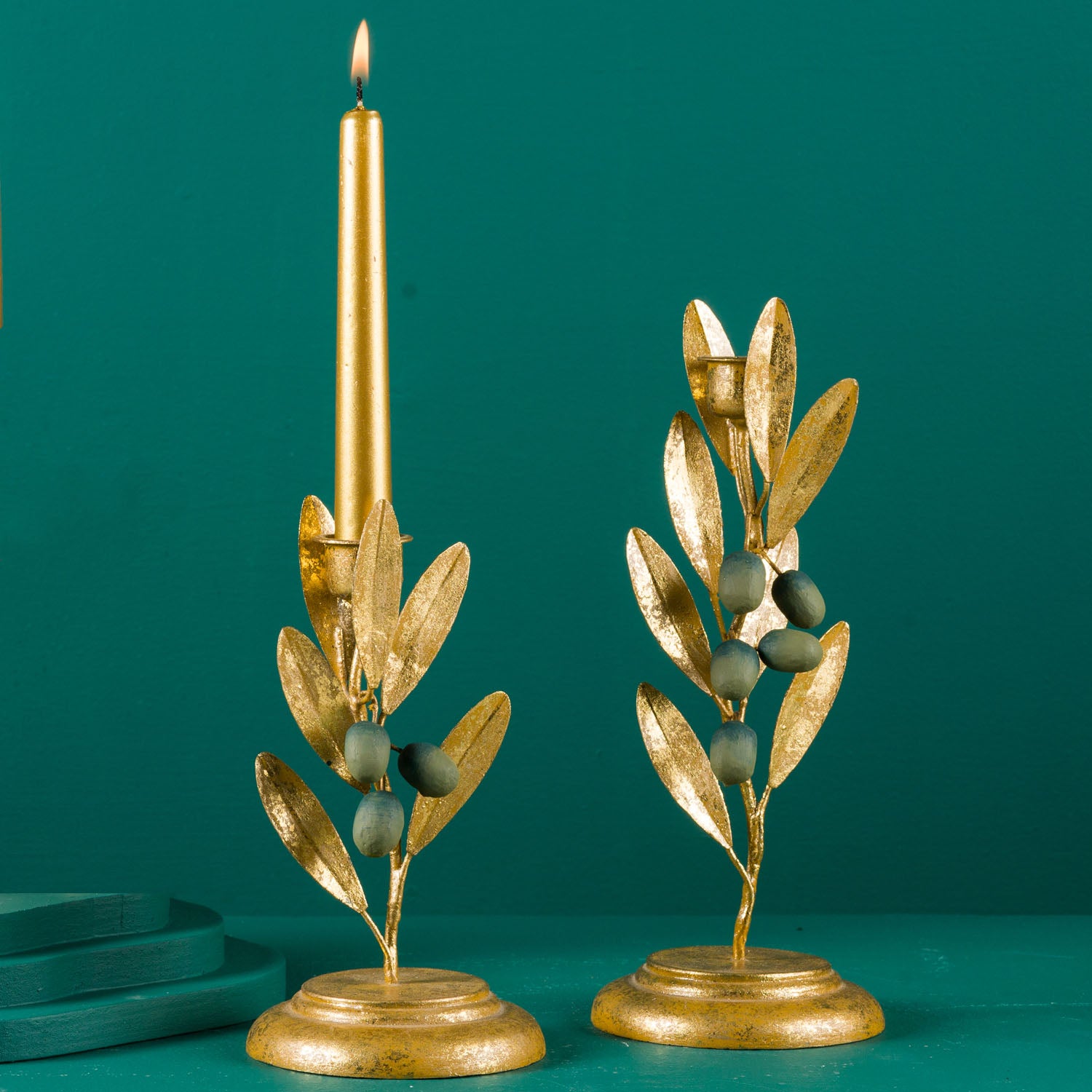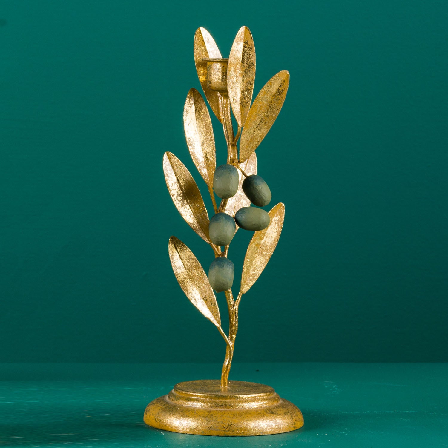 OLIVE STAKE CH 8", GOLD - 3.50"L x 3.50"W x 9"H / Gold Green / Hand embossed metal with resin accents is backordered and will ship as soon as it is back in stock.