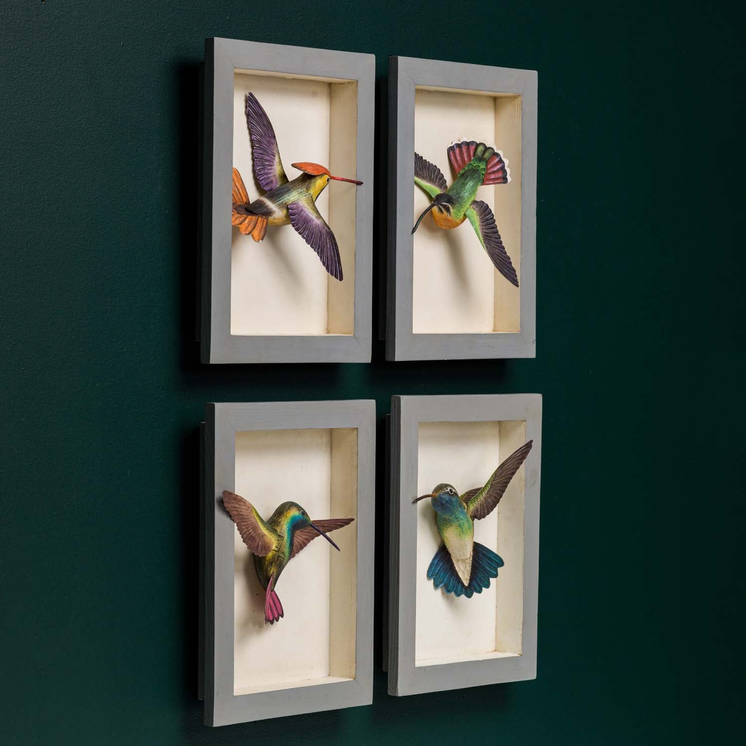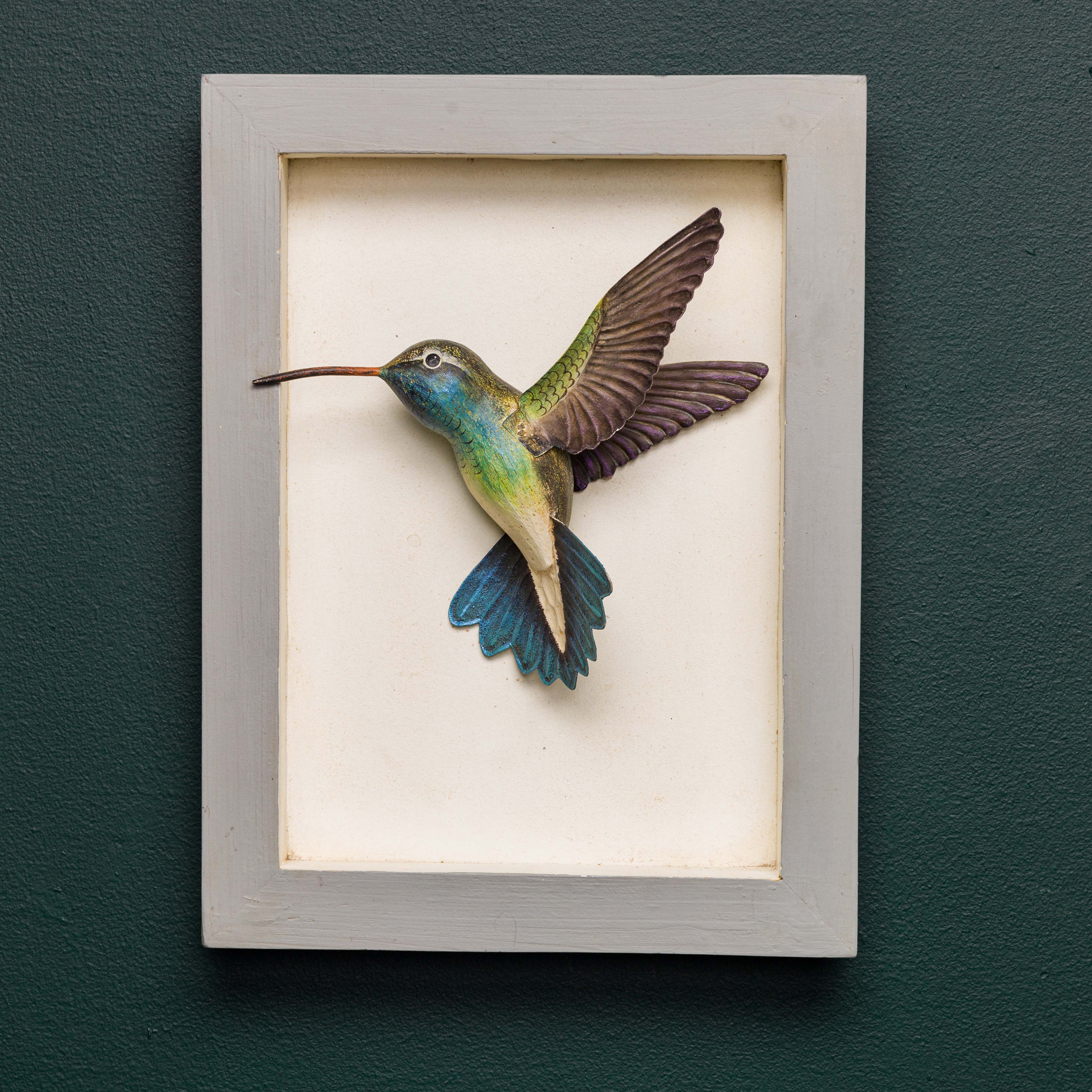 Hummingbirds are wonderful and swift moving avian delights. We have captured them mid-flight in these framed wall decor. Each bird is meticulously hand painted and features hand-embossed metal details. Display one or collect all four styles for an impactful presentation.