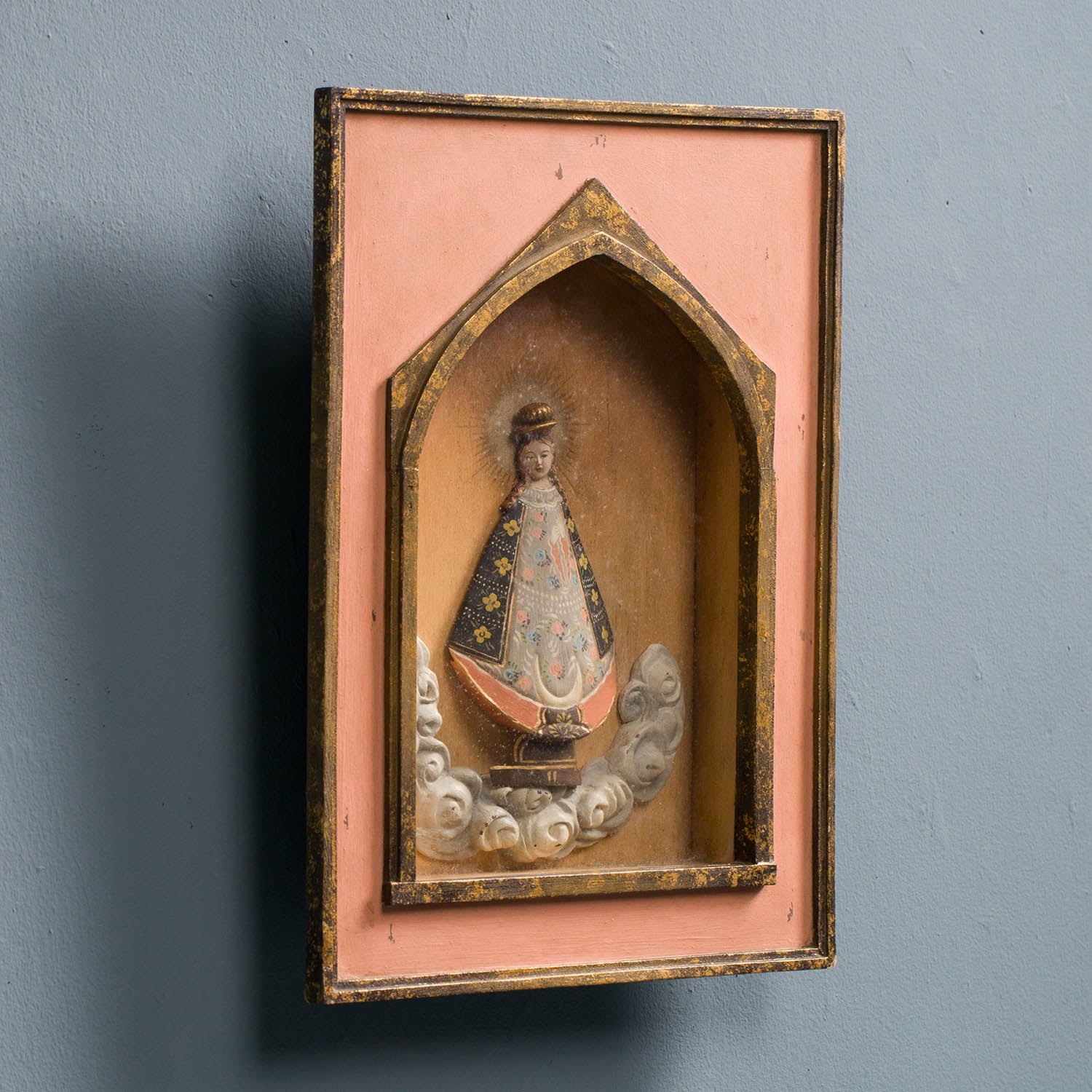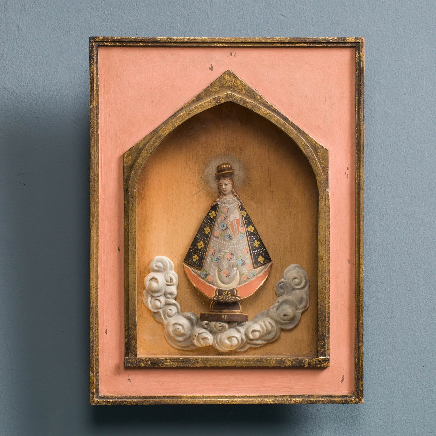Our framed Nuestra Senora Guadalupe floats gracefully atop a cloud while gazing serenely past the viewer. She is ensconced in a stunning wood frame with gilt detailing.