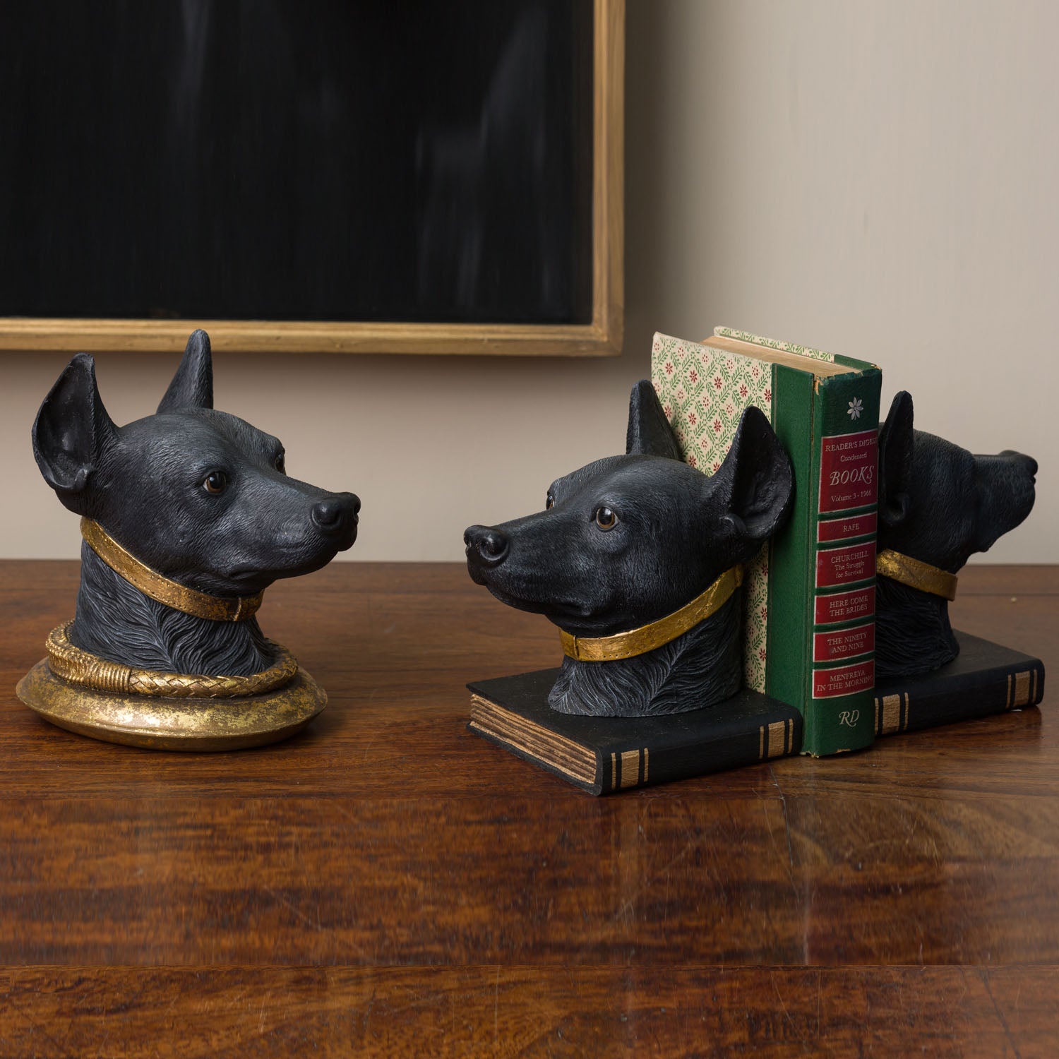 DOBERMAN PINCHER BOOKENDS - 12.25"L x 5"W x 7"H / Handpainted - Black Gold Brown / Hand cast resin with wood accents is backordered and will ship as soon as it is back in stock.
