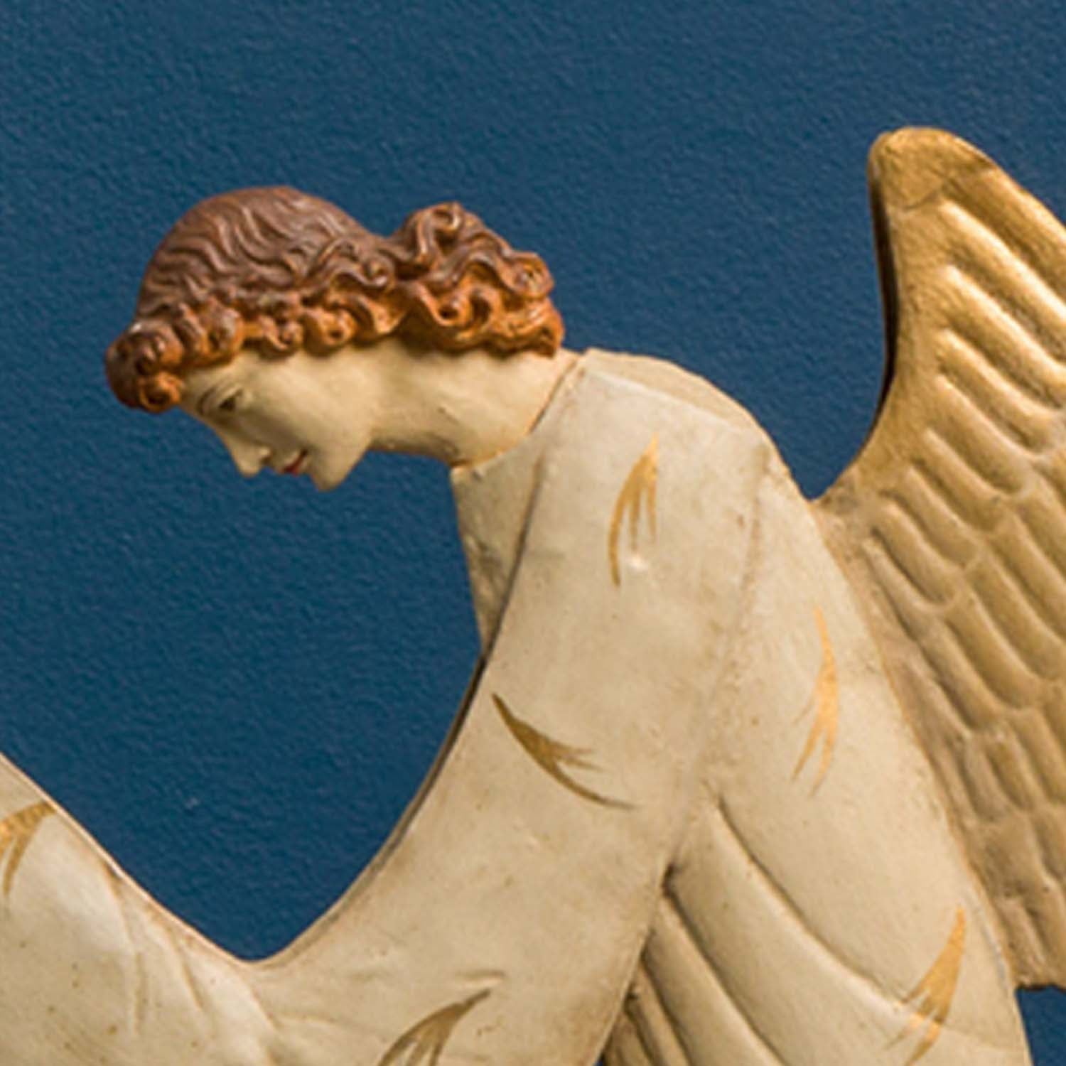 Our Reini Angel is evocative of angels depicted in Italian Early Renaissance frescoes. With its contemplative pose and detailed repoussé wings and robes this items would be a lovely addition to a holiday display or year round home altar.