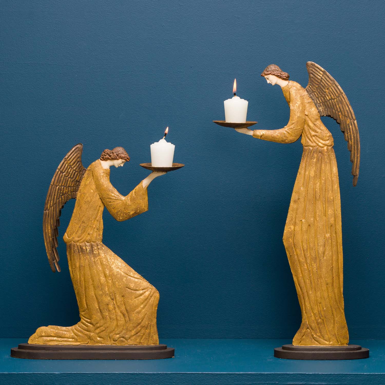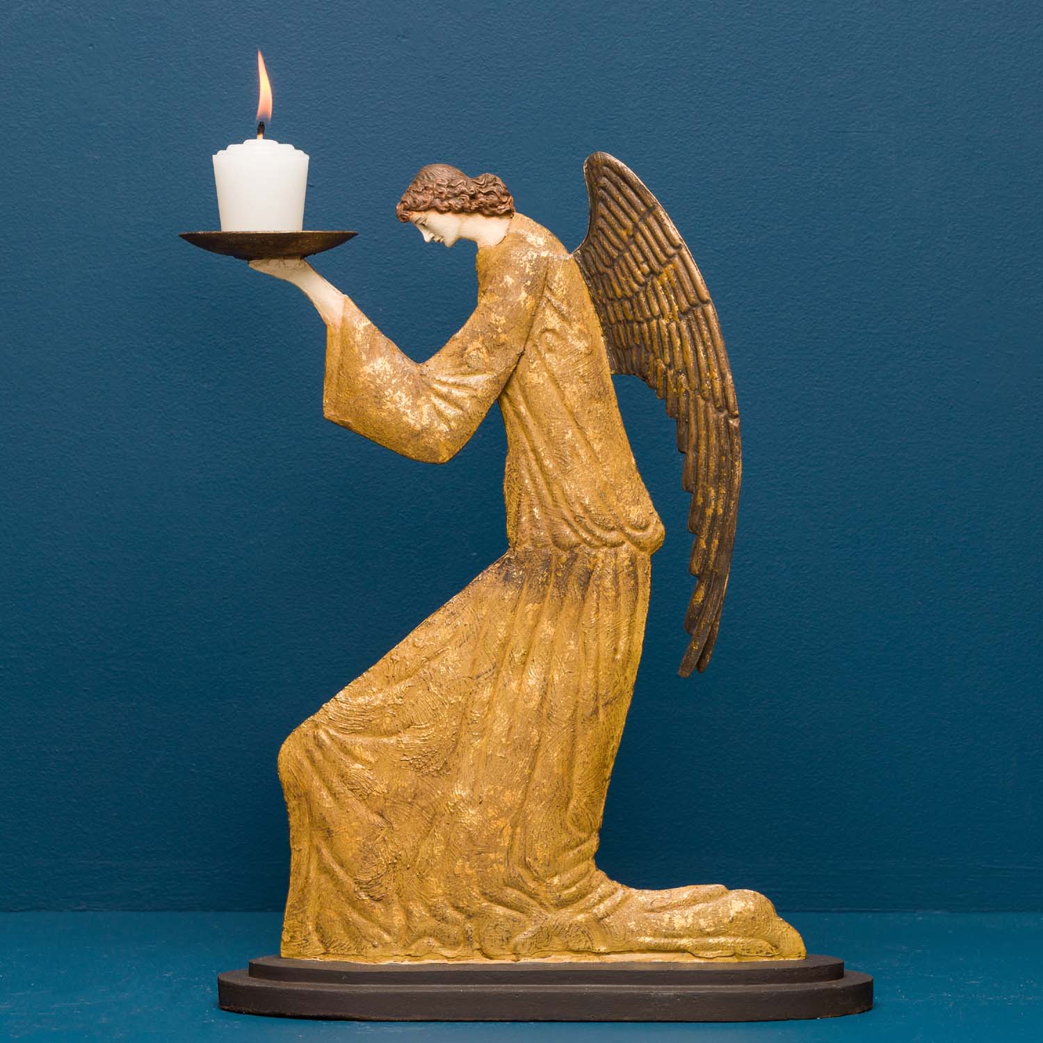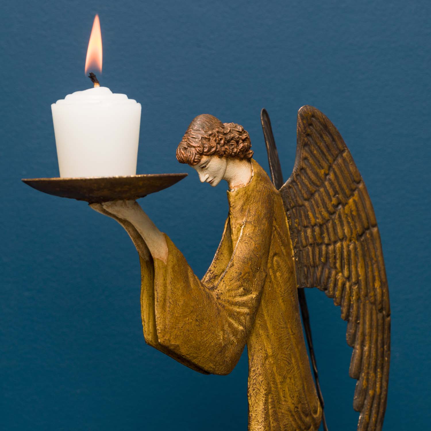 Our Reini Angel is evocative of angels depicted in Italian Early Renaissance frescoes. With its contemplative pose and detailed repoussé wings and robes this items would be a lovely addition to a holiday display or year round home altar.