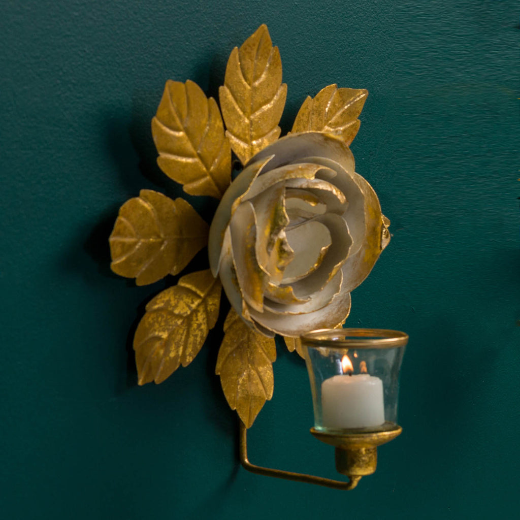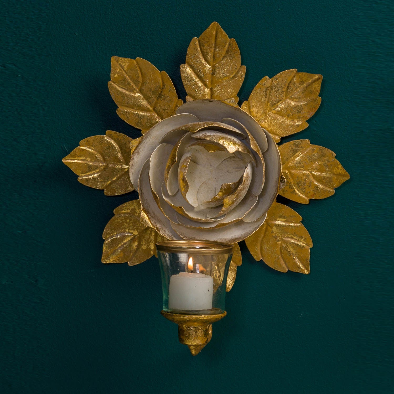 ROSE SCONCE., WHITE & GOLD - 9"L X 4.75"W X 10"H / Handpainted - White Gold / Hand embossed metal is backordered and will ship as soon as it is back in stock.