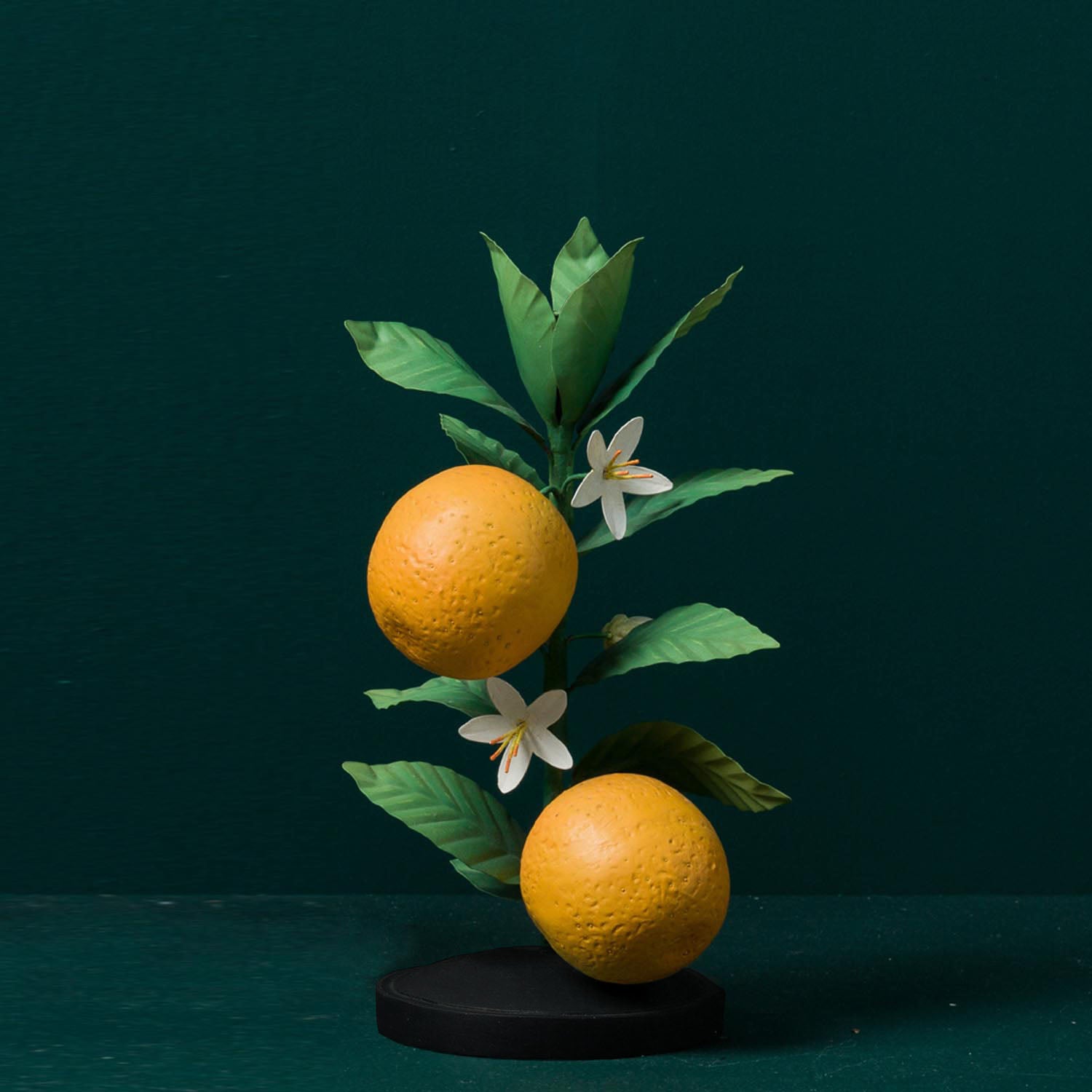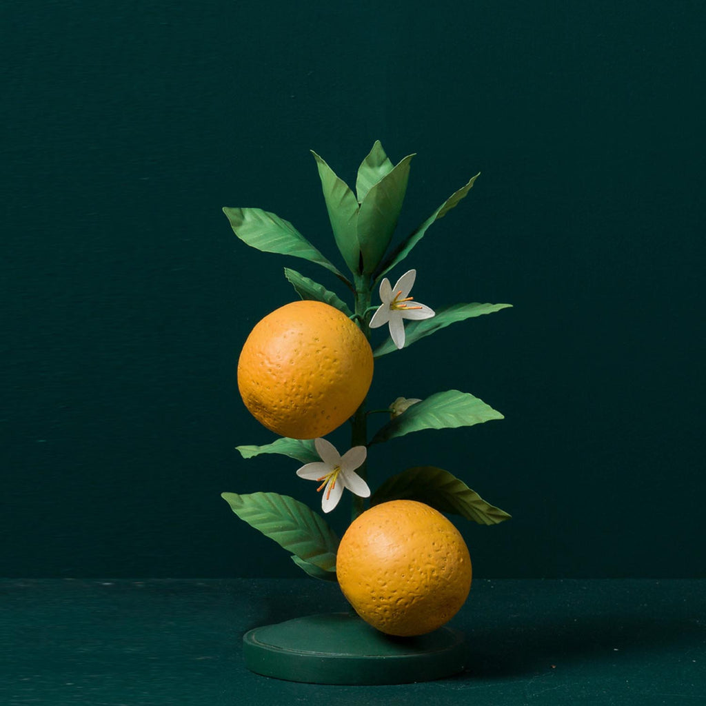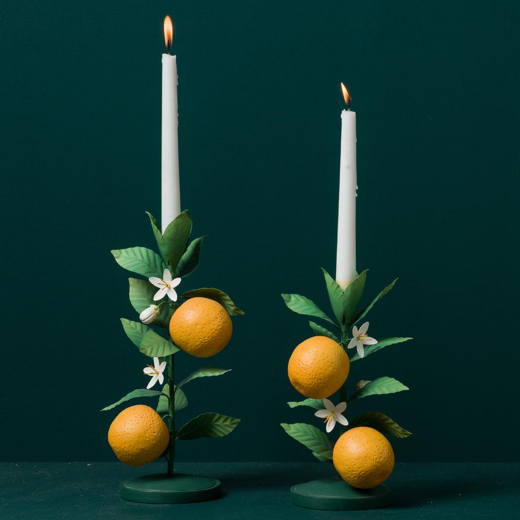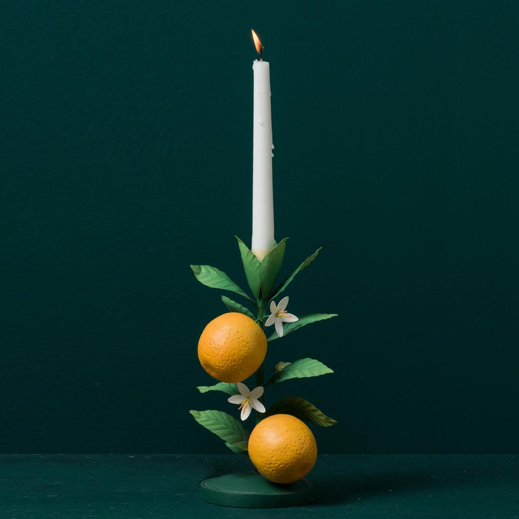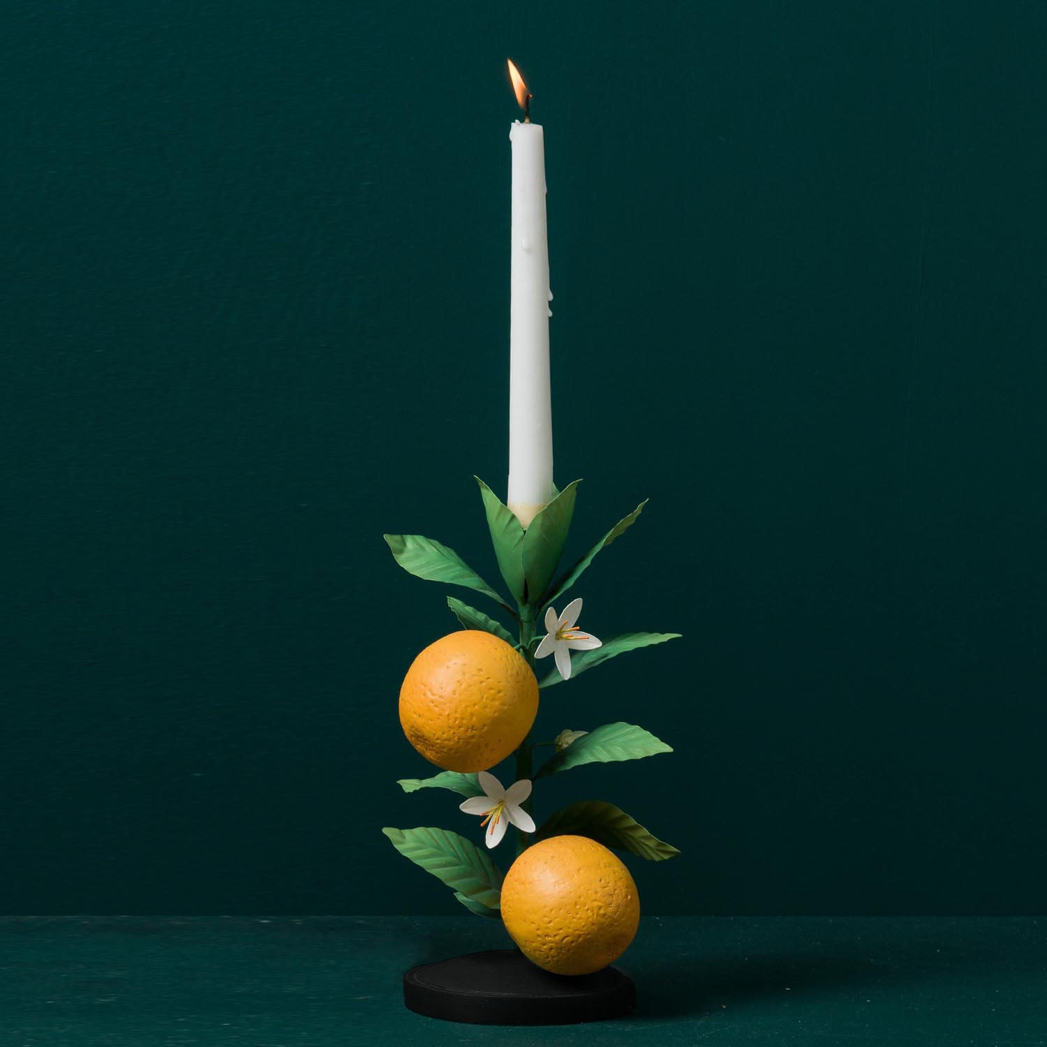 ORANGE CANDLEHOLDER 8" - 5.00"L X 5.00"W X 8.75"H / Handpainted Antique - Orange Green White Black / Hand embossed metal with resin accents is backordered and will ship as soon as it is back in stock.