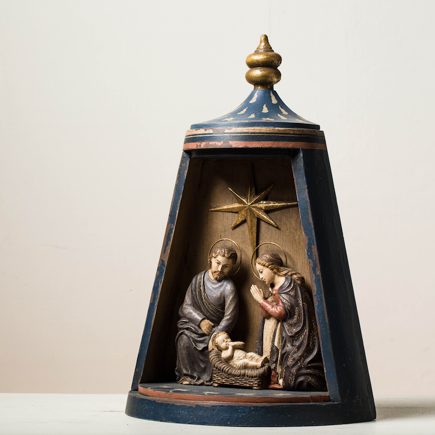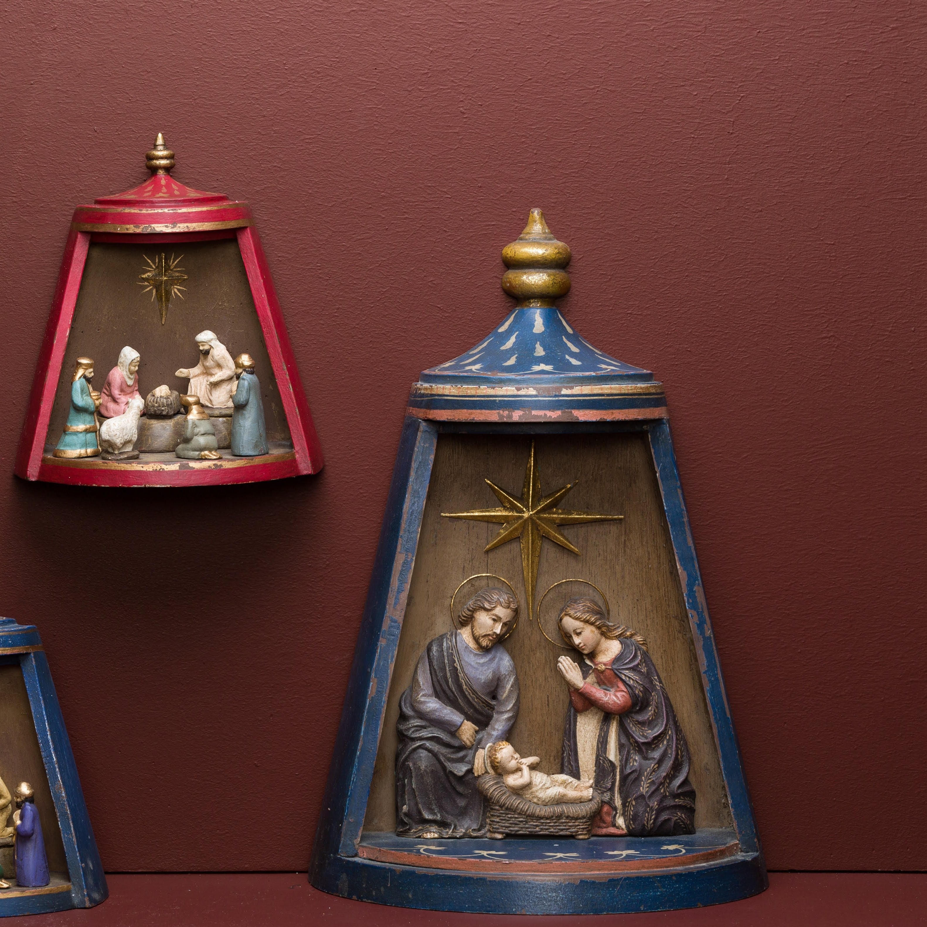 This nativity scene is set in a richly colored frame with a gilt metal star detail in the background. The delightful figures are ensconced in a tent that is evocative of a medieval pavilion. Comes with hanging hardware to allow for display on wall or tabletop.