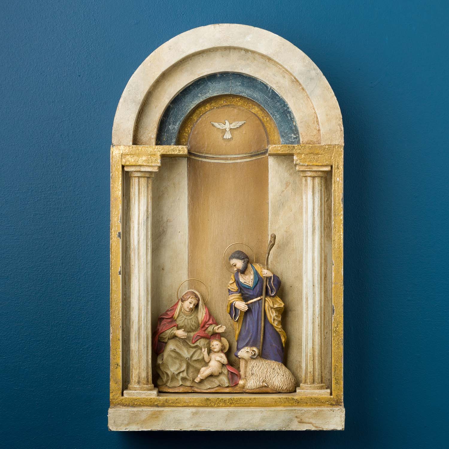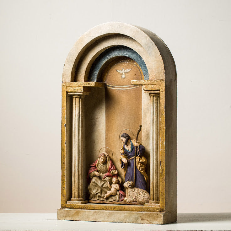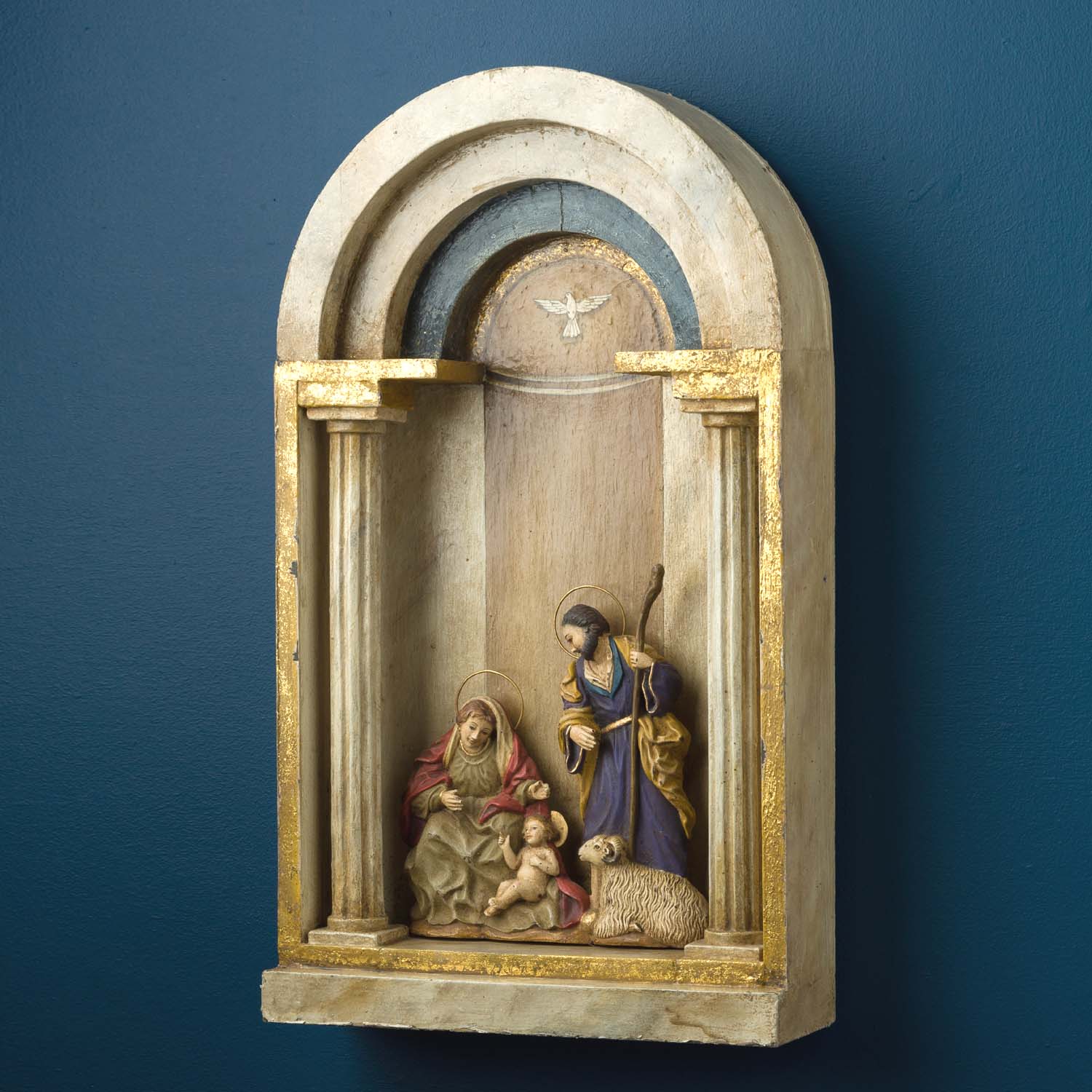 The Saxon Nativity features a bas relief of a delightful scene between the Holy Family. The figures are framed against a classical backdrop. This item can be displayed on a tabletop or mounted on a wall.