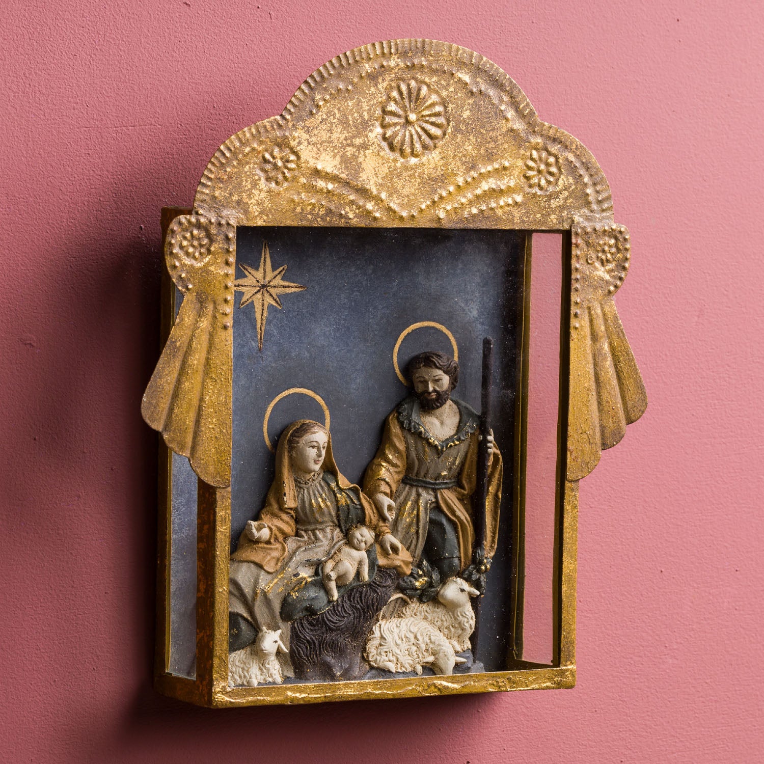 SEBASTIAN HOLY FAMILY IN CONCHA SHADOW BOX - 8.25"L X 1.75"W X 9.5"H / Handpainted - Gold Blue Brown Beige / Hand embossed metal with resin and glass accents is backordered and will ship as soon as it is back in stock.