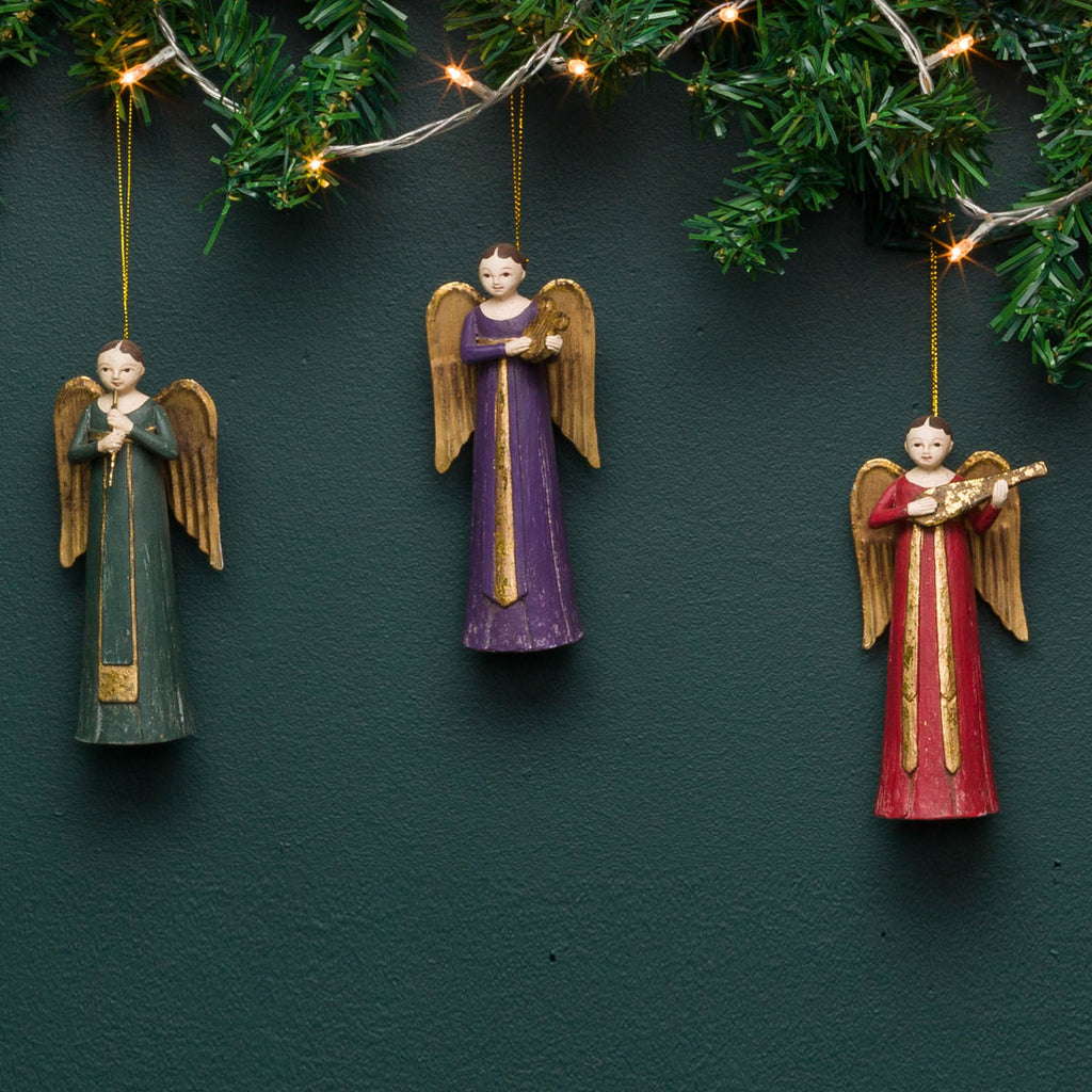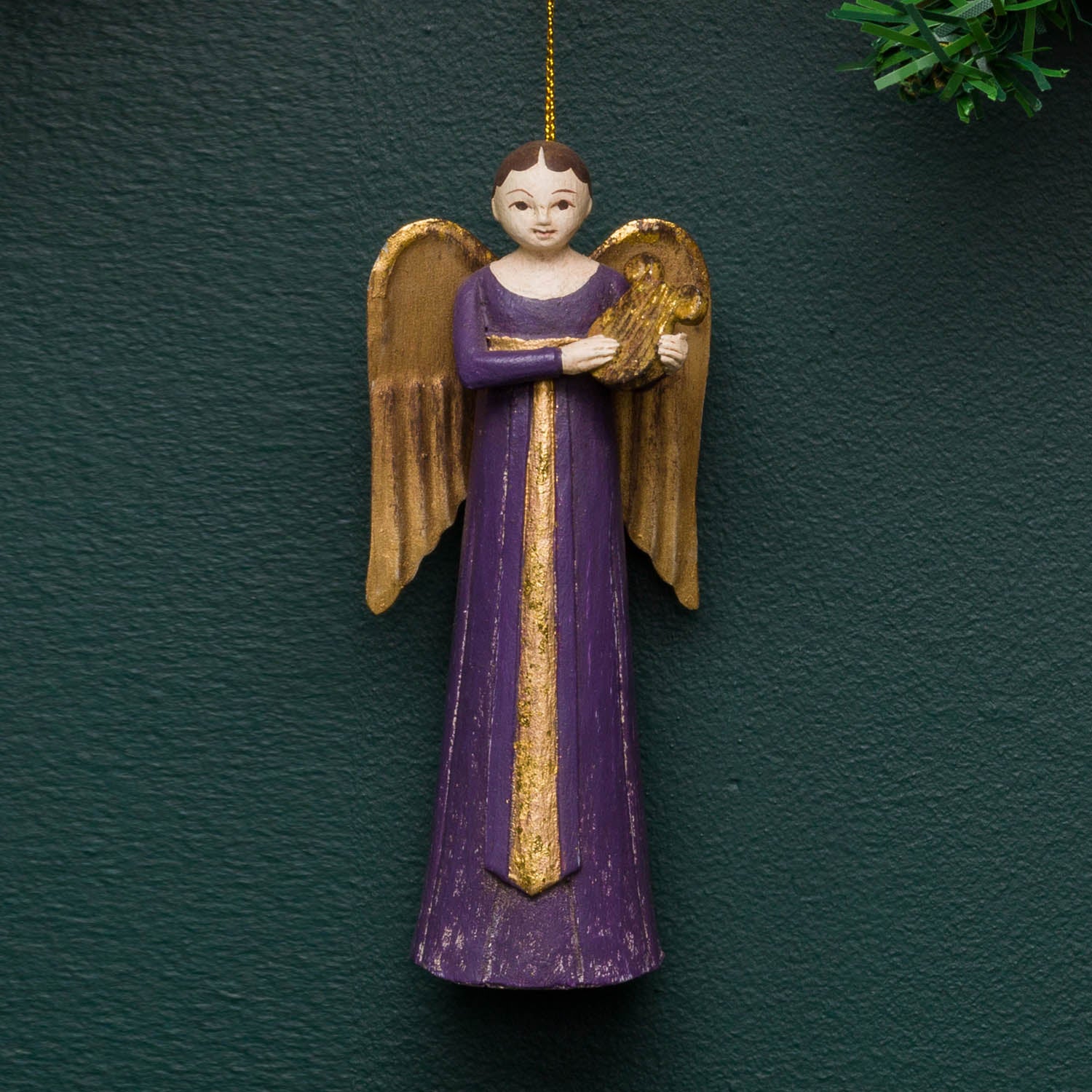 ROSELLIE ANGEL WITH LYRE ORNAMENT, VIOLET - 2"L X 1.50"W X 5.25"H / Handpainted - Violet Beige Gold / Hand cast resin; Hand embossed metal is backordered and will ship as soon as it is back in stock.