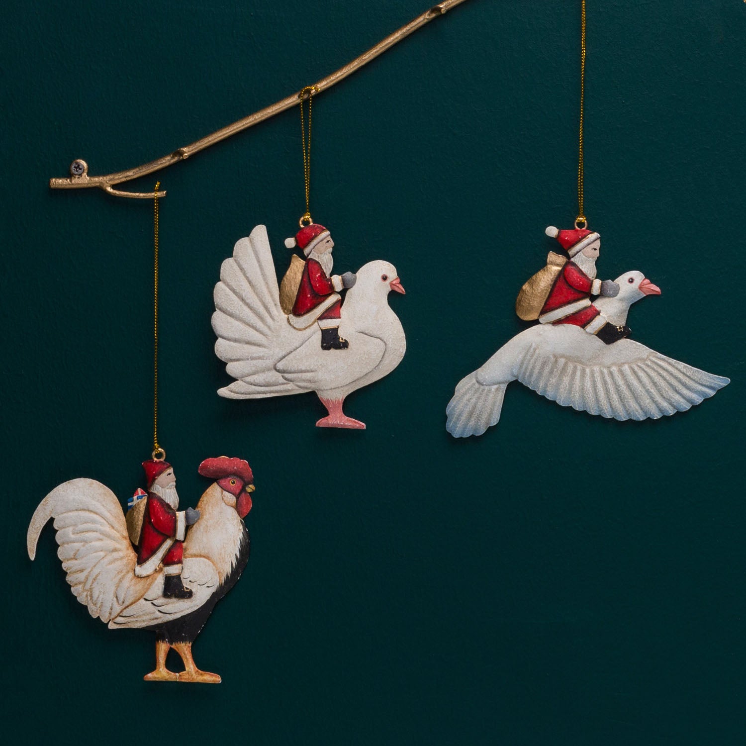 SANTA ON FANTAIL DOVE ORNAMENT - 4"L x 0.188"W x 4.25"L / Handpainted - Beige Red Pink Gray Gold / Hand embossed metal is backordered and will ship as soon as it is back in stock.