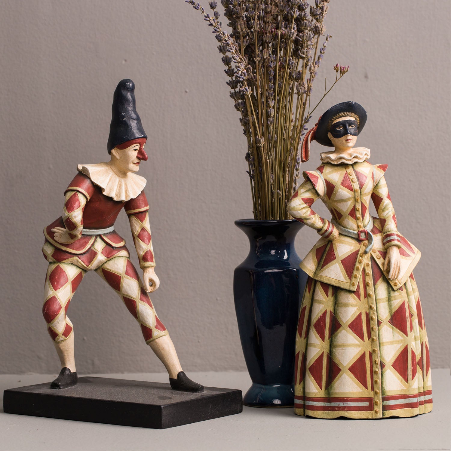 Commedia Dell’arte was a highly popular form of improvised comedy in Italian theaters in the 16th-18th centuries featuring stock characters with distinctive masks and costumes. Our collection brings these beloved characters to life. The master mold for every character was hand carved by our master carver. Each piece is hand painted in a polychrome and antique finish.