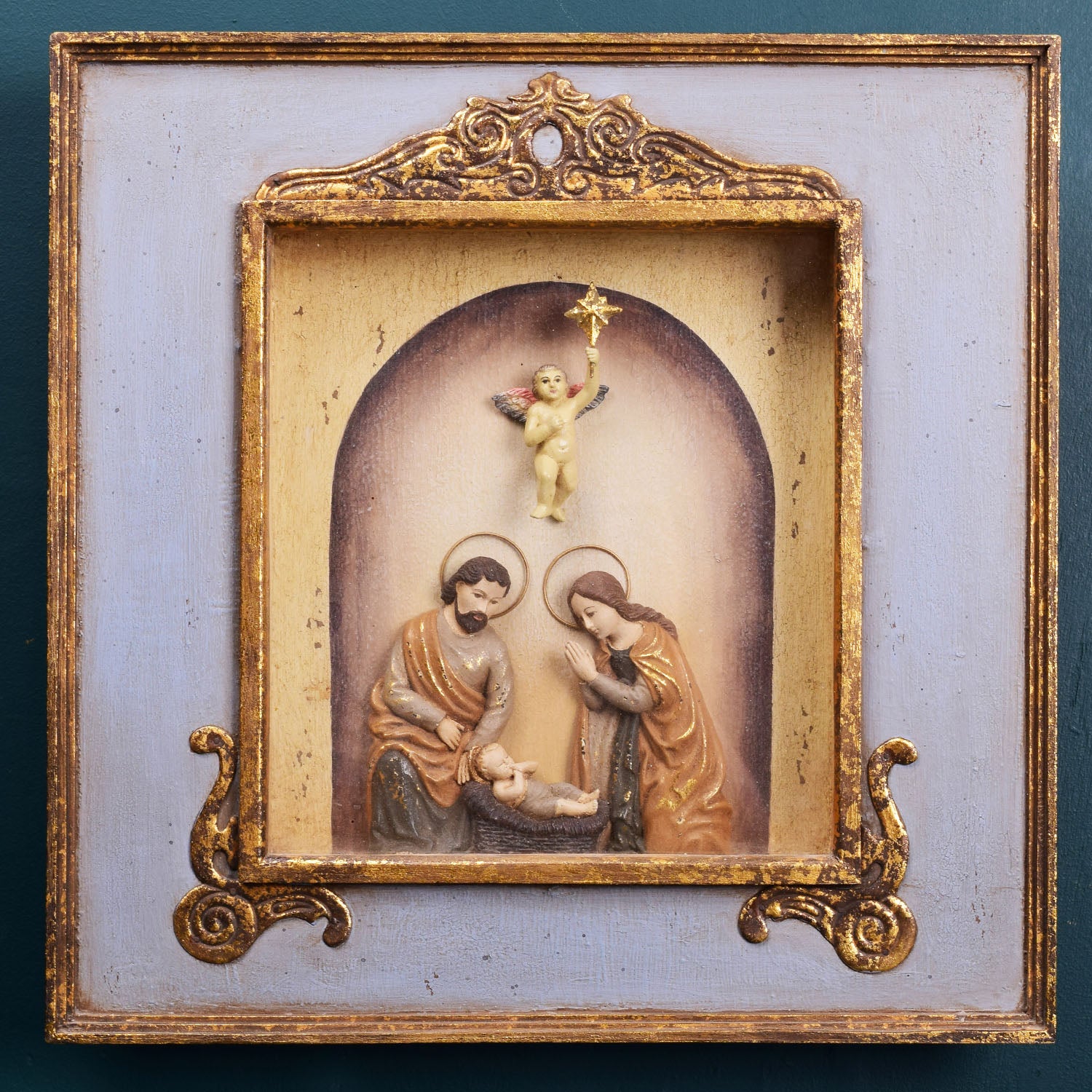 FRAMED FLANDER HOLY FAMILY - 16"L x 2.50"W x 16"H / Hand painted Blue Cream Gold Brown / Hand embossed metal with wood paper mache glass and resin is backordered and will ship as soon as it is back in stock.