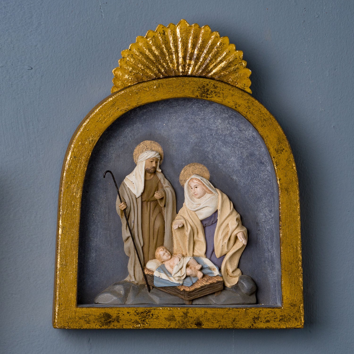 BAS RELIEF OVIEDO NATIVITY - 8.125"L X 1.25"W X 10"H / handpainted - Gray Gold Pink Brown Beige / Hand cast resin with metal accents is backordered and will ship as soon as it is back in stock.