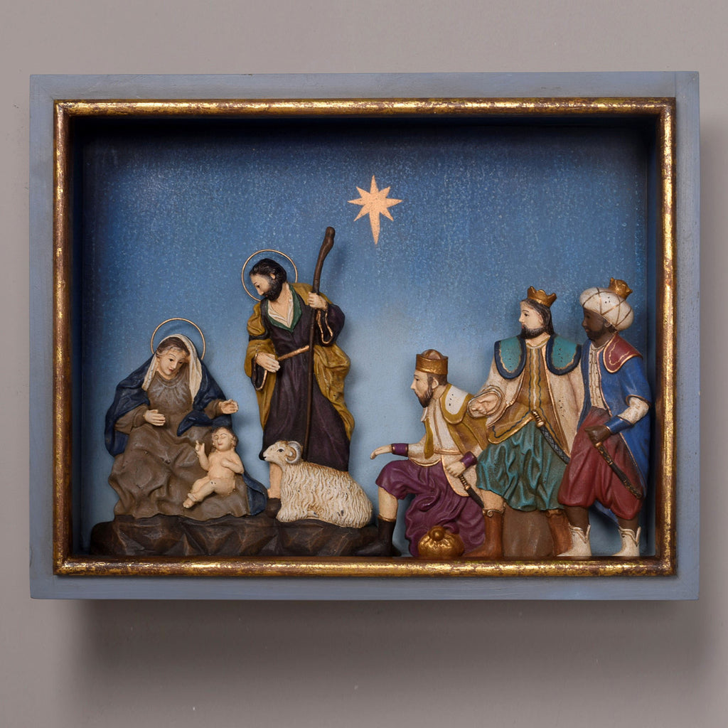 FRAMED AQUALONIA NATIVITY - 16"L x 3.50"W x 12.50"H / Blue Gold Multi Colors / Hand cast resin with wood accents is backordered and will ship as soon as it is back in stock.