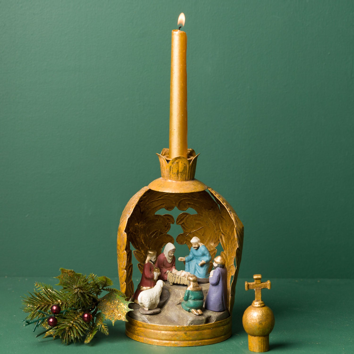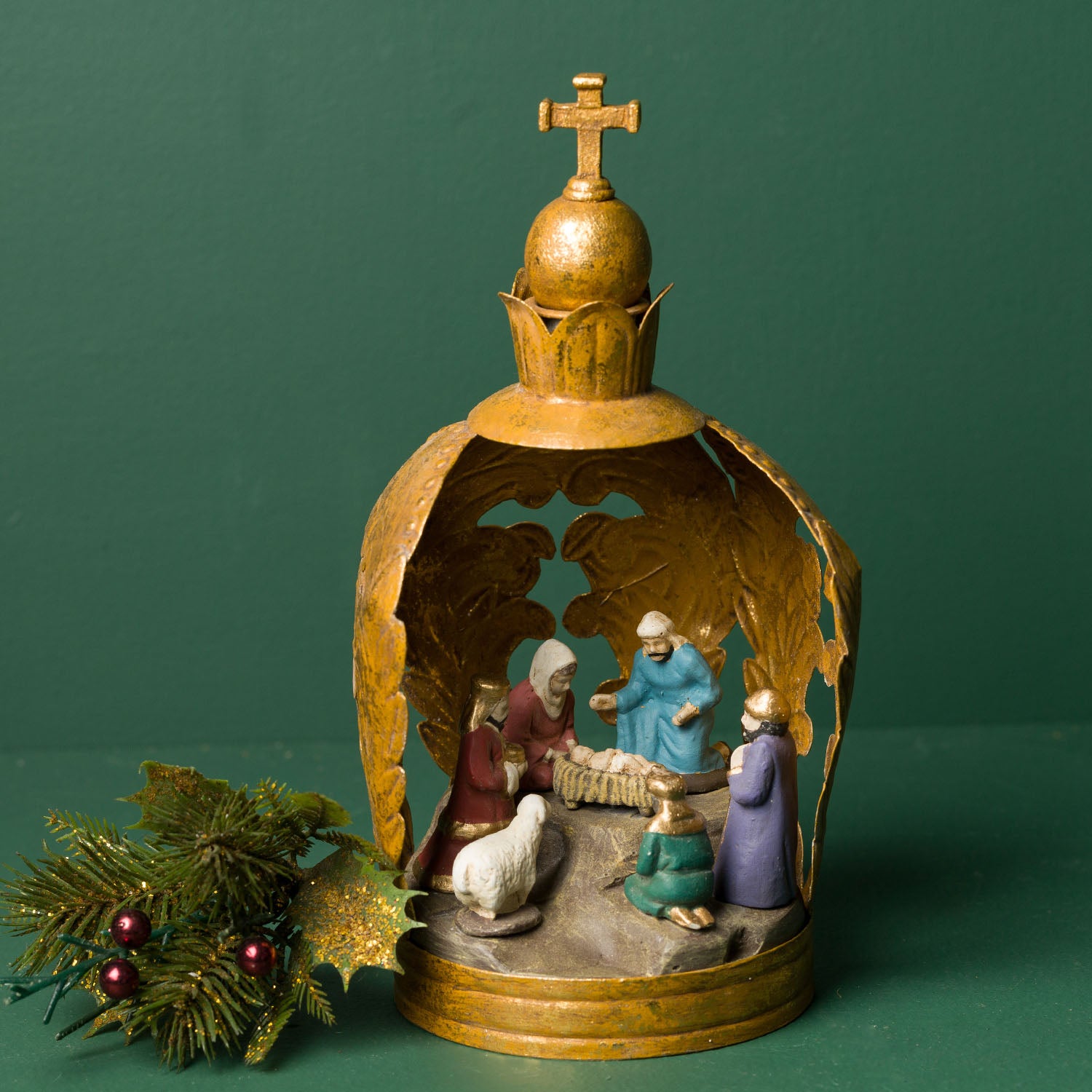 MINI NATIVITY IN CROWN CANDLEHOLDER - 4.75"L x 4.25"W x 9"H / Handpainted - Gold Multicolor / Hand embossed metal with resin accents is backordered and will ship as soon as it is back in stock.