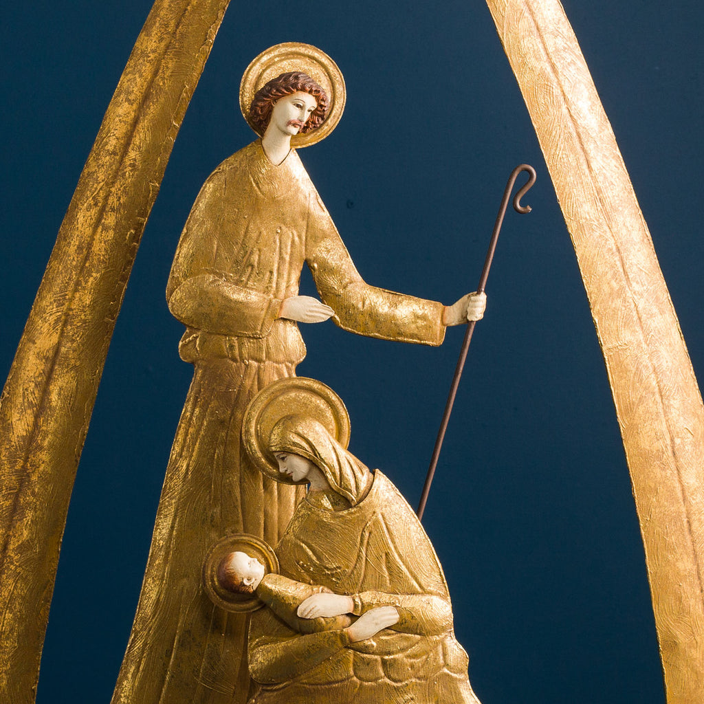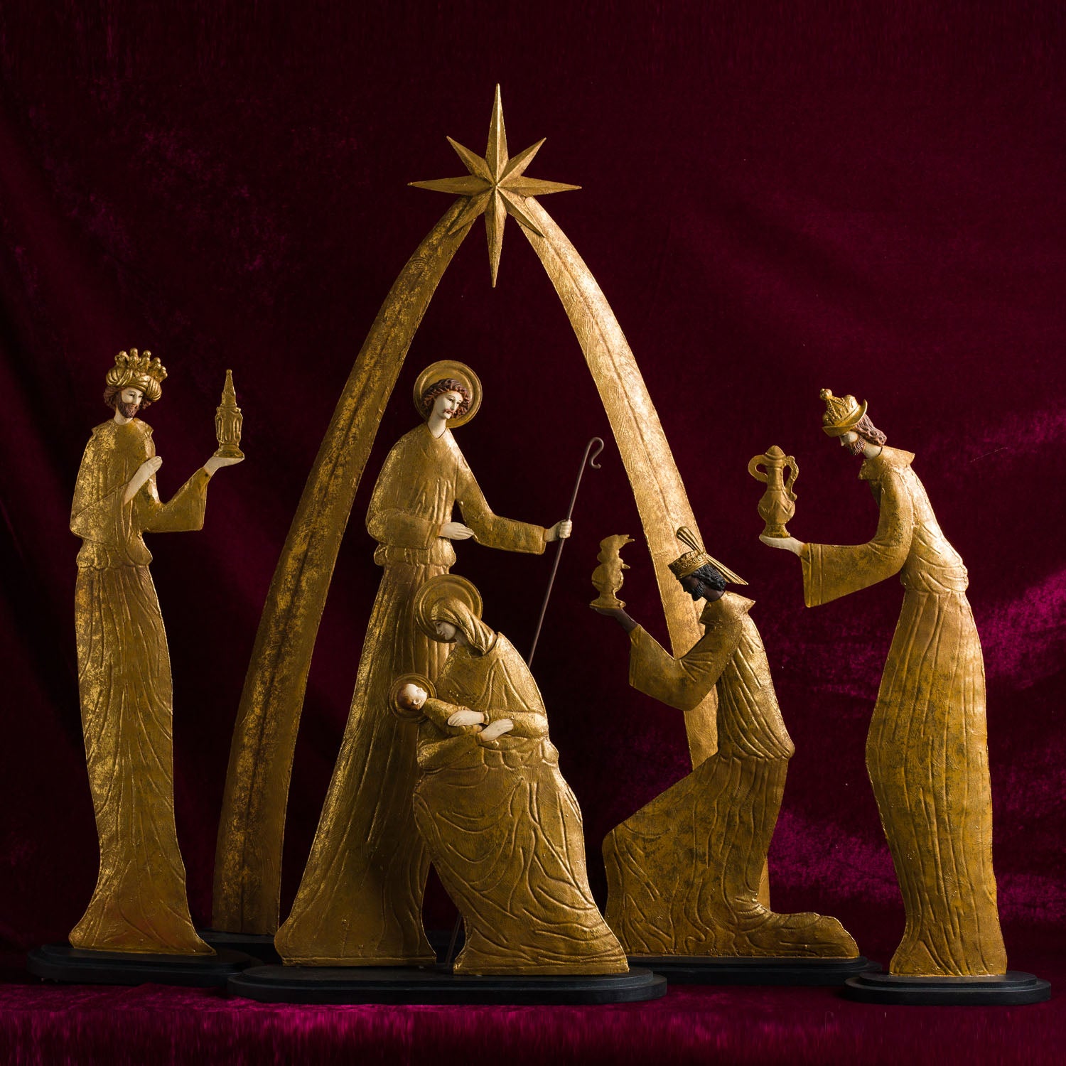 PIERRE NATIVITY WITH THREE KINGS - 37"L x 10"W x 31.50"H / Hand painted Gold Black Brown Beige / Hand embossed metal with resin and wood accents is backordered and will ship as soon as it is back in stock.