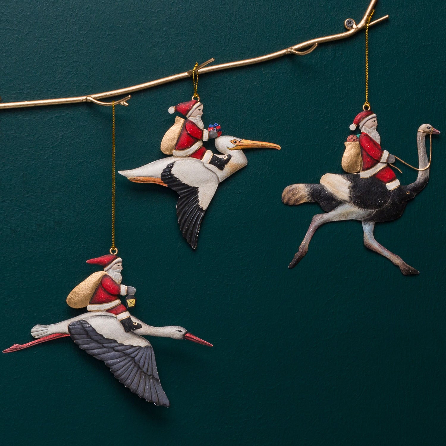 SANTA ON FLYING STORK ORNAMENT - 7"L x 0.188"W x 5.125"H / Handpainted - Beige Gray Red Gold / Hand embossed metal is backordered and will ship as soon as it is back in stock.