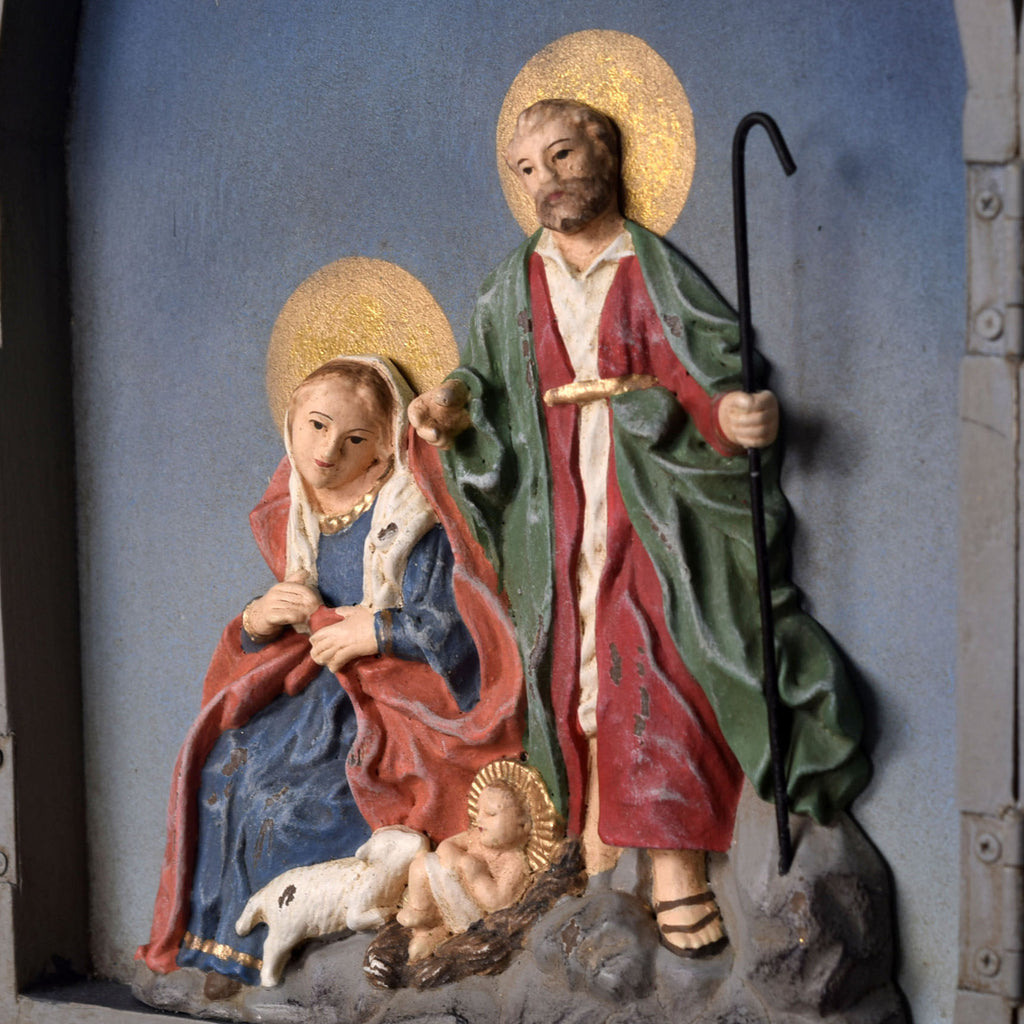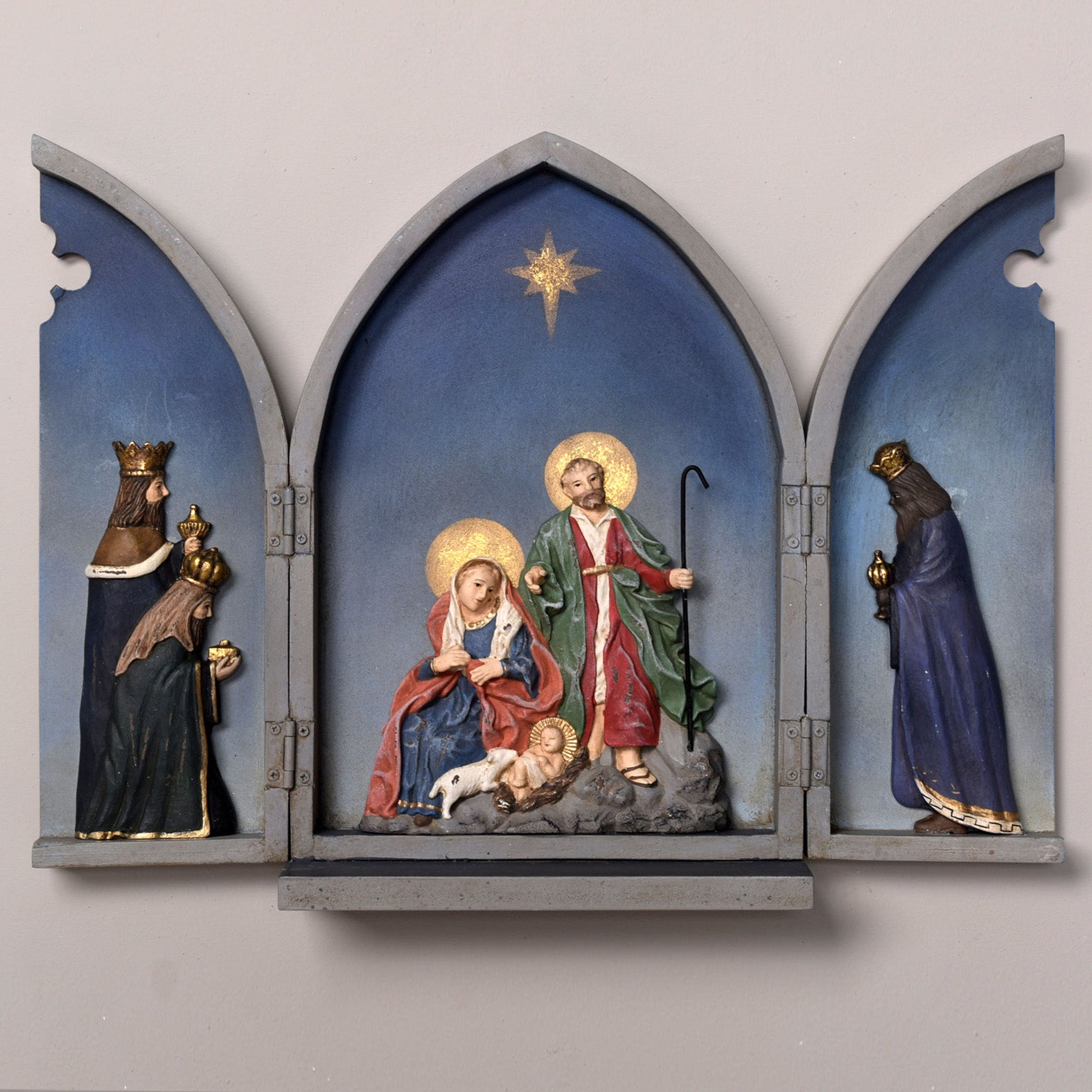 SEBASTIAN NATIVITY TRYPTICH - 12.50"L x 2.13"W x 11.50"H / Gray Gold Blue Red Brown / Hand cast resin with wood and metal accents is backordered and will ship as soon as it is back in stock.