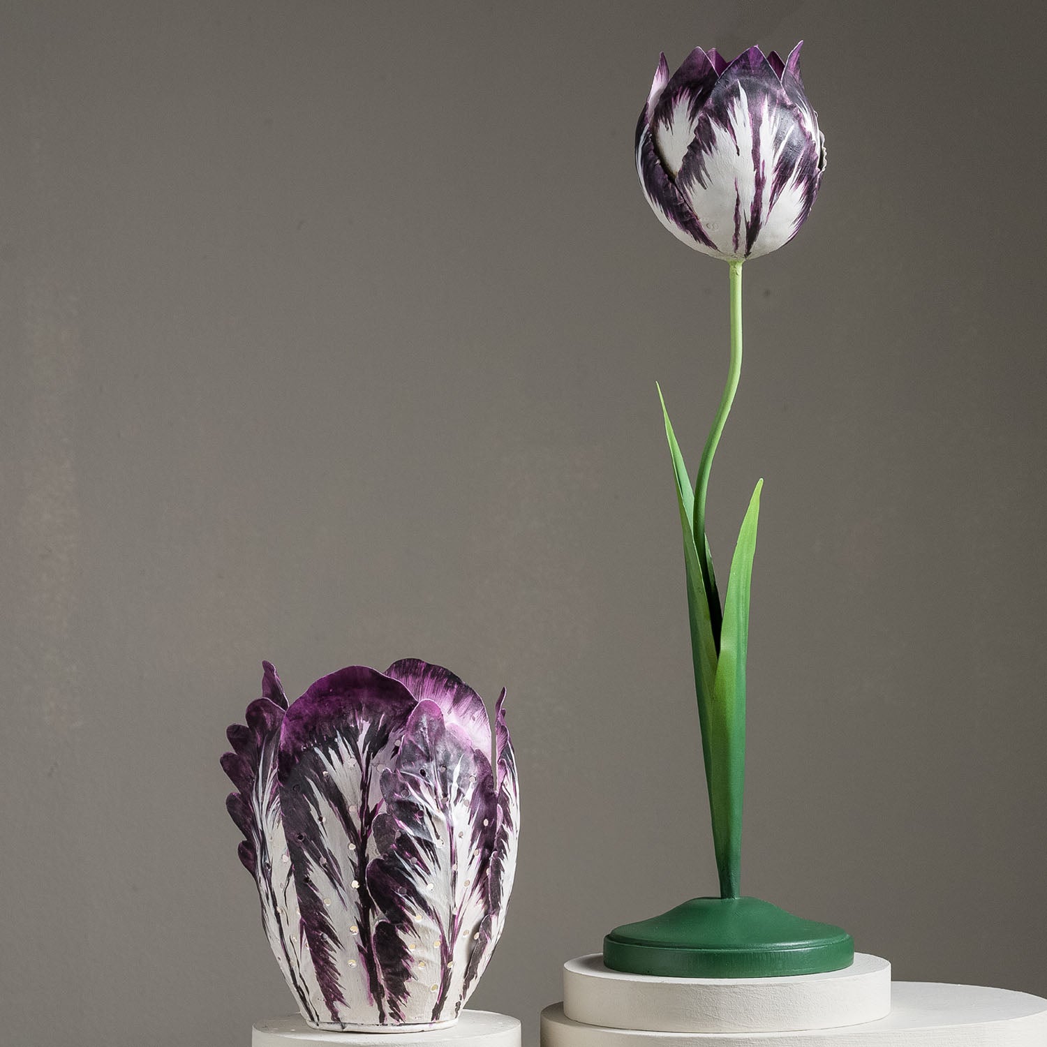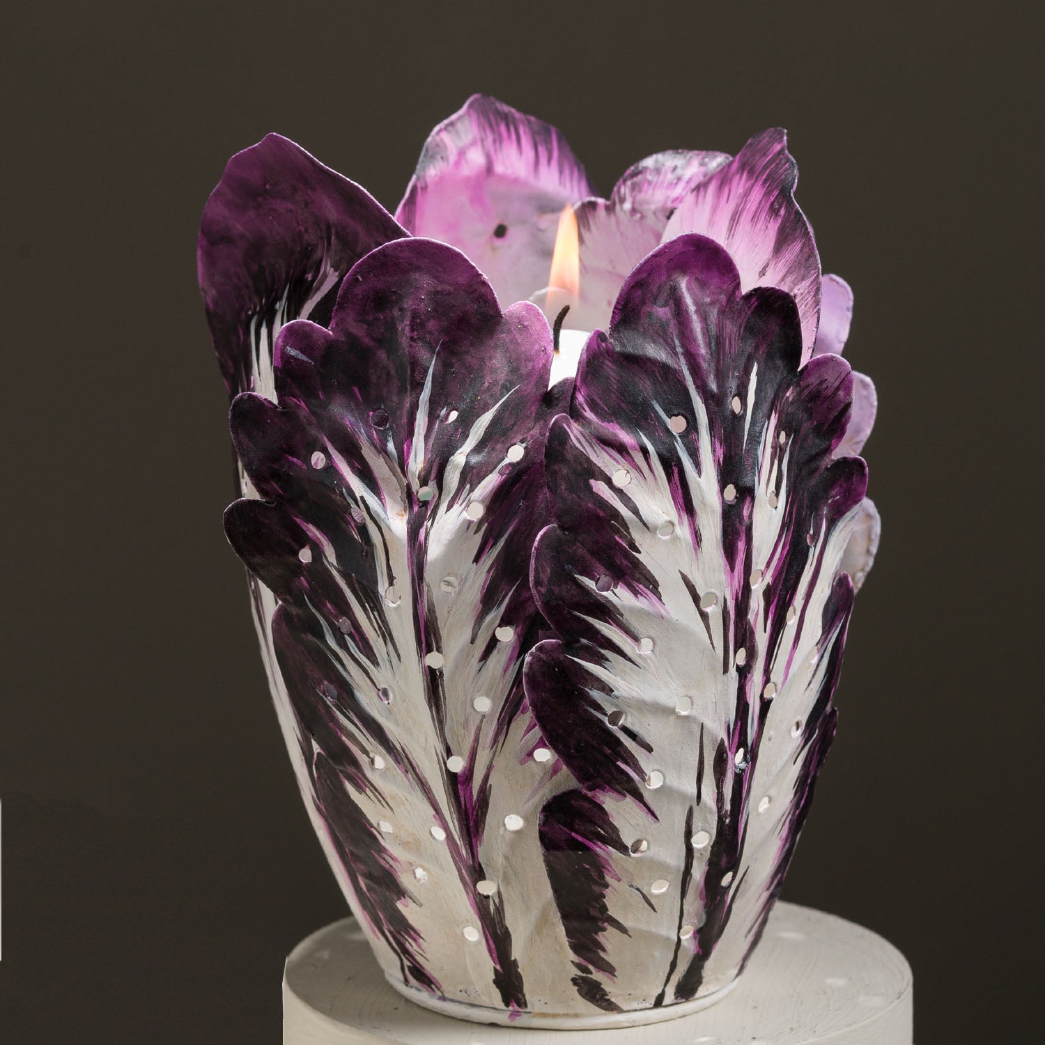 TULIP VOTIVE TEALIGHT HOLDER - 4"L x 4"W x 5.50"H / Handpainted - Purple White / Hand embossed metal is backordered and will ship as soon as it is back in stock.